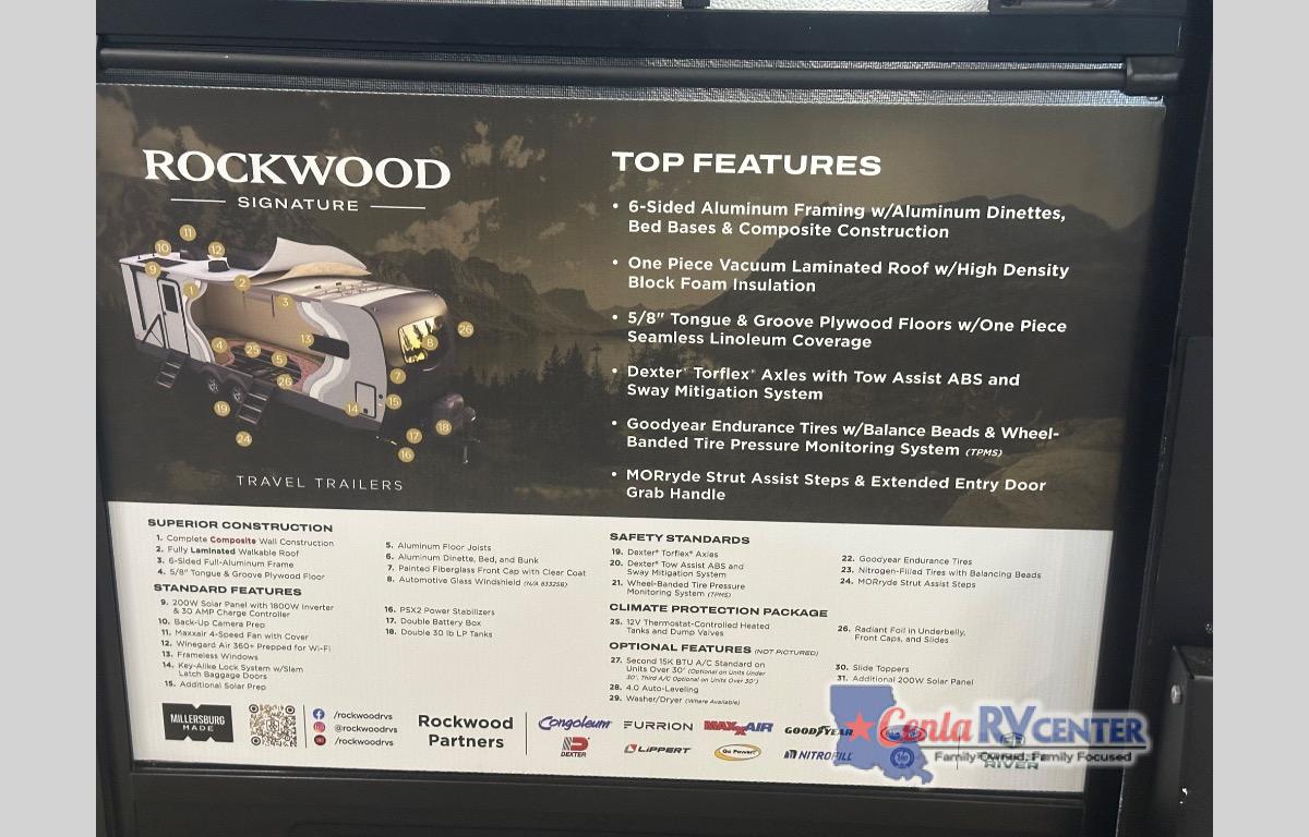 With any Rockwood Signature fifth wheel or travel trailer by Forest River RV, you will enjoy superior construction that includes a fully laminated walkable roof, 6-sided full-aluminum frame, and a painted fiberglass front cap with Clear Coat for added durability. Outside, you'll find a 200W solar panel for off-grid capabilities, slam baggage doors, and Key-Alike lock system for added convenience. Head inside to find soft close roller bearing drawers, roller shades, and residential style gas range. These travel trailer and fifth wheels also feature Goodyear Endurance tires with a tire pressure monitoring system plus Dexter Torflex torsion axles for smooth towing!