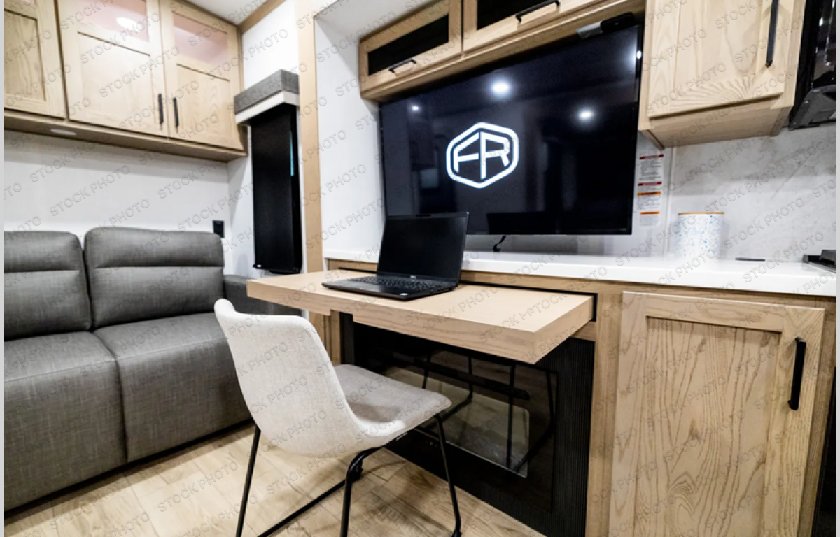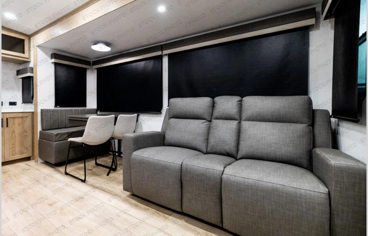 You'll love every minute spent in this front kitchen travel trailer! There is ample counter space to prep meals, plus a spacious kitchen island with a pull-out trash can. After lunch is made, you can dine at the table with chairs and a bench, or take your plate outdoors to eat under the two power awnings. Once you're back inside, you can relax on the theater seat across from the Smart TV and fireplace, and the hide-a-bed sofa here will provide sleeping space for guests. This unit also includes a rear private bedroom with a king bed slide out, a dresser, and a wardrobe with washer and dryer prep if you choose to add those appliances!