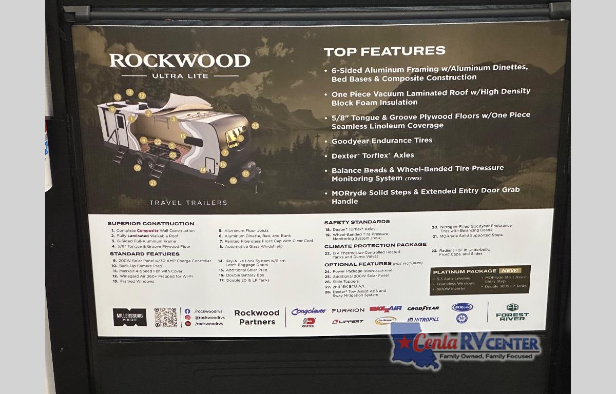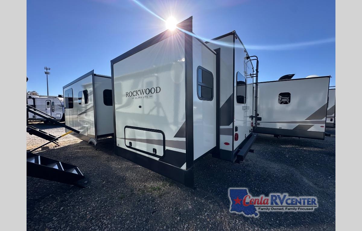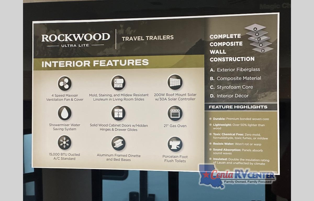 Each Rockwood Ultra Lite travel trailer by Forest River includes superior construction with a high gloss fiberglass cap, aluminum cage construction, and a power awning with LED lighting for a cozy and functional outdoor space. The torsion axle, power tongue jack will make towing smooth and hassle-free, along with the nitrogen filled, Goodyear Endurance tires and the tire pressure monitor system. Interior comforts include kitchen sink with high rise faucet, hidden hinge cabinet doors, and roller shades to name a few. Choose a Rockwood Ultra Lite travel trailer today!
