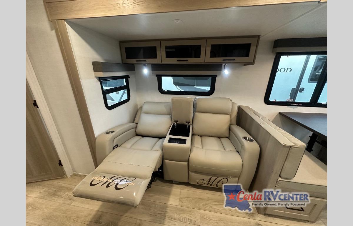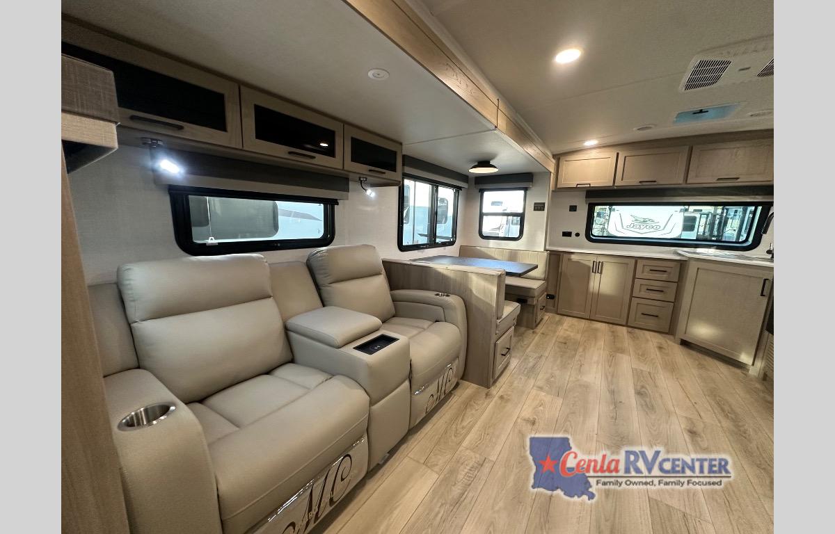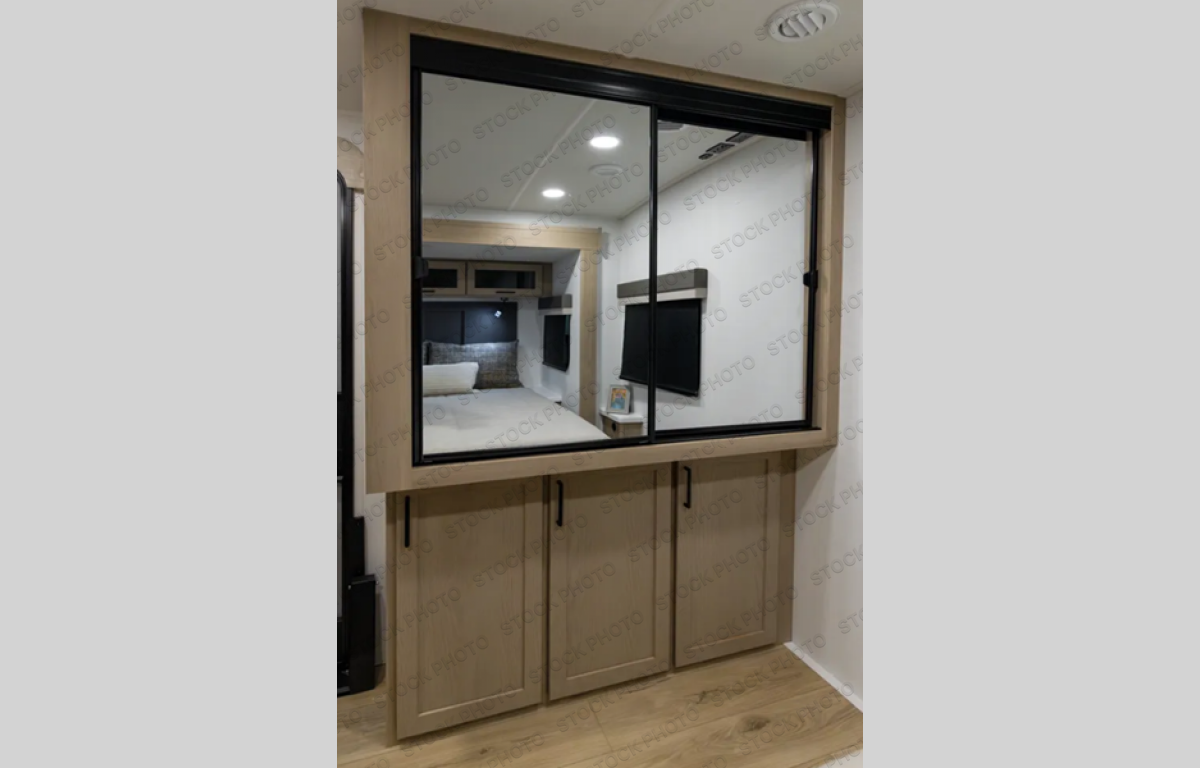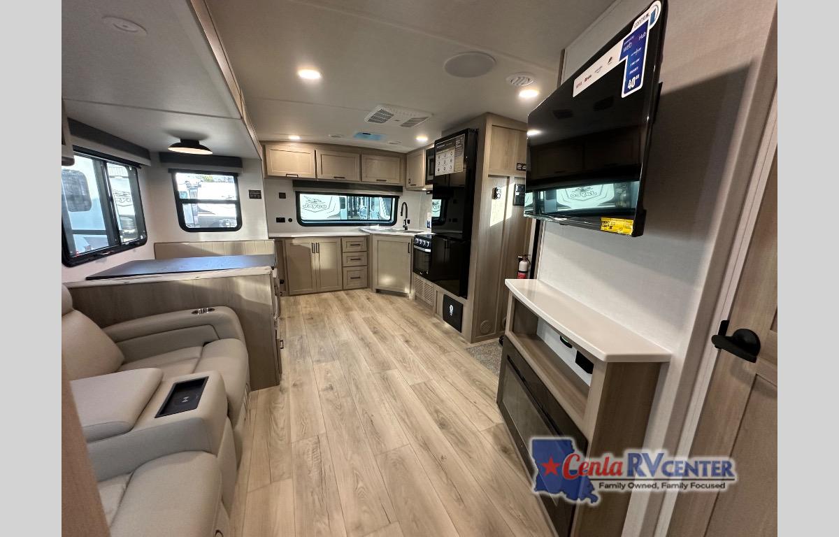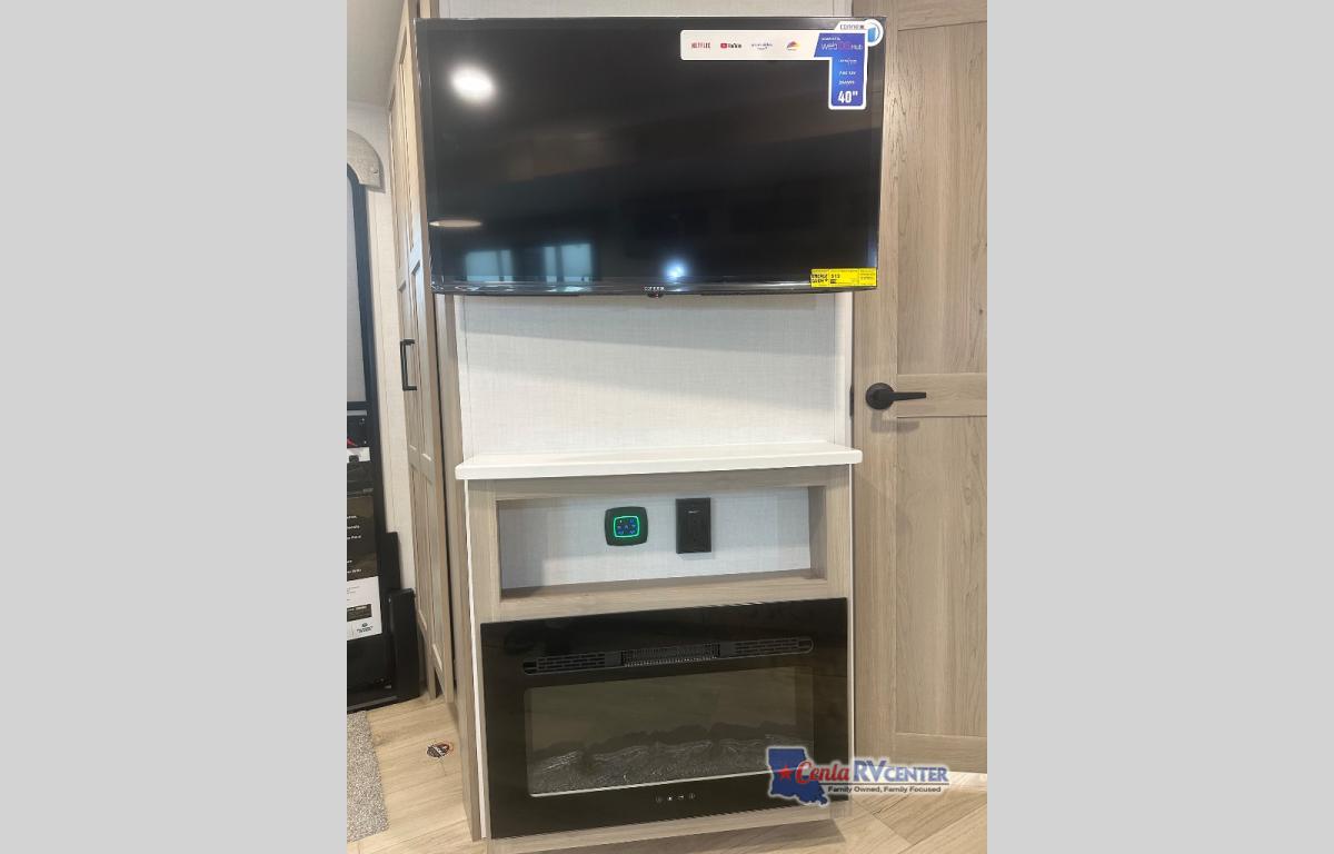 When you are outside this trailer you can enjoy the protection from the 21' power awning, you will also find exterior storage for your extra gear, and a ladder at the rear. You get to choose which entrance to step up into, be it the spacious rear bedroom with a queen bed slide and a wardrobe, or the main entry into the kitchen and living area. The furniture slide includes a booth dinette to eat your meals at, and theater seating to watch the Smart TV with a fireplace below. And the cook will love the front kitchen with extra counter space, a three-burner range, plus a 12V refrigerator and pantry for food storage!