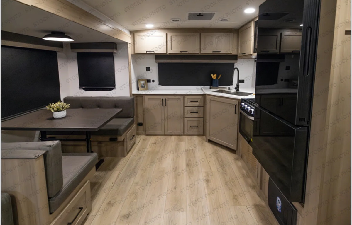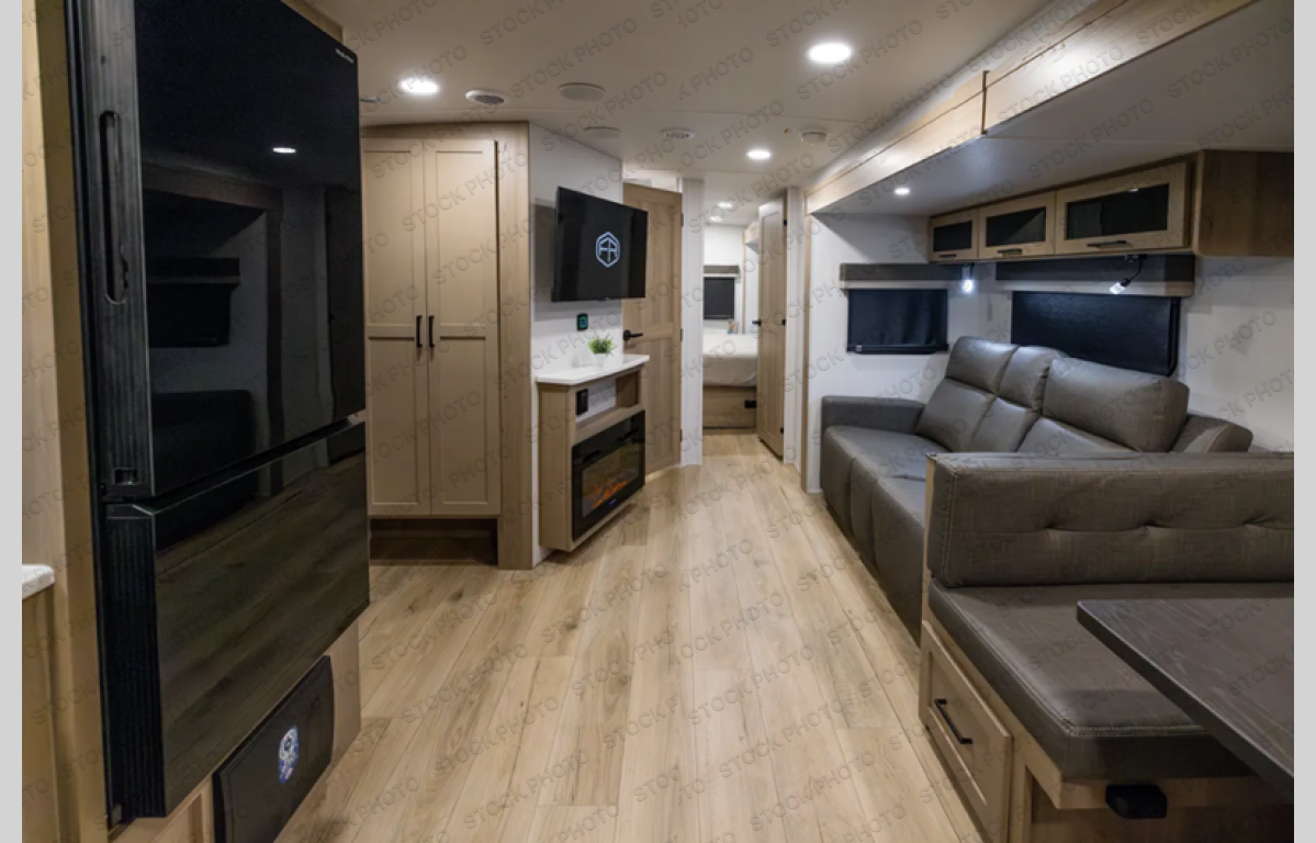 When you are outside this trailer you can enjoy the protection from the 21' power awning, you will also find exterior storage for your extra gear, and a ladder at the rear. You get to choose which entrance to step up into, be it the spacious rear bedroom with a queen bed slide and a wardrobe, or the main entry into the kitchen and living area. The furniture slide includes a booth dinette to eat your meals at, and theater seating to watch the Smart TV with a fireplace below. And the cook will love the front kitchen with extra counter space, a three-burner range, plus a 12V refrigerator and pantry for food storage!