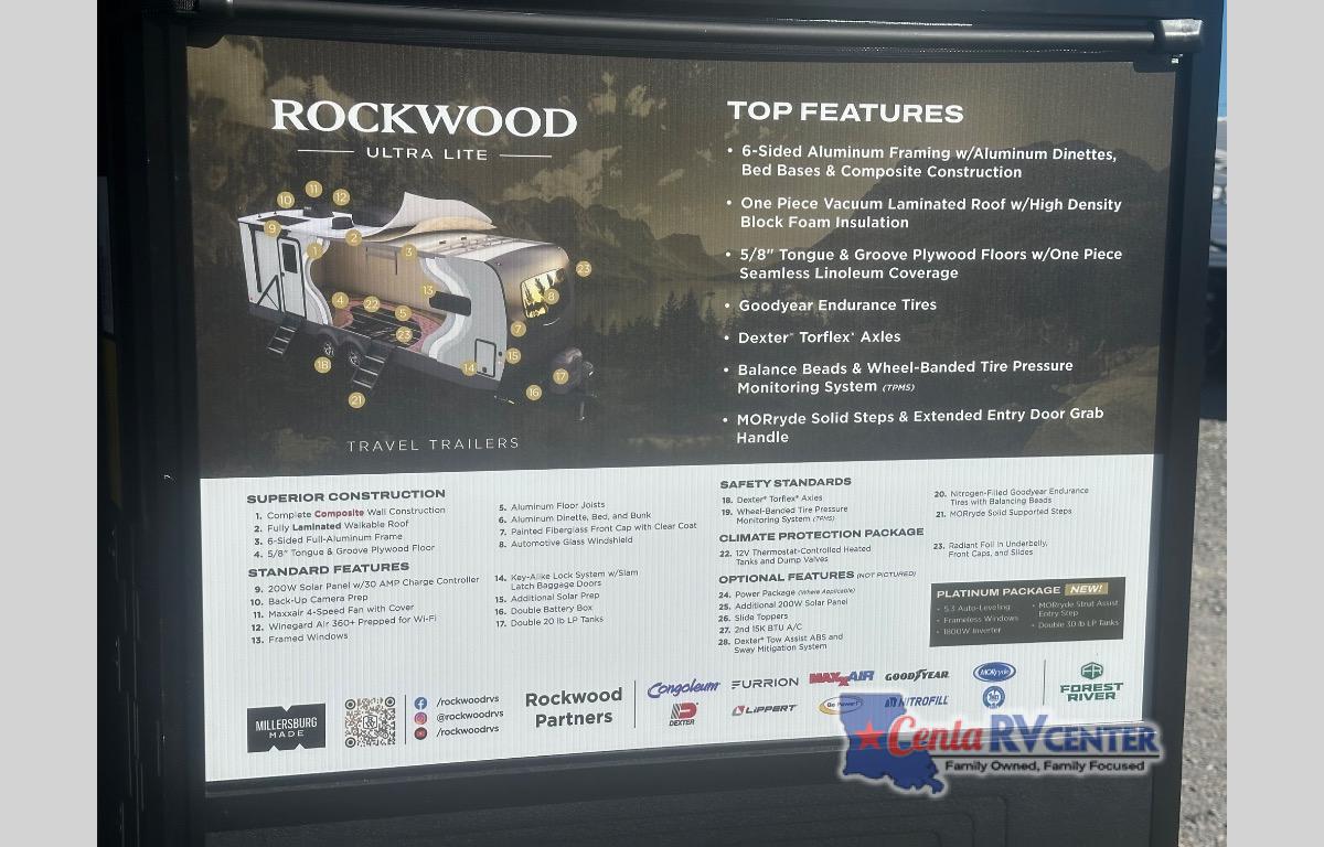 Each Rockwood Ultra Lite travel trailer by Forest River includes superior construction with a high gloss fiberglass cap, aluminum cage construction, and a power awning with LED lighting for a cozy and functional outdoor space. The torsion axle, power tongue jack will make towing smooth and hassle-free, along with the nitrogen filled, Goodyear Endurance tires and the tire pressure monitor system. Interior comforts include kitchen sink with high rise faucet, hidden hinge cabinet doors, and roller shades to name a few. Choose a Rockwood Ultra Lite travel trailer today!