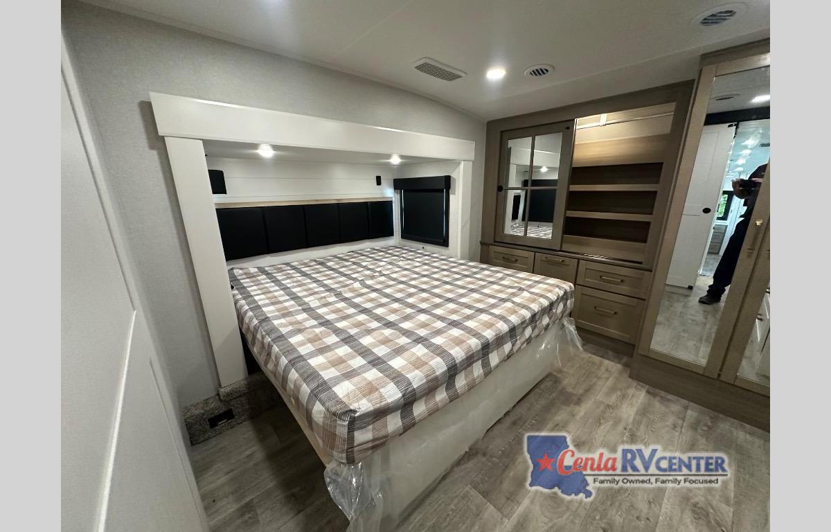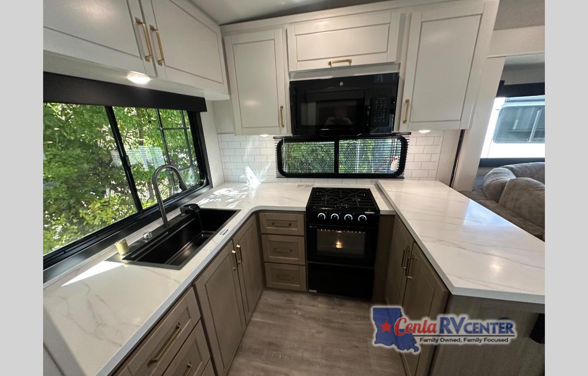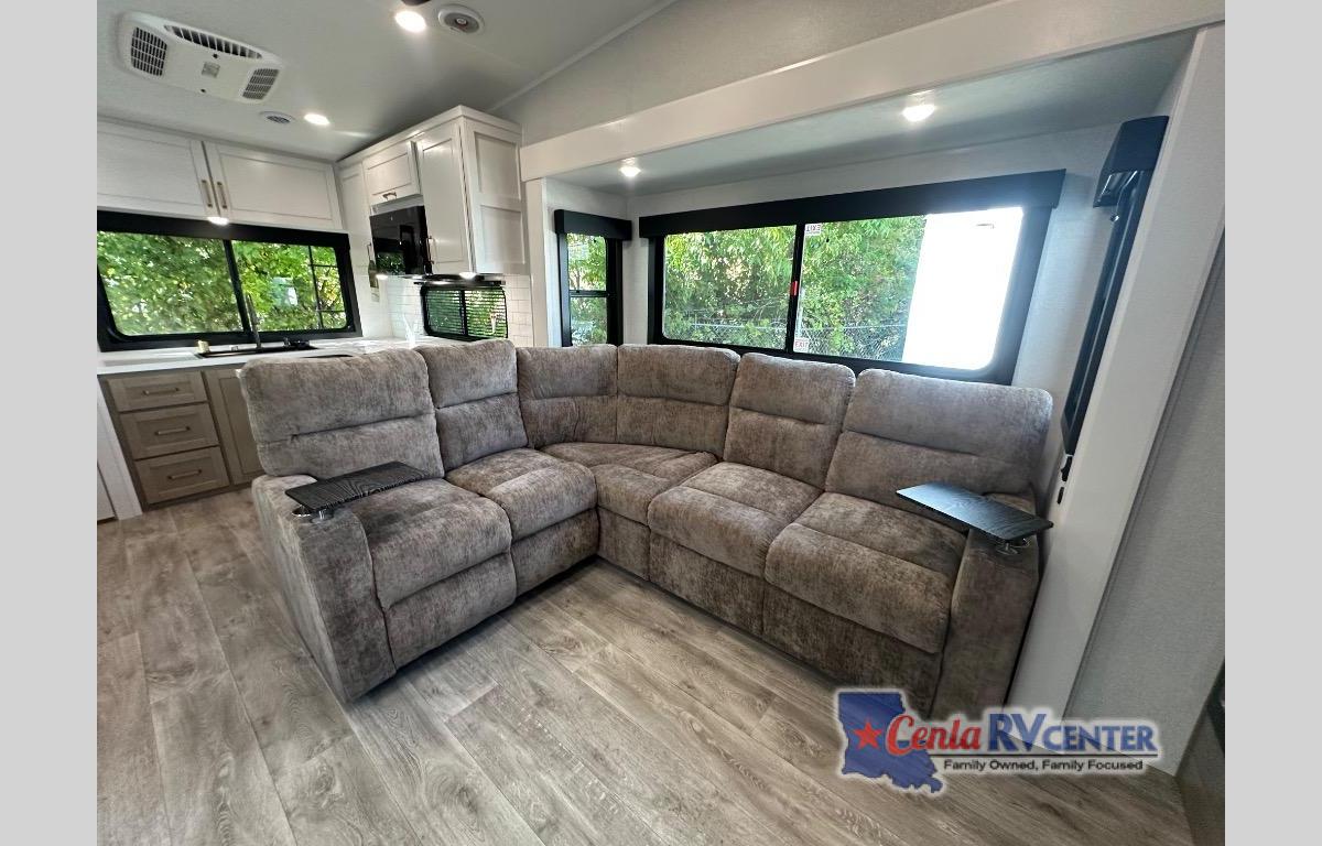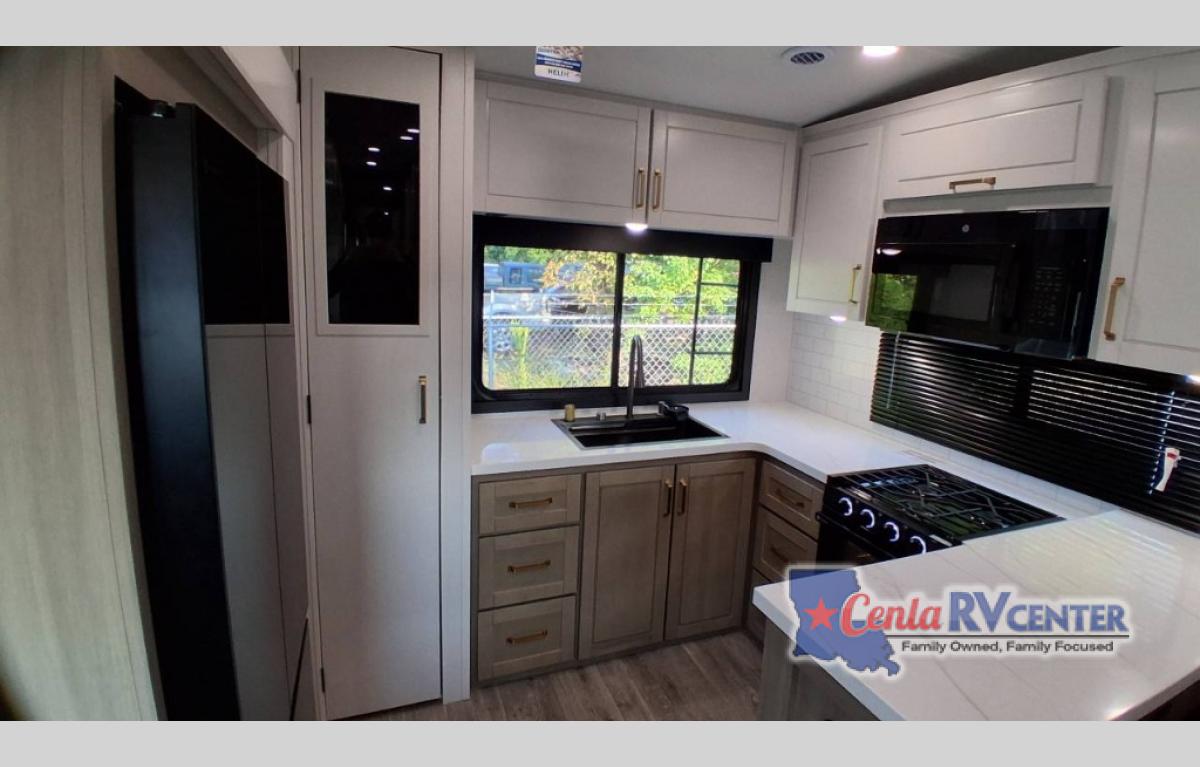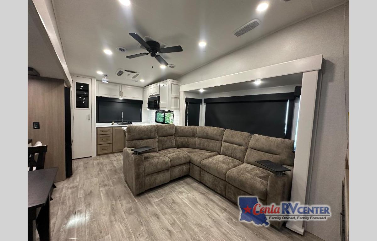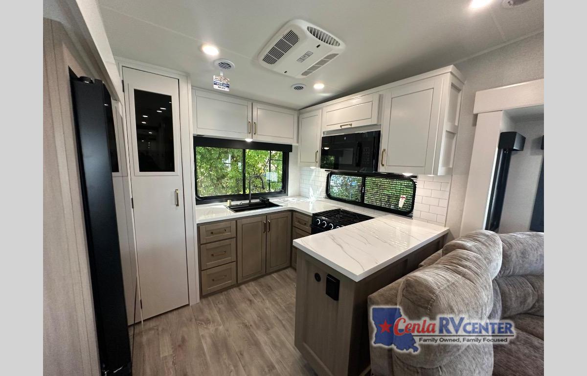 It will be so easy to enjoy time in this spacious fifth wheel! The chef of your group is sure to love the rear kitchen with a U-shaped counter and plenty of storage for food and dishes. The middle living area includes an entertainment center with a fireplace across from the L-shaped sofa for movie nights. There is also a desk to get some work done and a roll-top dinette with two chairs to dine at. Heading up front, you'll find the spacious bathroom that includes a shower with a seat, and the front private bedroom with a king bed slide out. There is also a chest with a TV, front shelves with drawers, plus washer and dryer prep!