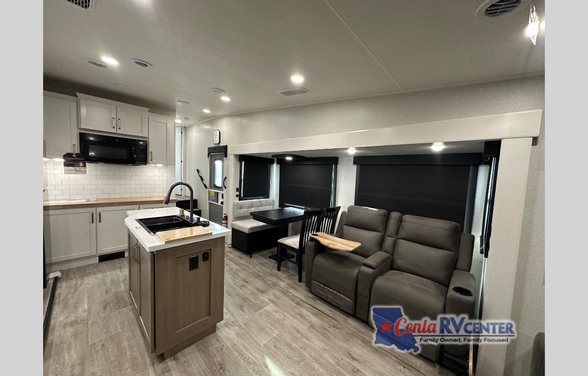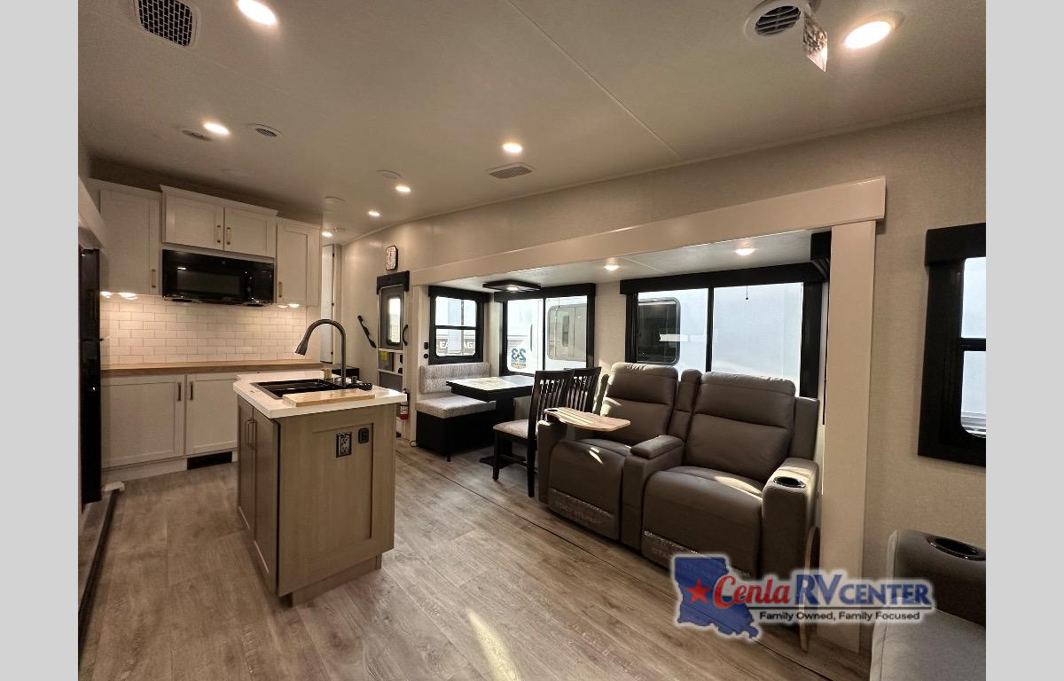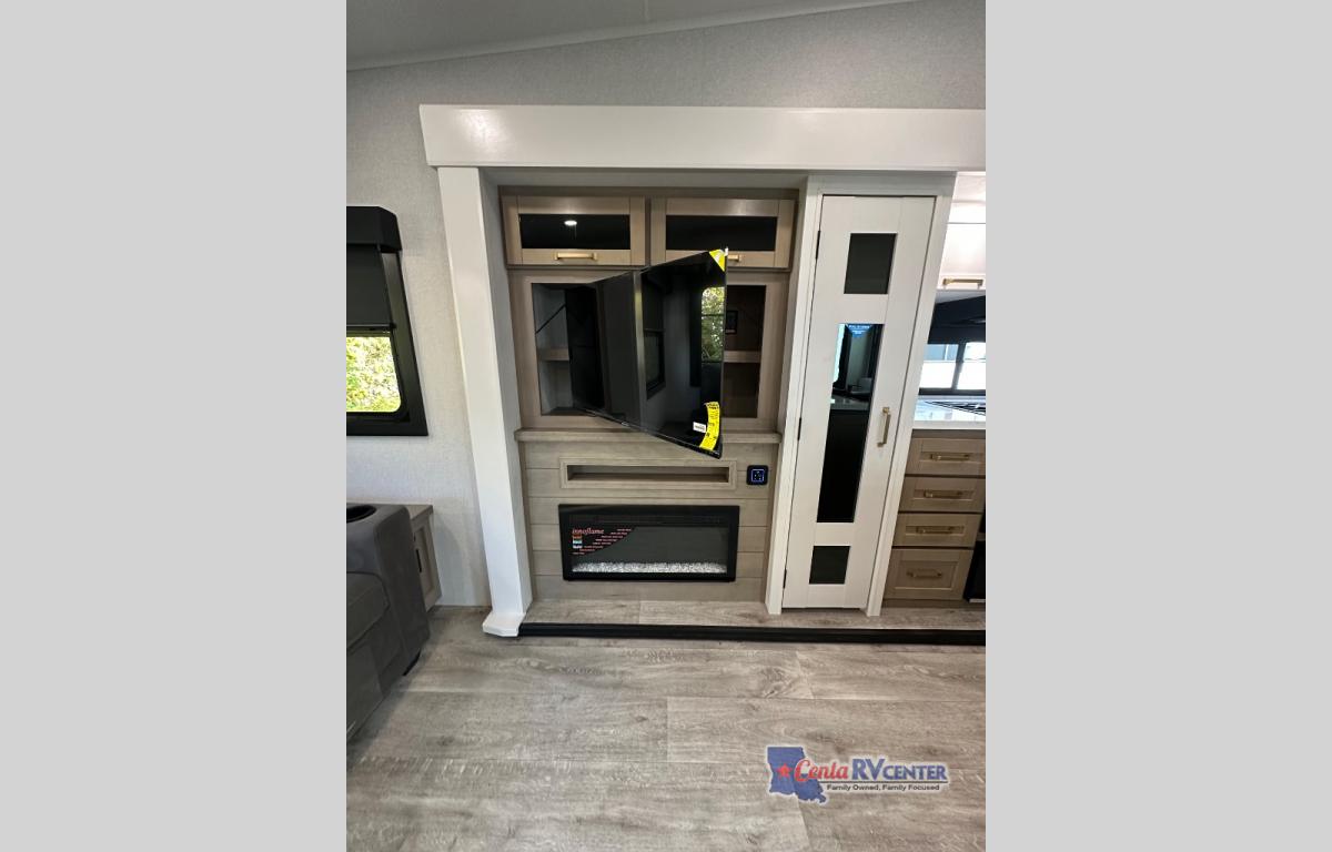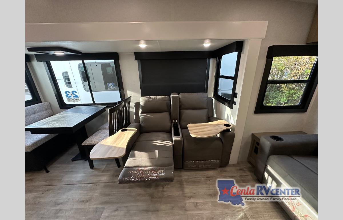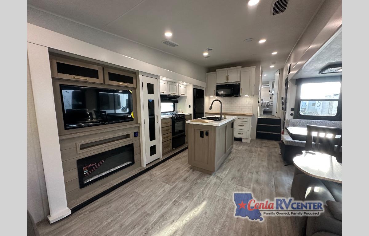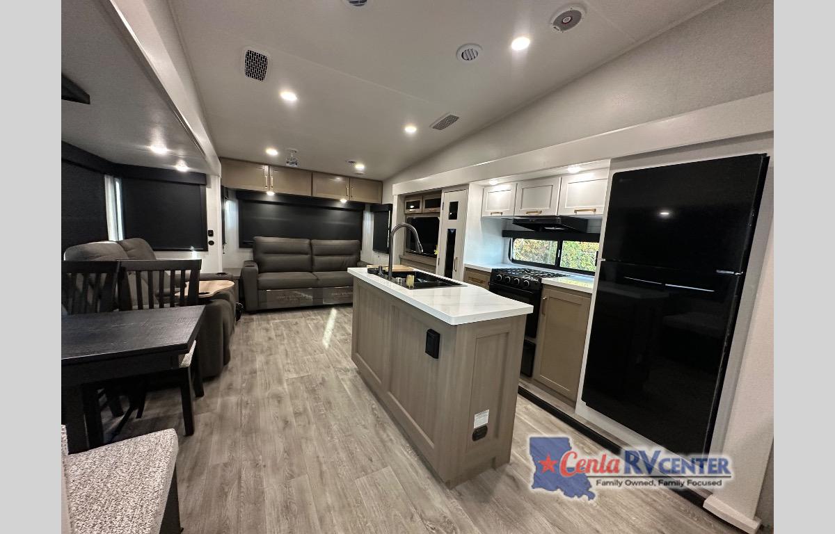 You will love how much interior space you have in this fifth wheel thanks to the dual opposing slides in the combined kitchen and living area! While your crew is relaxing on the theater seat or tri-fold sofa, you can prepare dinner on the GE black and stainless 21" range. There is also an entertainment center and fireplace across from the theater seat for easy viewing, and the table and chairs with a bench will be the perfect place to play a board game at. Head to the front to enjoy the private bedroom with an Olympic queen bed, and the full bath is close by for easy nighttime use!
