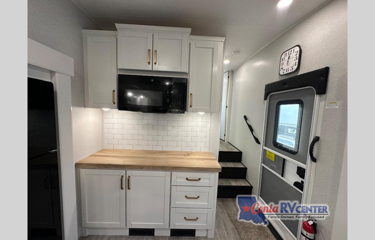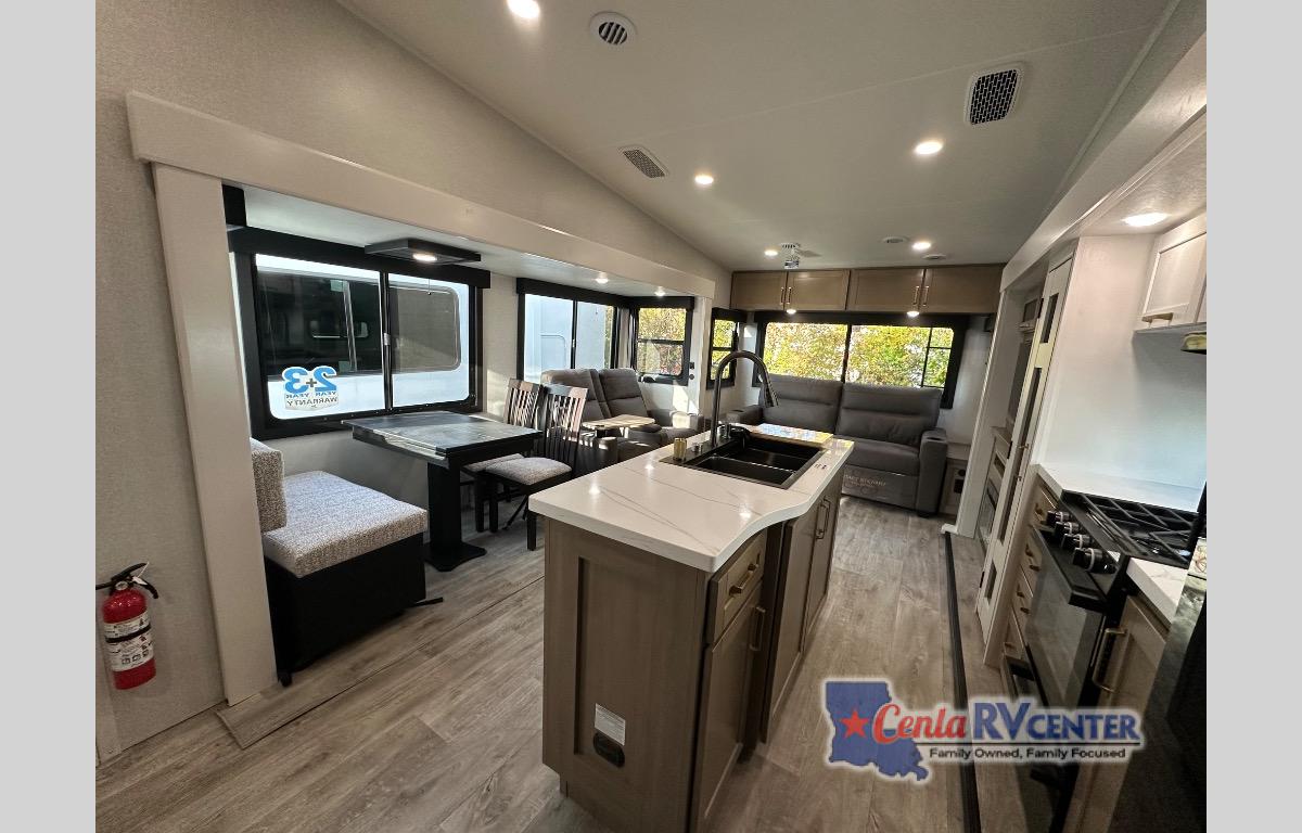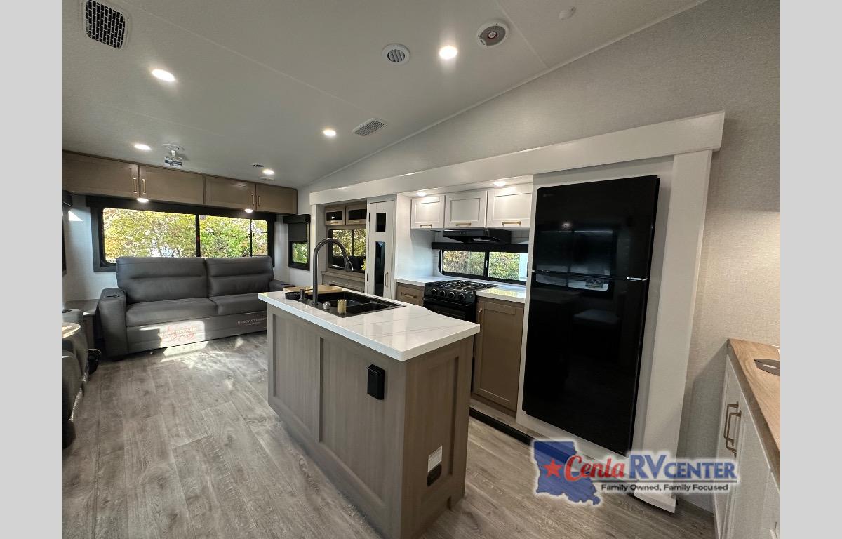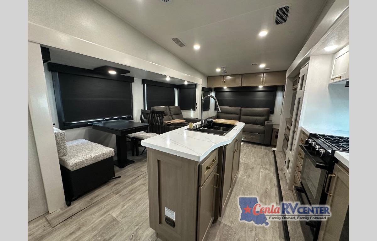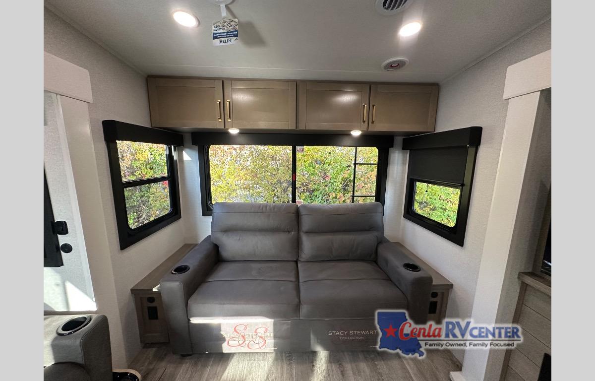 You will love how much interior space you have in this fifth wheel thanks to the dual opposing slides in the combined kitchen and living area! While your crew is relaxing on the theater seat or tri-fold sofa, you can prepare dinner on the GE black and stainless 21" range. There is also an entertainment center and fireplace across from the theater seat for easy viewing, and the table and chairs with a bench will be the perfect place to play a board game at. Head to the front to enjoy the private bedroom with an Olympic queen bed, and the full bath is close by for easy nighttime use!