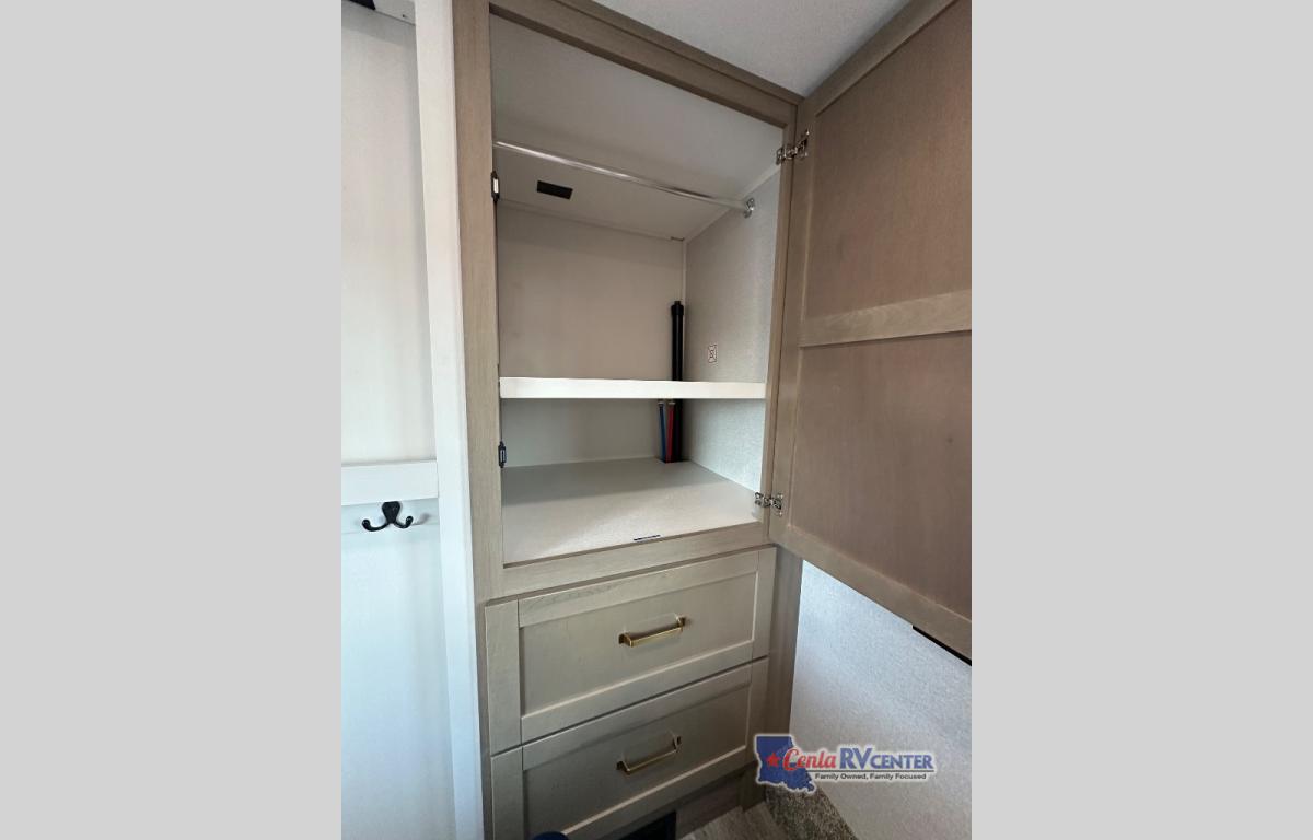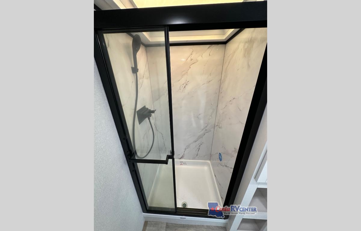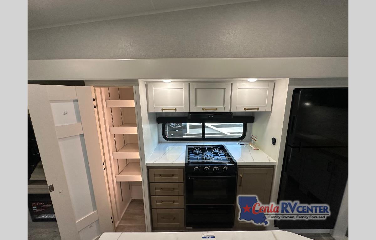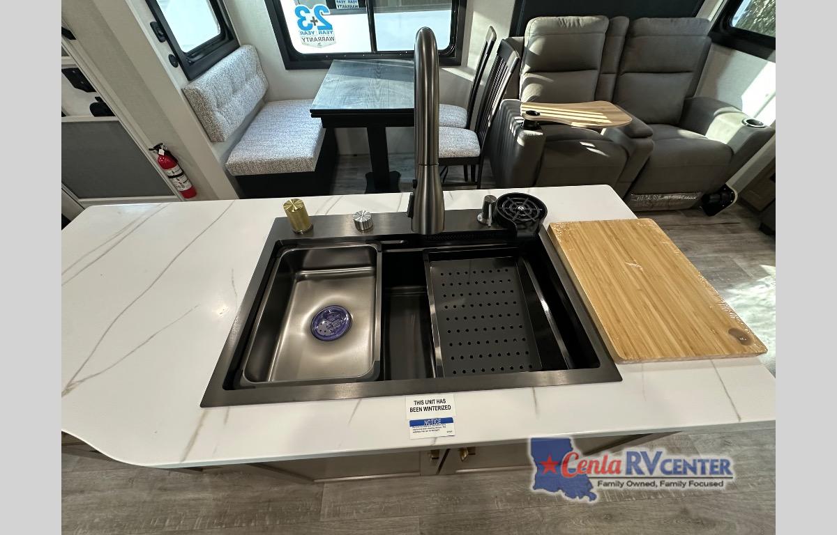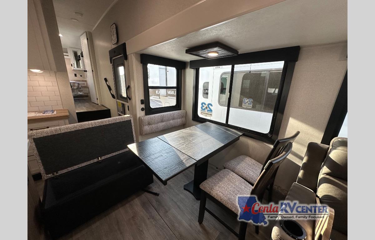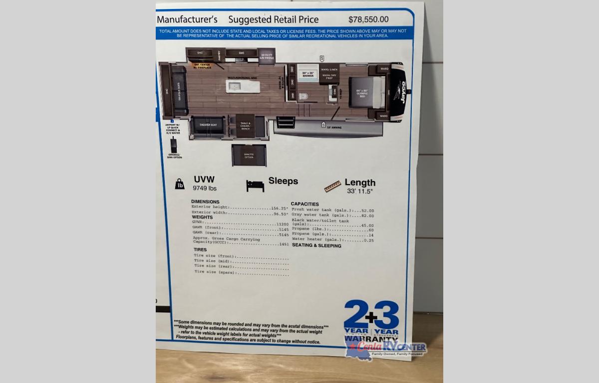 You will love how much interior space you have in this fifth wheel thanks to the dual opposing slides in the combined kitchen and living area! While your crew is relaxing on the theater seat or tri-fold sofa, you can prepare dinner on the GE black and stainless 21" range. There is also an entertainment center and fireplace across from the theater seat for easy viewing, and the table and chairs with a bench will be the perfect place to play a board game at. Head to the front to enjoy the private bedroom with an Olympic queen bed, and the full bath is close by for easy nighttime use!