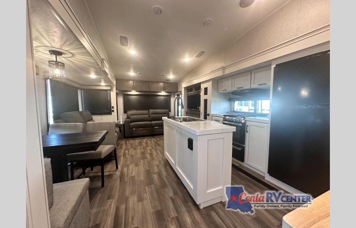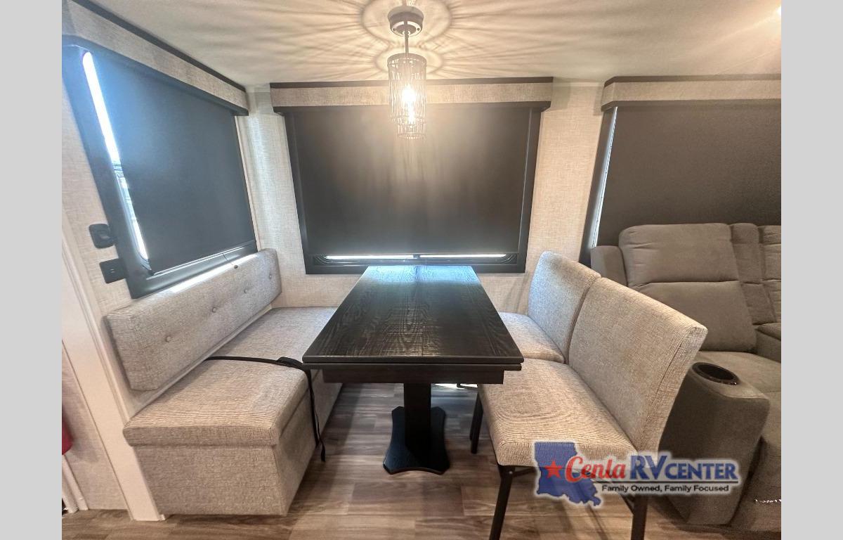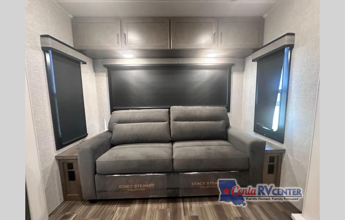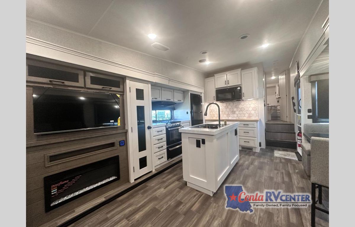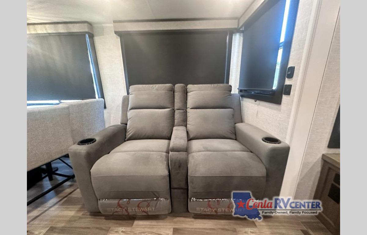 You will love how much interior space you have in this fifth wheel thanks to the dual opposing slides in the combined kitchen and living area! While your crew is relaxing on the theater seat or tri-fold sofa, you can prepare dinner on the GE black and stainless 21" range. There is also an entertainment center and fireplace across from the theater seat for easy viewing, and the table and chairs with a bench will be the perfect place to play a board game at. Head to the front to enjoy the private bedroom with an Olympic queen bed, and the full bath is close by for easy nighttime use!