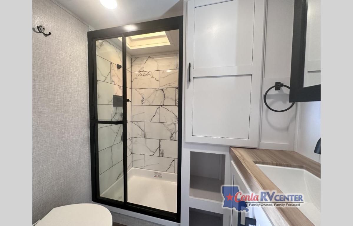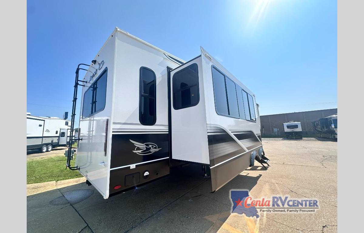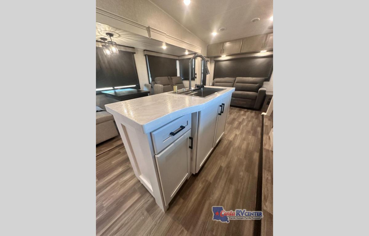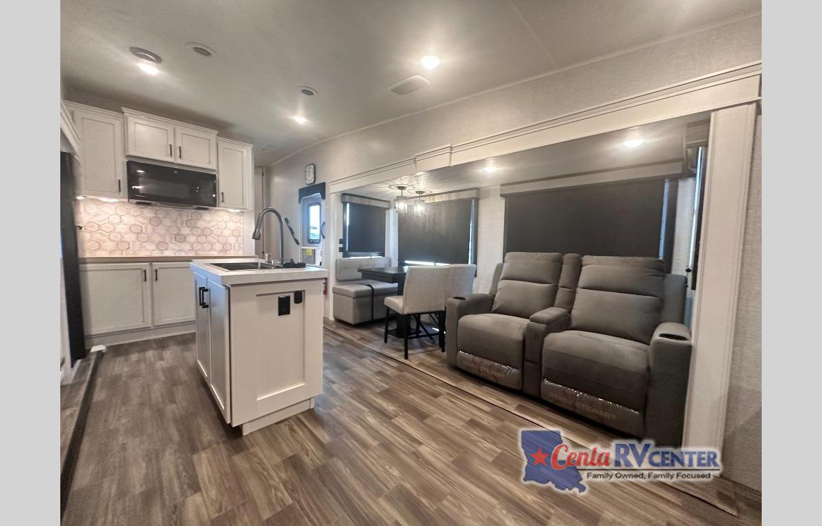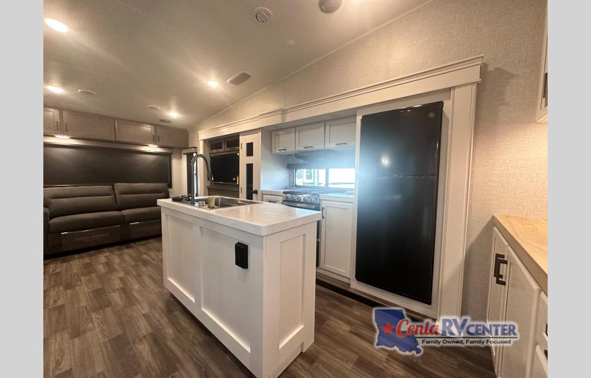 You will love how much interior space you have in this fifth wheel thanks to the dual opposing slides in the combined kitchen and living area! While your crew is relaxing on the theater seat or tri-fold sofa, you can prepare dinner on the GE black and stainless 21" range. There is also an entertainment center and fireplace across from the theater seat for easy viewing, and the table and chairs with a bench will be the perfect place to play a board game at. Head to the front to enjoy the private bedroom with an Olympic queen bed, and the full bath is close by for easy nighttime use!