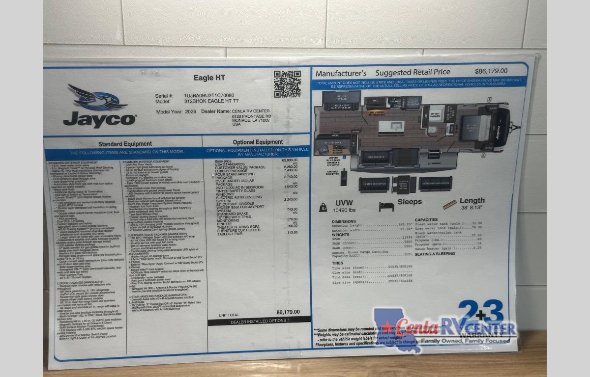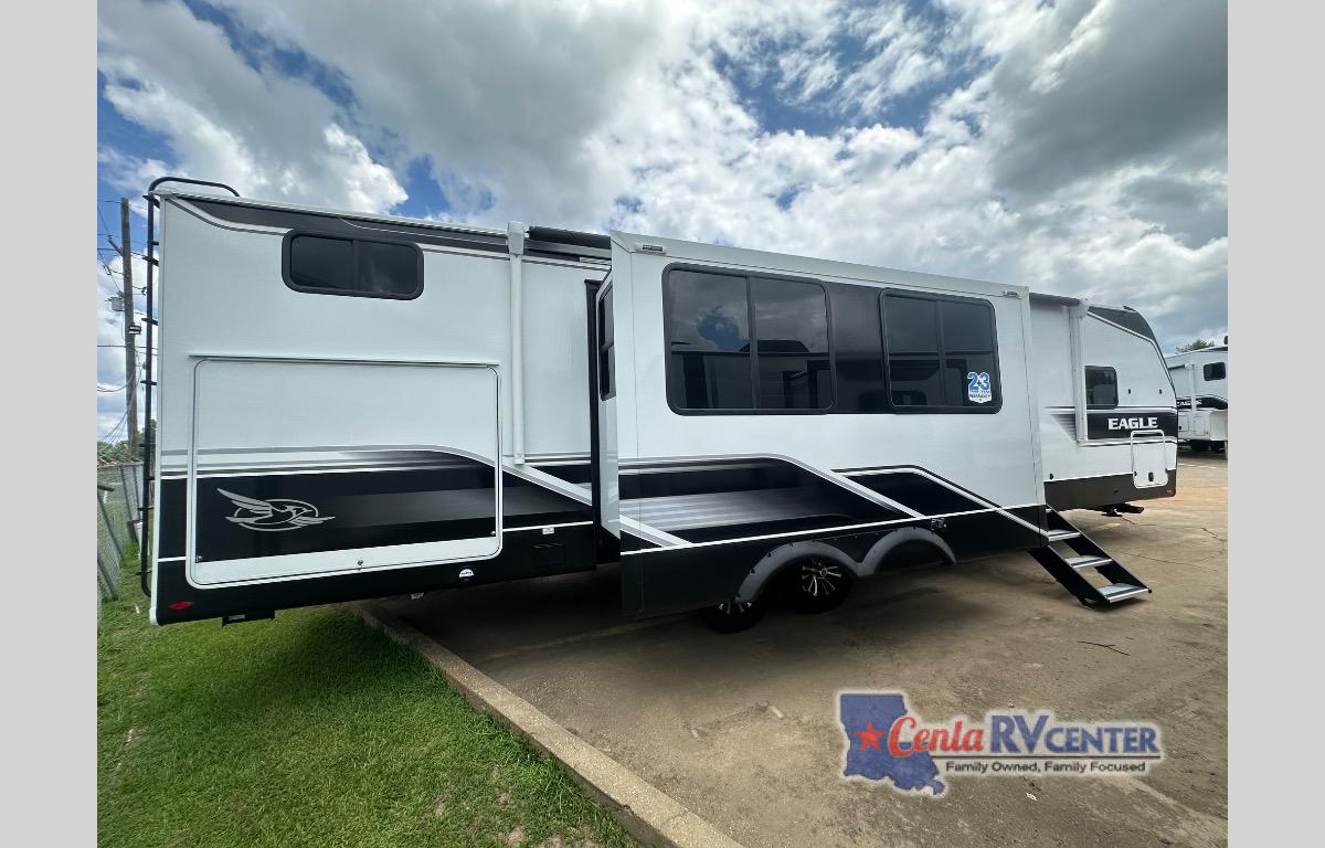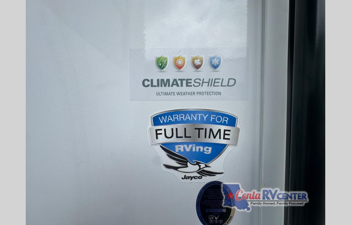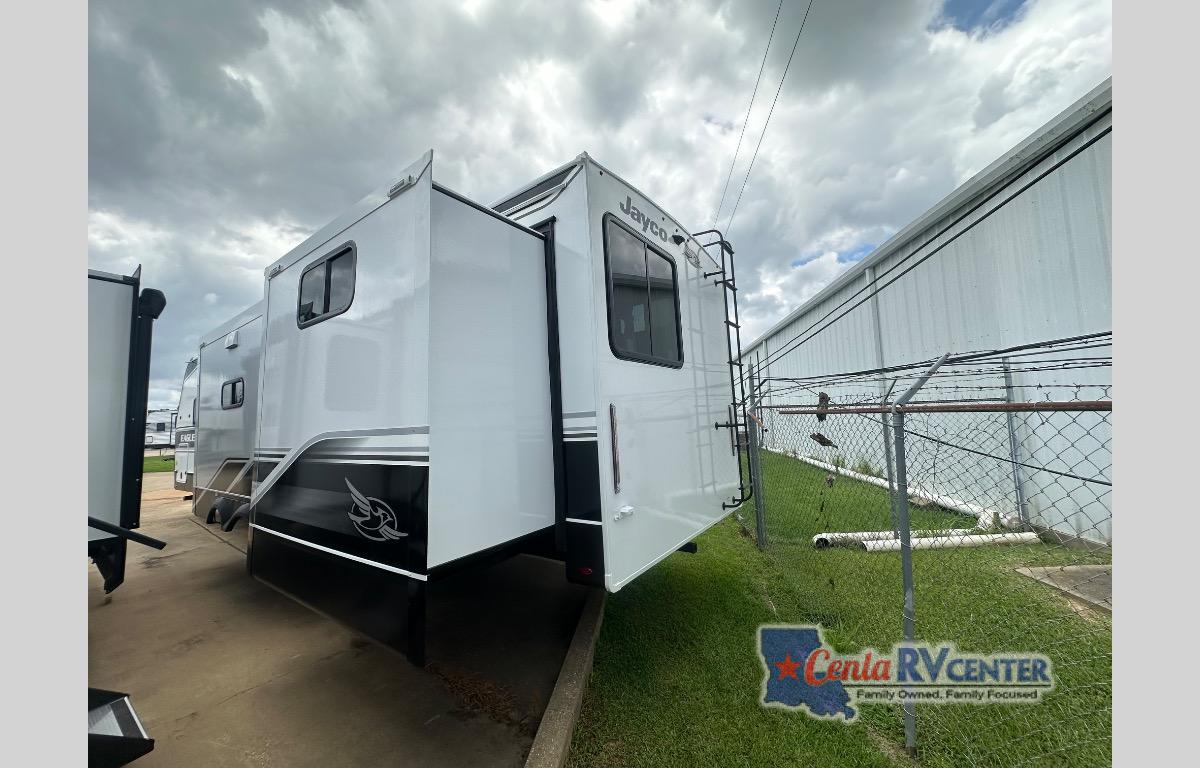 With any Eagle HT fifth wheel or travel trailer by Jayco you will enjoy a smooth drive thanks to the 4 Star Handling Package and MORryde CRE-3000 rubberized suspension. The Customer Value Package includes amenities that are sure to make camping easier than ever, like the 60K on-demand water heater, Keyed-Alike lock system, 15,000 BTU "Whisper Quiet" A/C, and more. Handcrafted door/drawer fronts will make your space feel more like home, along with residential vinyl flooring throughout, GE appliances, and blackout roller shades with reflective side throughout to keep the sun out when you want to sleep in. Each model also includes a NuVo H2O water treatment system with filters included, interior and exterior "Blue Sync" audio connect with MB Quart Sound for your TV and phone, and 100% no floor vents for added comfort and convenience!