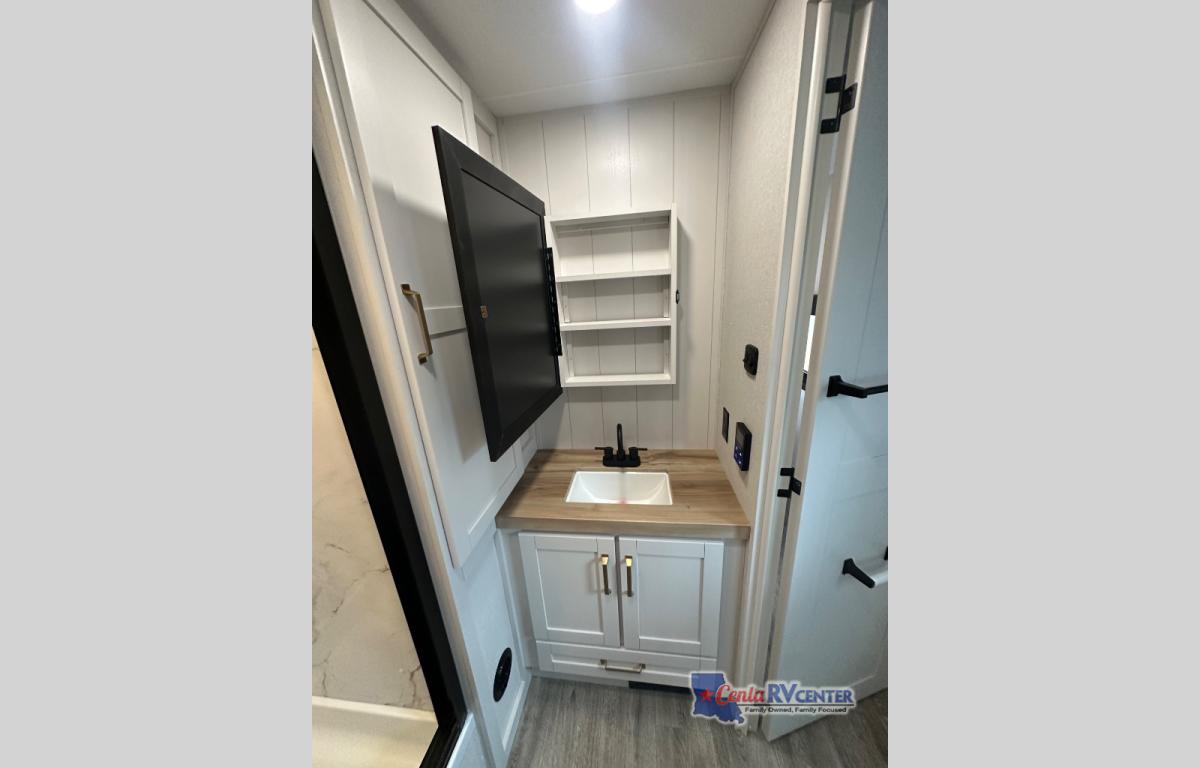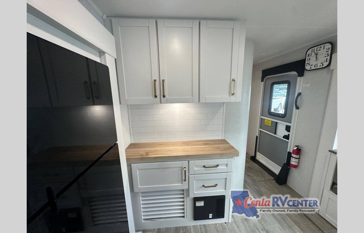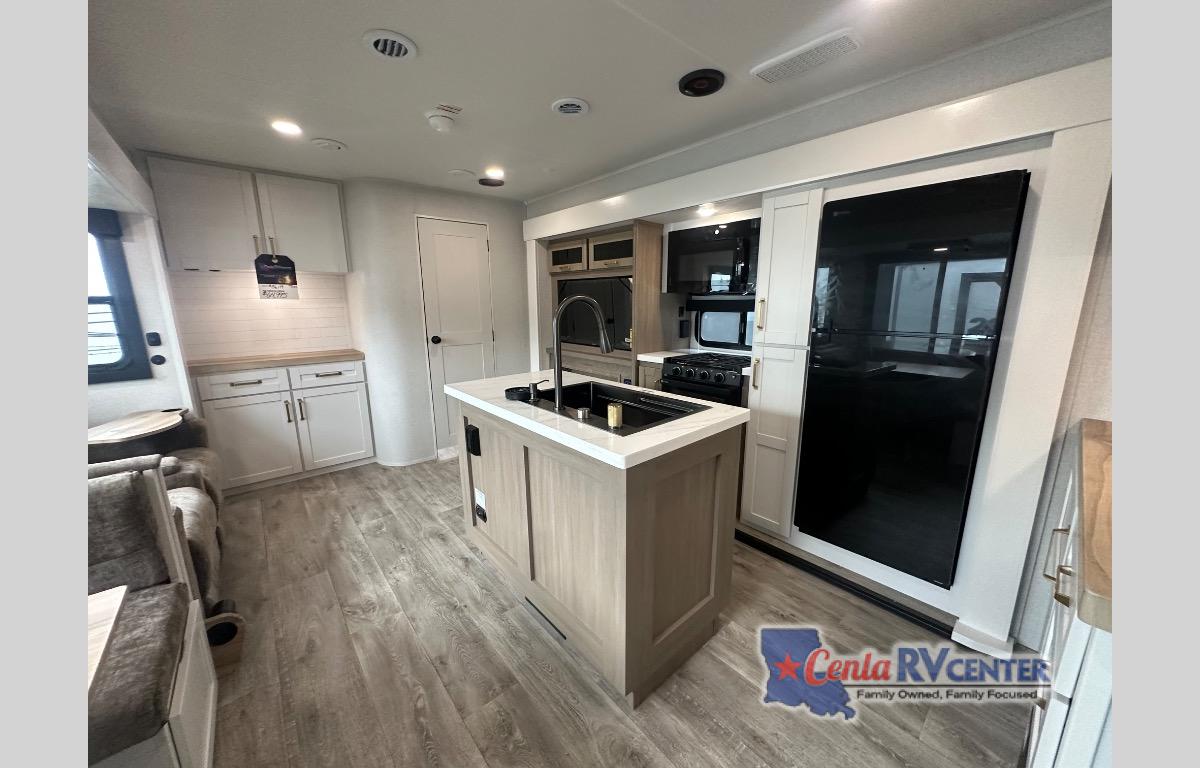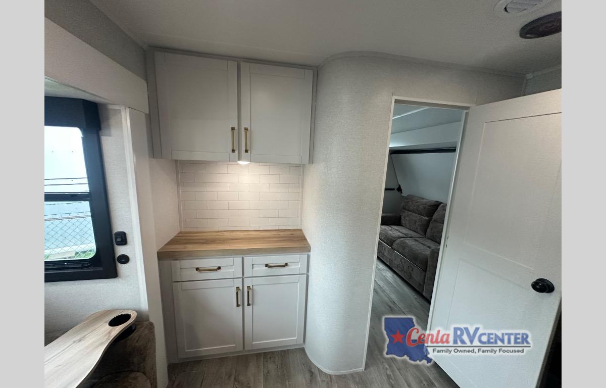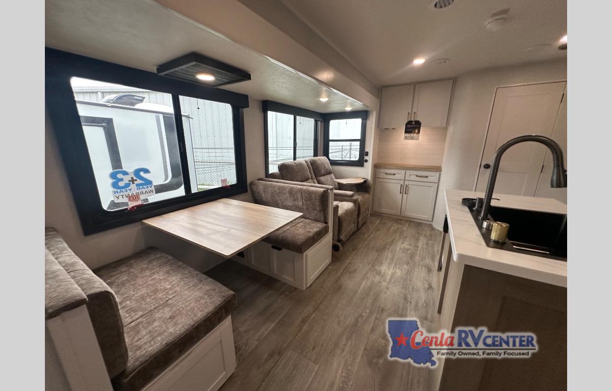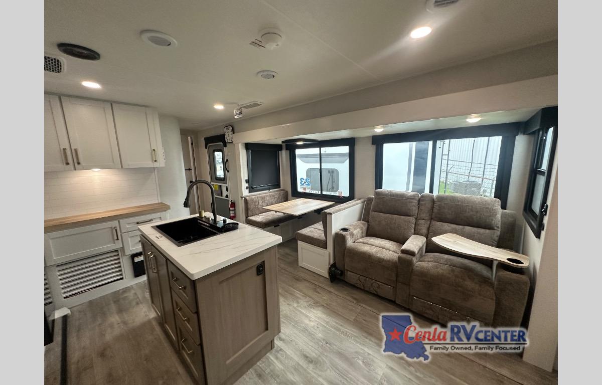 This travel trailer is perfect for your larger group or family! There is a rear private bunkhouse with two bunks, a tri-fold sofa, plus a slide out for more space. You will have the front private bedroom all to yourselves with a queen bed, and any other guests can sleep on the tri-fold sofa and booth dinette! There is also a wardrobe/linen closet with washer and dryer prep if you plan to add a washer and dyer for convenience. The chef can prepare their best meals with the kitchen island and will enjoy having two hutches to store the essentials. They could even cook at the outside kitchen to breathe in some fresh air and enjoy the beautiful scenery!