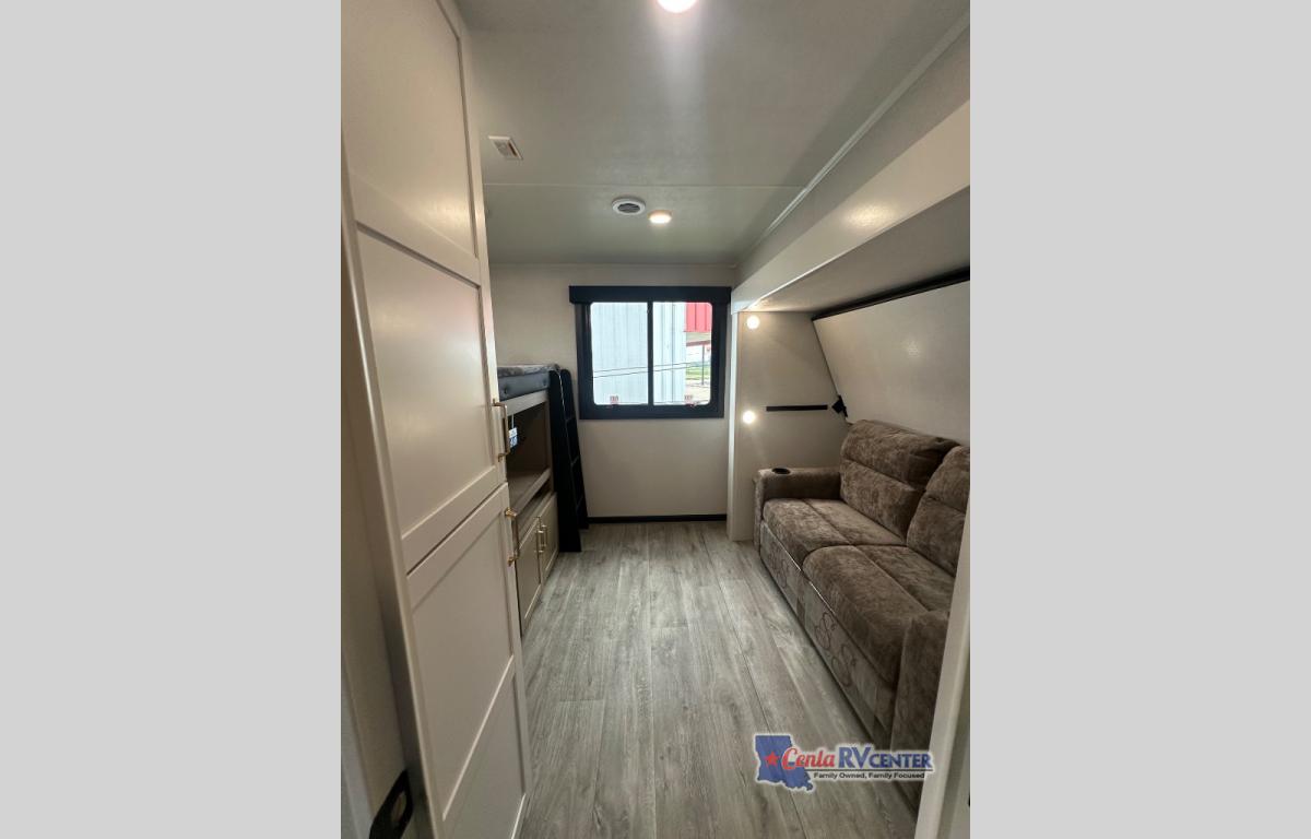 This travel trailer is perfect for your larger group or family! There is a rear private bunkhouse with two bunks, a tri-fold sofa, plus a slide out for more space. You will have the front private bedroom all to yourselves with a queen bed, and any other guests can sleep on the tri-fold sofa and booth dinette! There is also a wardrobe/linen closet with washer and dryer prep if you plan to add a washer and dyer for convenience. The chef can prepare their best meals with the kitchen island and will enjoy having two hutches to store the essentials. They could even cook at the outside kitchen to breathe in some fresh air and enjoy the beautiful scenery!