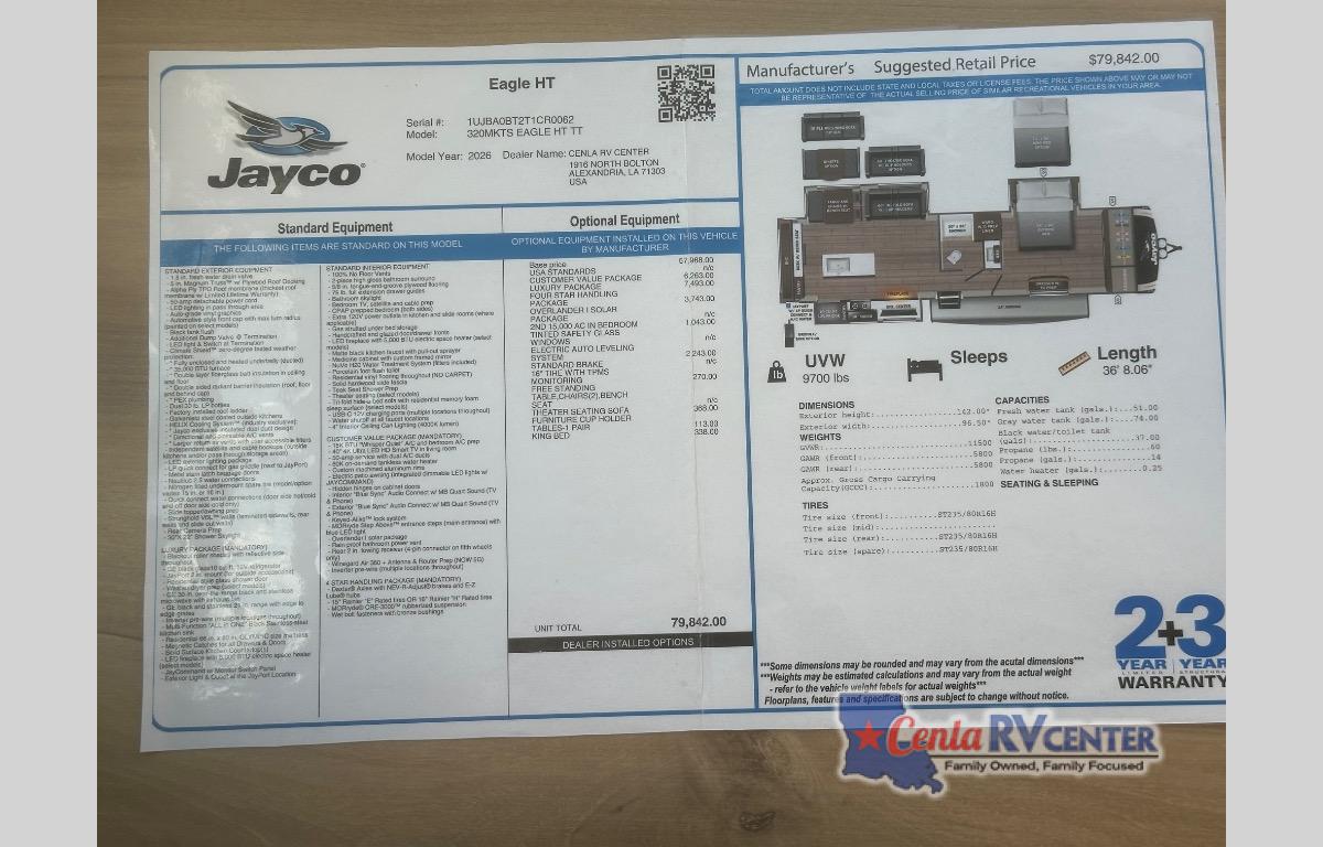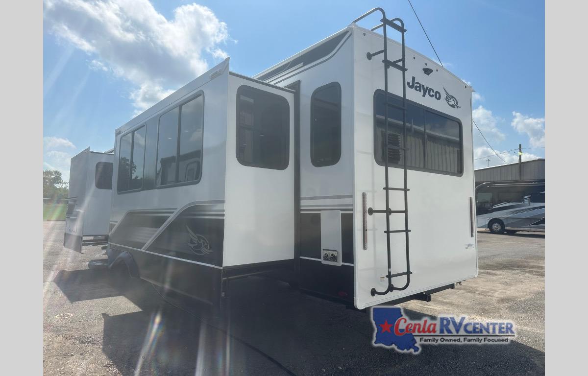 With any Eagle HT fifth wheel or travel trailer by Jayco you will enjoy a smooth drive thanks to the 4 Star Handling Package and MORryde CRE-3000 rubberized suspension. The Customer Value Package includes amenities that are sure to make camping easier than ever, like the 60K on-demand water heater, Keyed-Alike lock system, 15,000 BTU "Whisper Quiet" A/C, and more. Handcrafted door/drawer fronts will make your space feel more like home, along with residential vinyl flooring throughout, GE appliances, and blackout roller shades with reflective side throughout to keep the sun out when you want to sleep in. Each model also includes a NuVo H2O water treatment system with filters included, interior and exterior "Blue Sync" audio connect with MB Quart Sound for your TV and phone, and 100% no floor vents for added comfort and convenience!