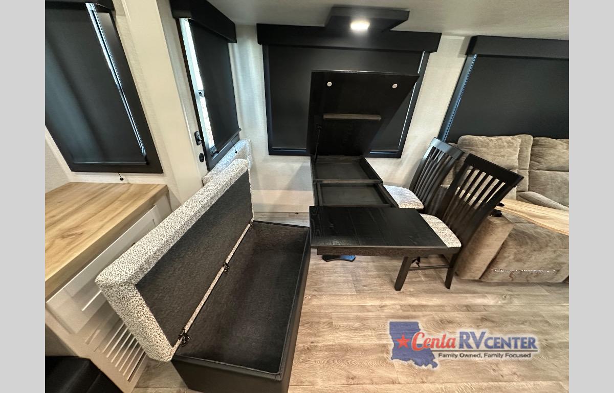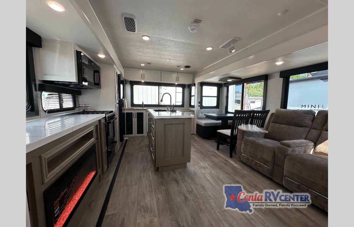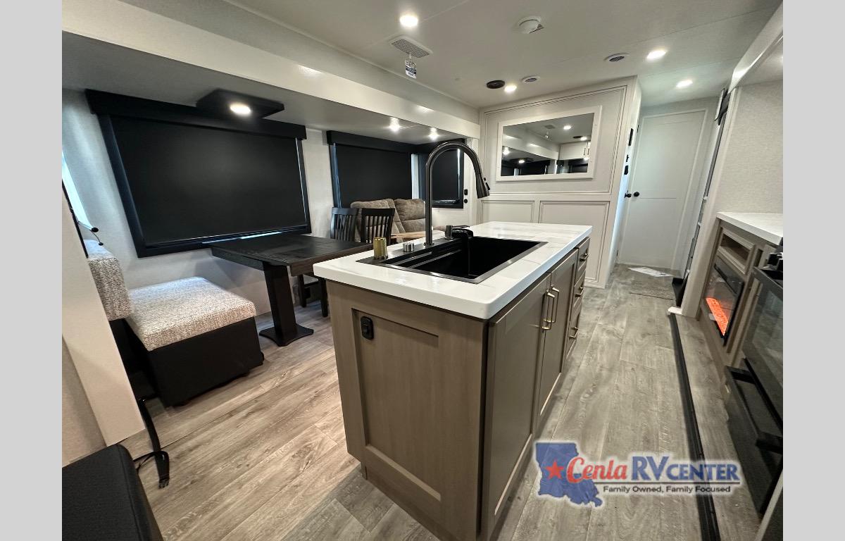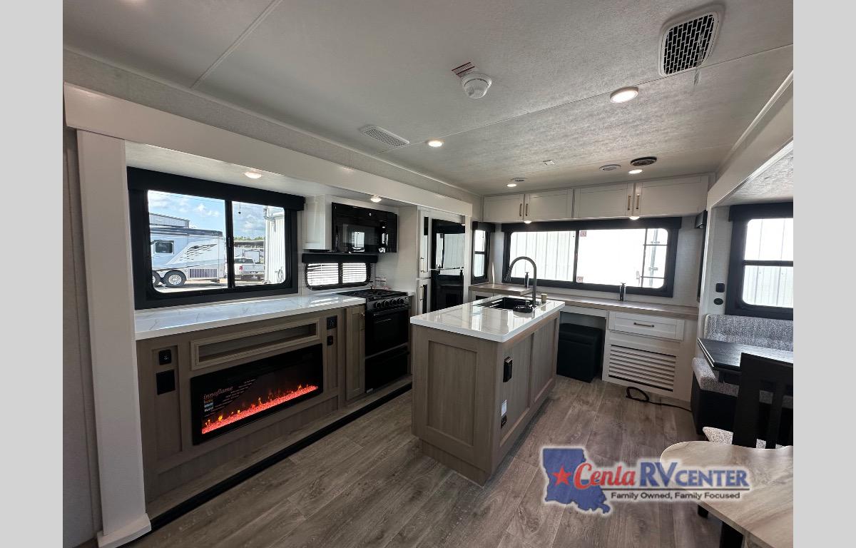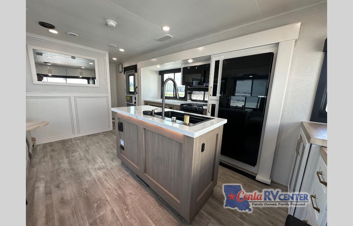 You will feel right at home camping in this travel trailer! It features a front private bedroom with an Olympic queen bed slide for more interior space, a dresser, a front wardrobe to hang your clothes, and a wardrobe with washer and dryer prep. Start each morning getting squeaky clean in the full bathroom with the shower, then head to the kitchen to fry up some eggs on the stainless steel range. The kitchen island provides more counter space to prep meals, and there are two pantries for dry goods and snacks. There is also a table and chairs with a bench seat plus a tri-fold sofa within the large slide out. And a desk with a bench seat lets you get some work done!