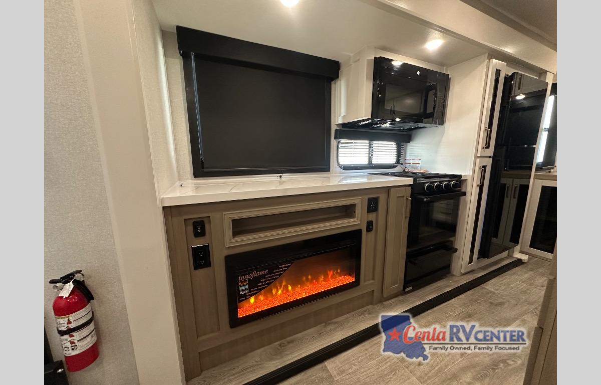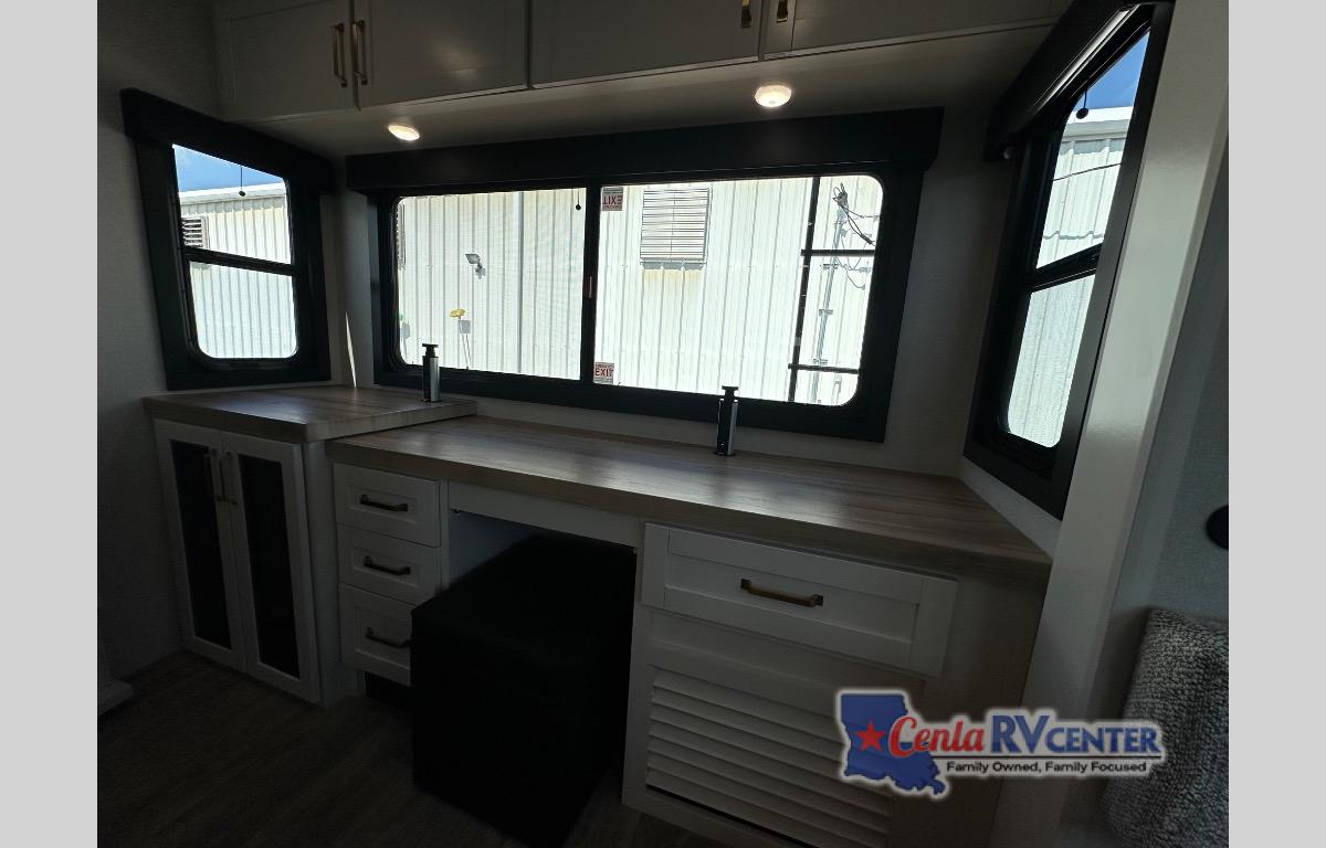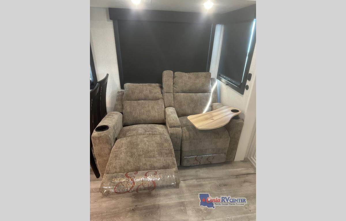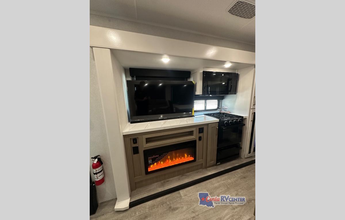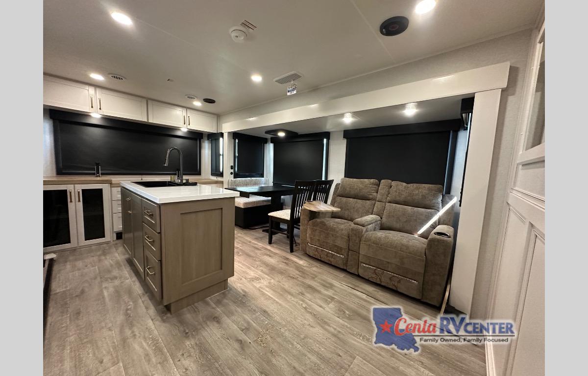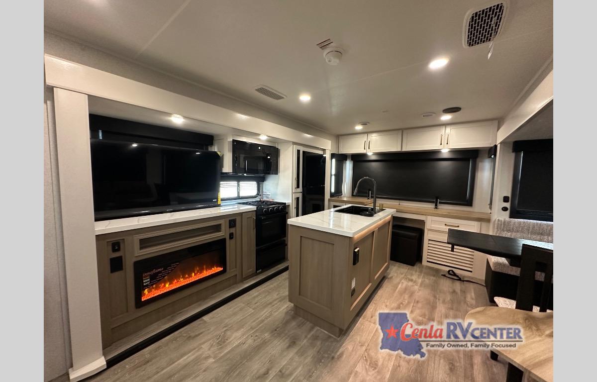 You will feel right at home camping in this travel trailer! It features a front private bedroom with an Olympic queen bed slide for more interior space, a dresser, a front wardrobe to hang your clothes, and a wardrobe with washer and dryer prep. Start each morning getting squeaky clean in the full bathroom with the shower, then head to the kitchen to fry up some eggs on the stainless steel range. The kitchen island provides more counter space to prep meals, and there are two pantries for dry goods and snacks. There is also a table and chairs with a bench seat plus a tri-fold sofa within the large slide out. And a desk with a bench seat lets you get some work done!