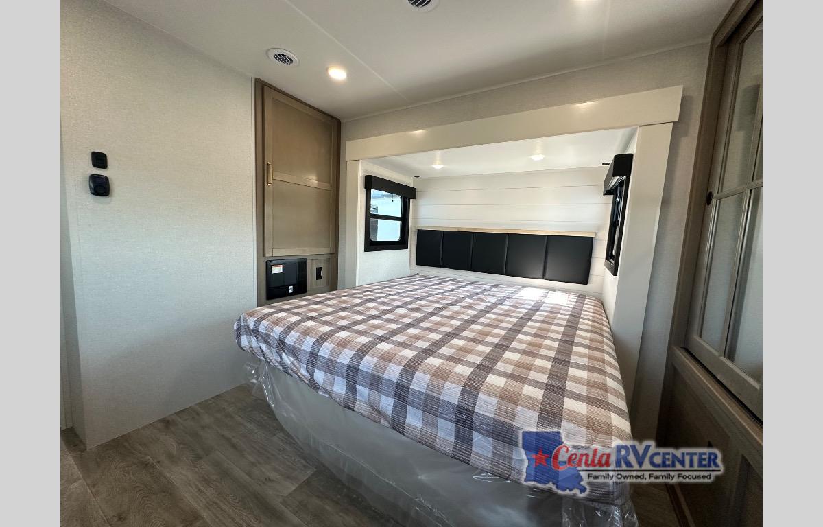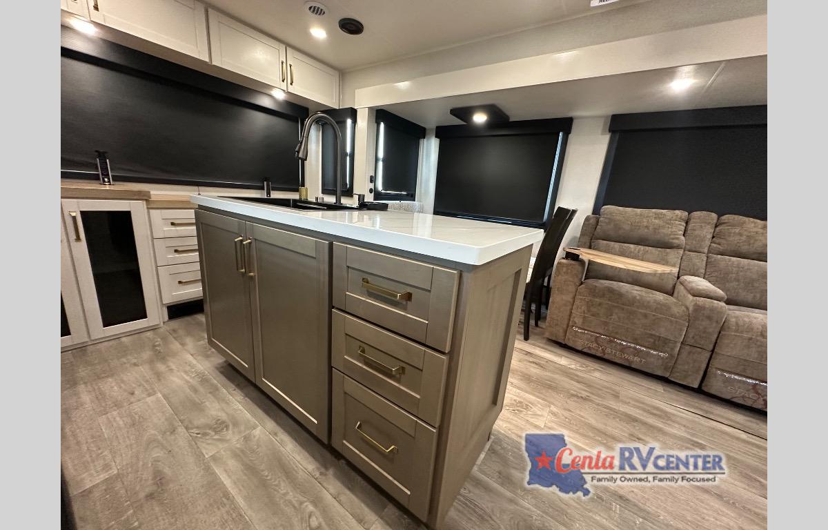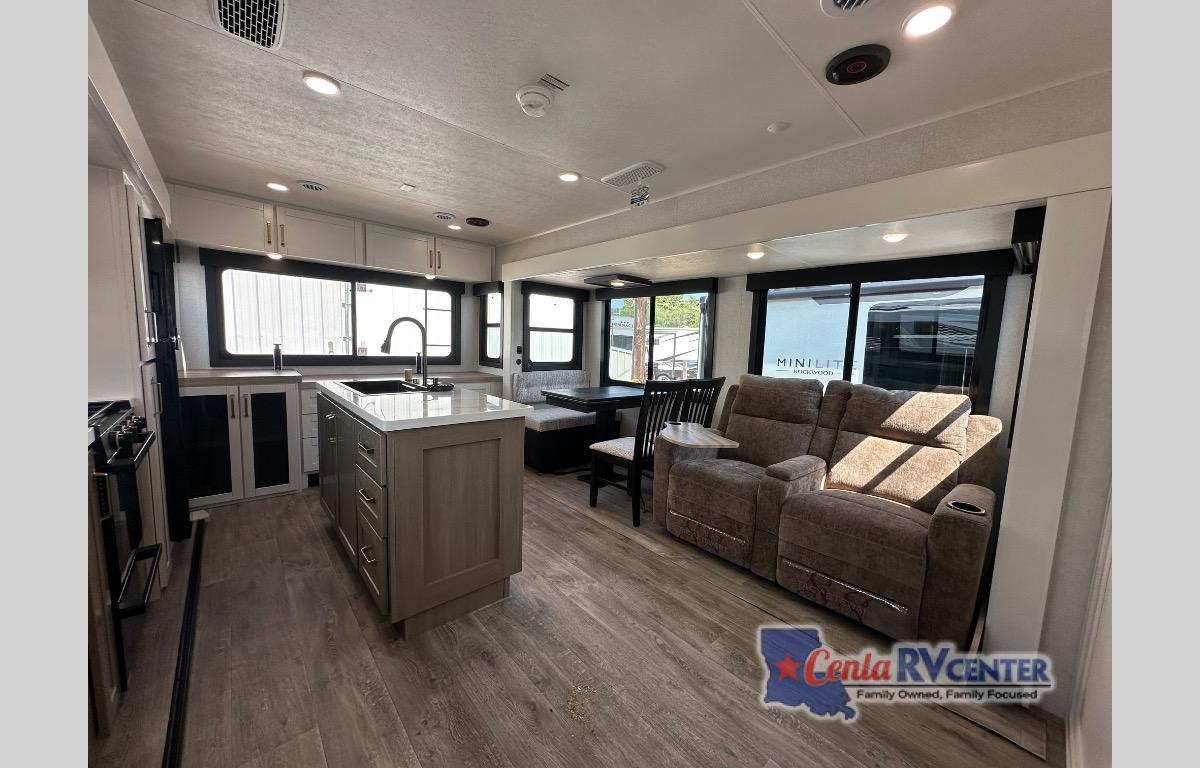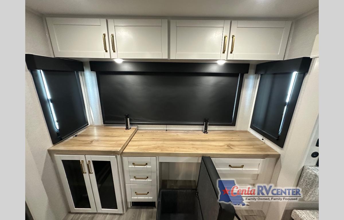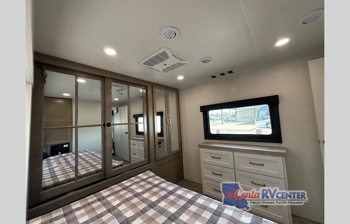 You will feel right at home camping in this travel trailer! It features a front private bedroom with an Olympic queen bed slide for more interior space, a dresser, a front wardrobe to hang your clothes, and a wardrobe with washer and dryer prep. Start each morning getting squeaky clean in the full bathroom with the shower, then head to the kitchen to fry up some eggs on the stainless steel range. The kitchen island provides more counter space to prep meals, and there are two pantries for dry goods and snacks. There is also a table and chairs with a bench seat plus a tri-fold sofa within the large slide out. And a desk with a bench seat lets you get some work done!