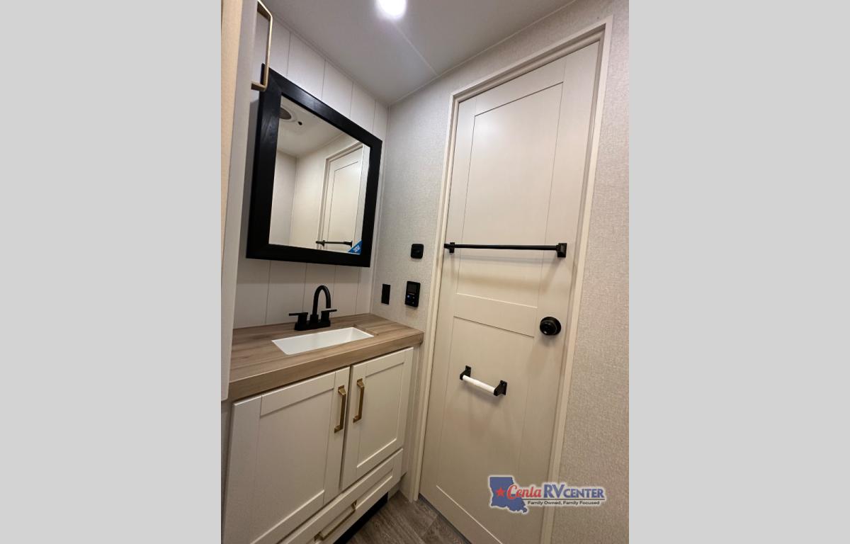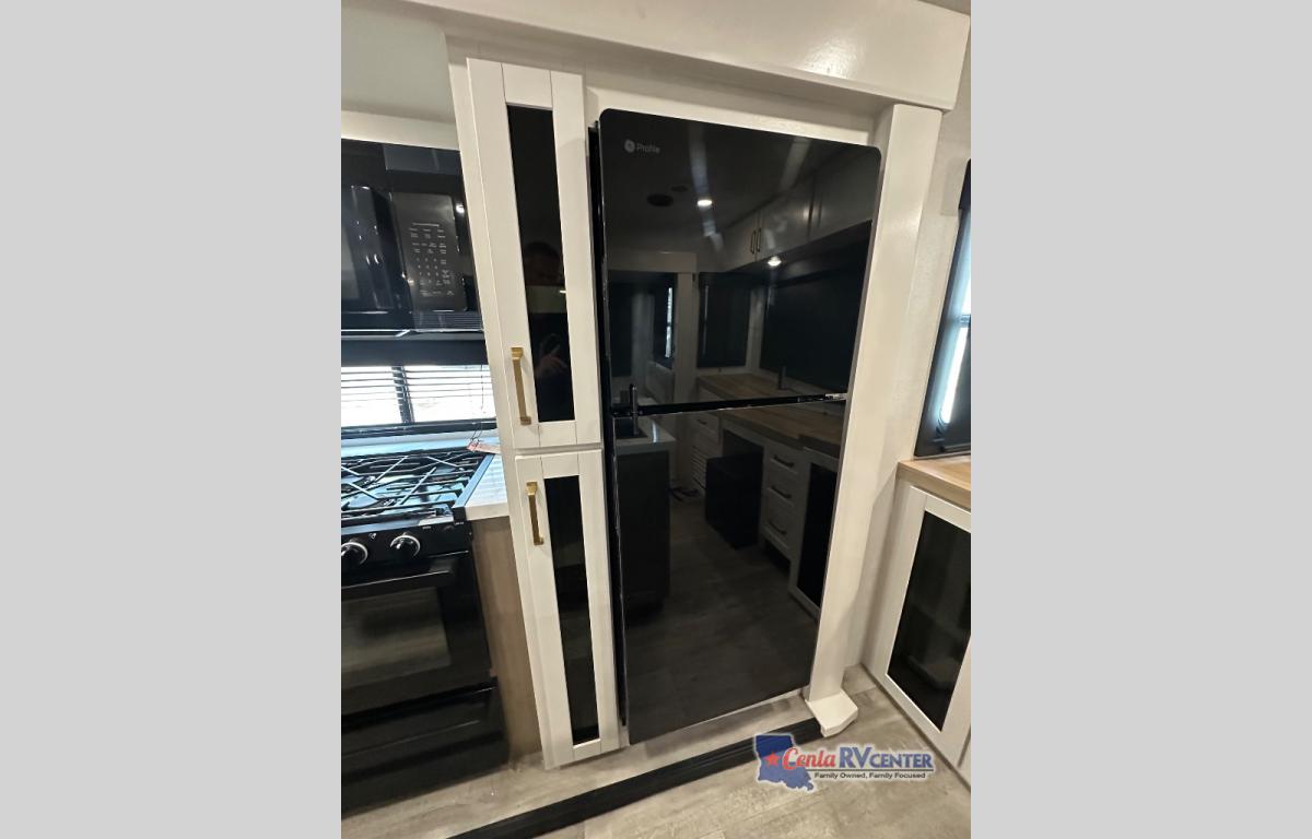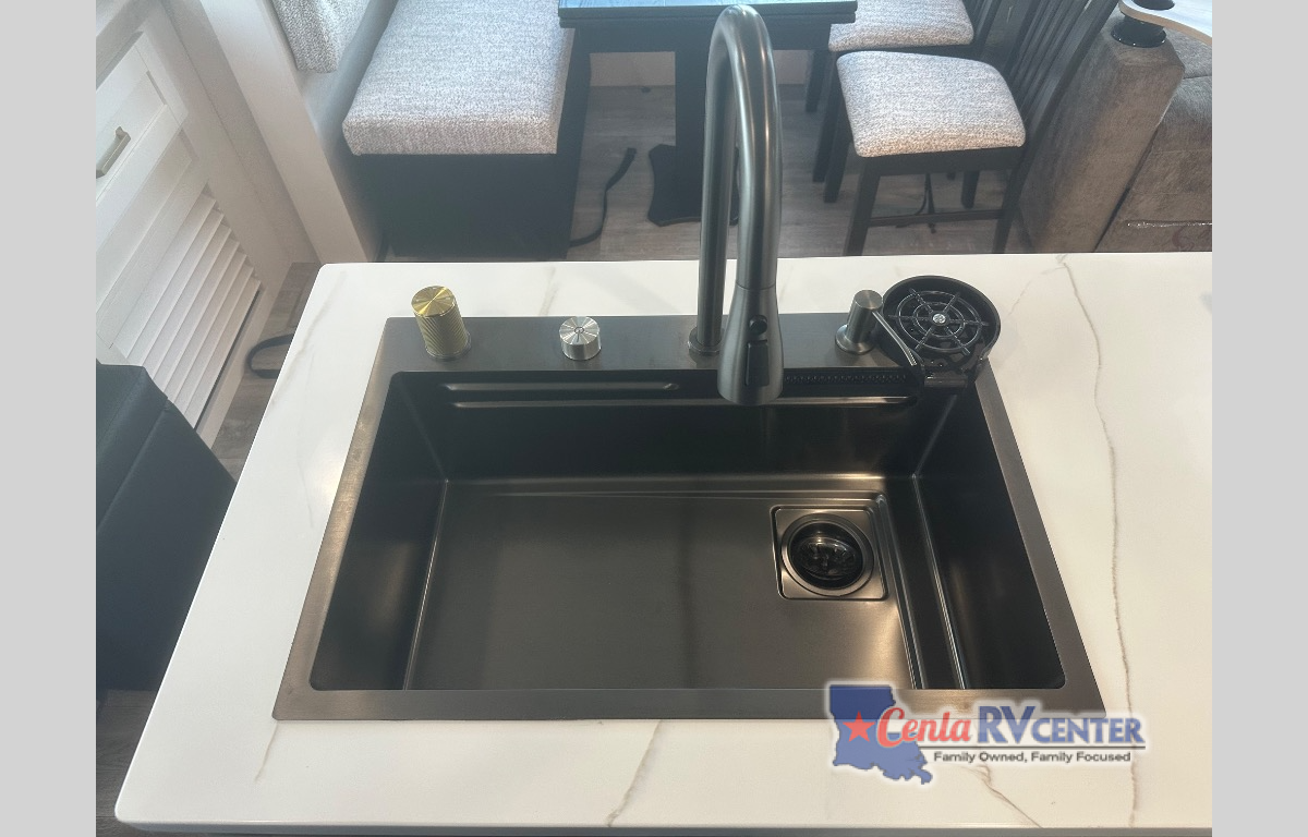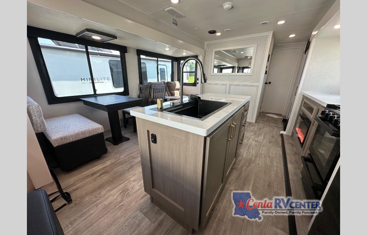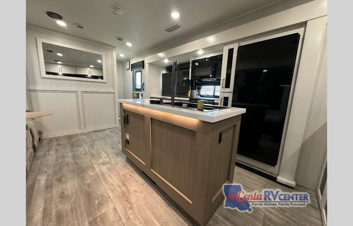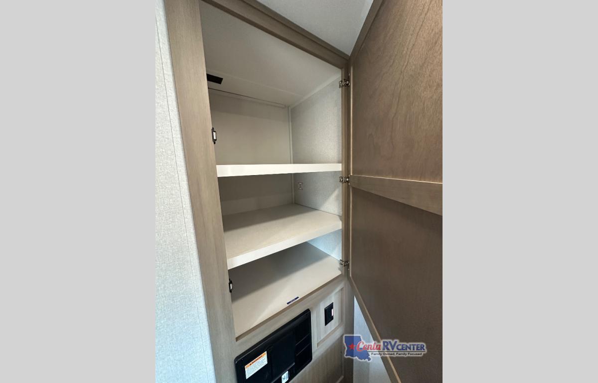 You will feel right at home camping in this travel trailer! It features a front private bedroom with an Olympic queen bed slide for more interior space, a dresser, a front wardrobe to hang your clothes, and a wardrobe with washer and dryer prep. Start each morning getting squeaky clean in the full bathroom with the shower, then head to the kitchen to fry up some eggs on the stainless steel range. The kitchen island provides more counter space to prep meals, and there are two pantries for dry goods and snacks. There is also a table and chairs with a bench seat plus a tri-fold sofa within the large slide out. And a desk with a bench seat lets you get some work done!
