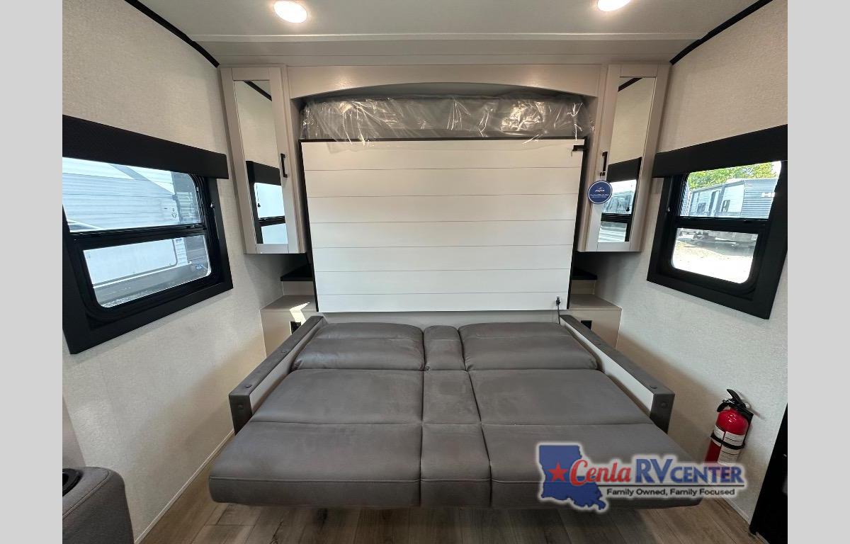 If you wish to escape the hustle and bustle of everyday life then you need this travel trailer! It features a front 60" x 75" Murphy bed with wardrobes on either side for bedtime and a jackknife sofa during the day. You can play games at the booth dinette after enjoying a delicious meal prepared with the three burner cooktop or relax at the theater seating with table trays and enjoy the LED TV. The rear corner bathroom has a shower with a skylight for you to get cleaned up in, as well as a linen closet to store your towels. There is exterior storage space to keep your outdoor gear, a 15' power awning to protect you from the elements.
