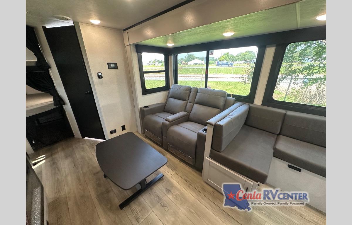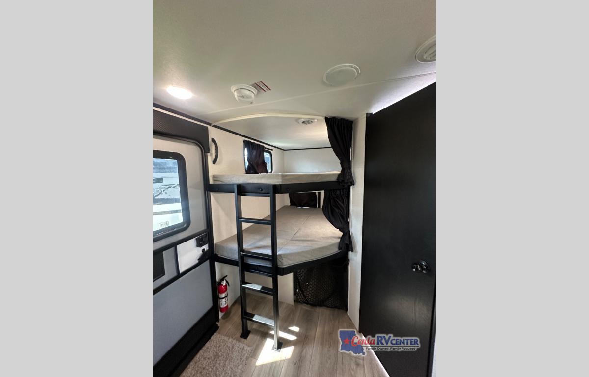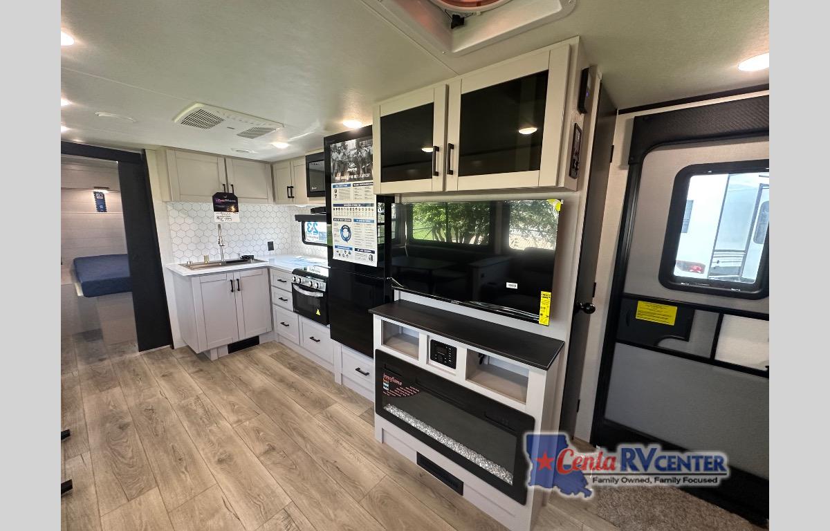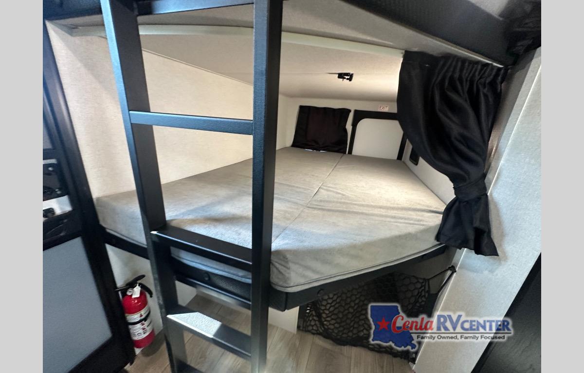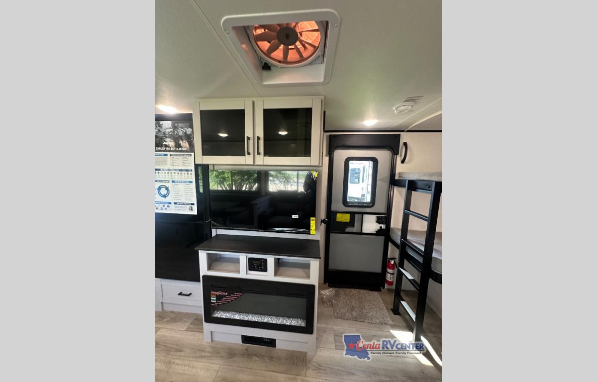 Get out and experience new campgrounds with this spacious trailer that offers a slide out tri-fold sofa and U-shaped dinette giving you dining, relaxing and sleeping space as well as more interior floor space to move from the front to the back. There is even an entertainment center here and an optional fireplace to make it more cozy. The cook will love the choice of making meals inside with full amenities or on the outside kitchen when relaxing under the 21' power awning with LED lights. You will appreciate your own space in the front private bedroom with a queen bed, dual wardrobes and nightstands, plus one of the dual entry doors. This model also includes double-size bunks with flip-up storage and a kayak door to easily pack in camp gear!