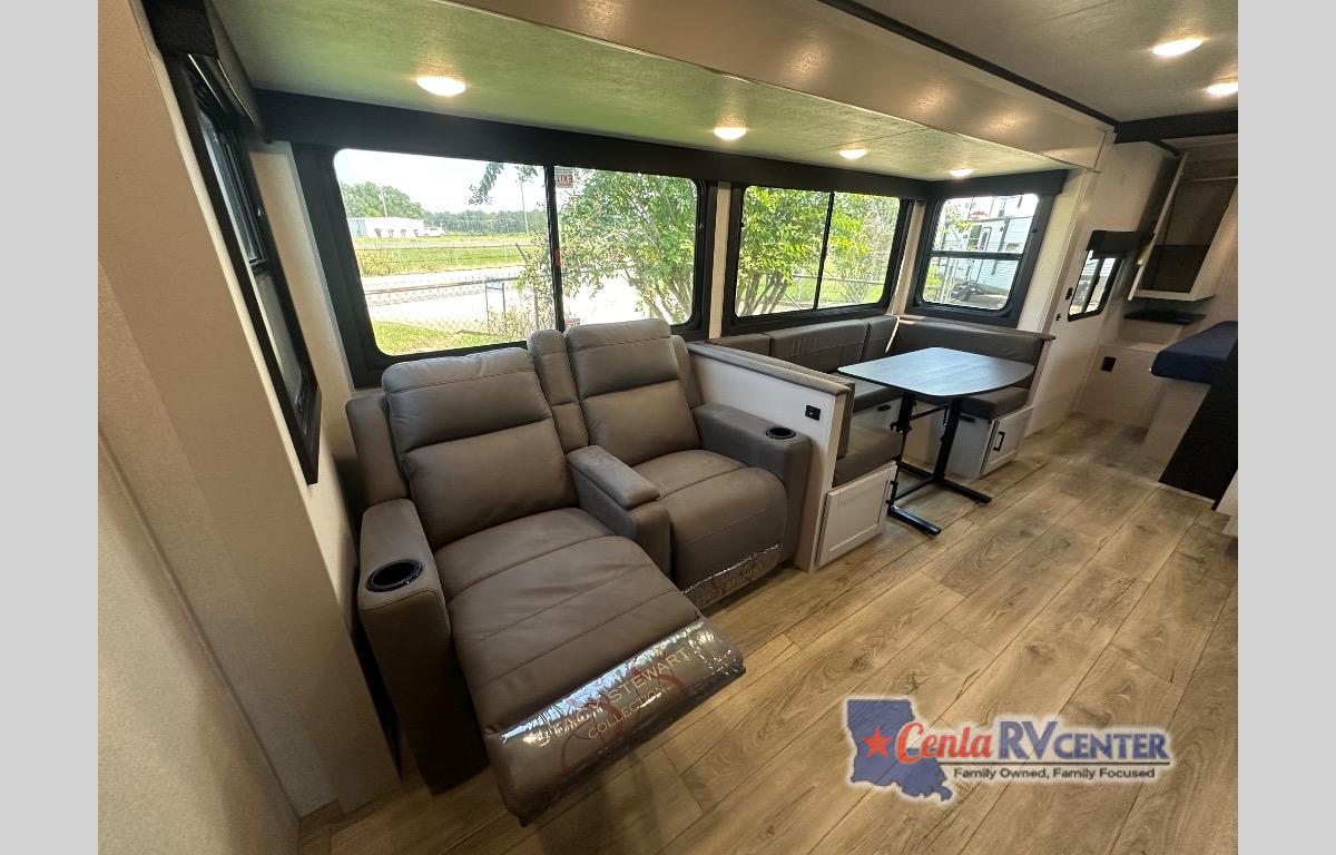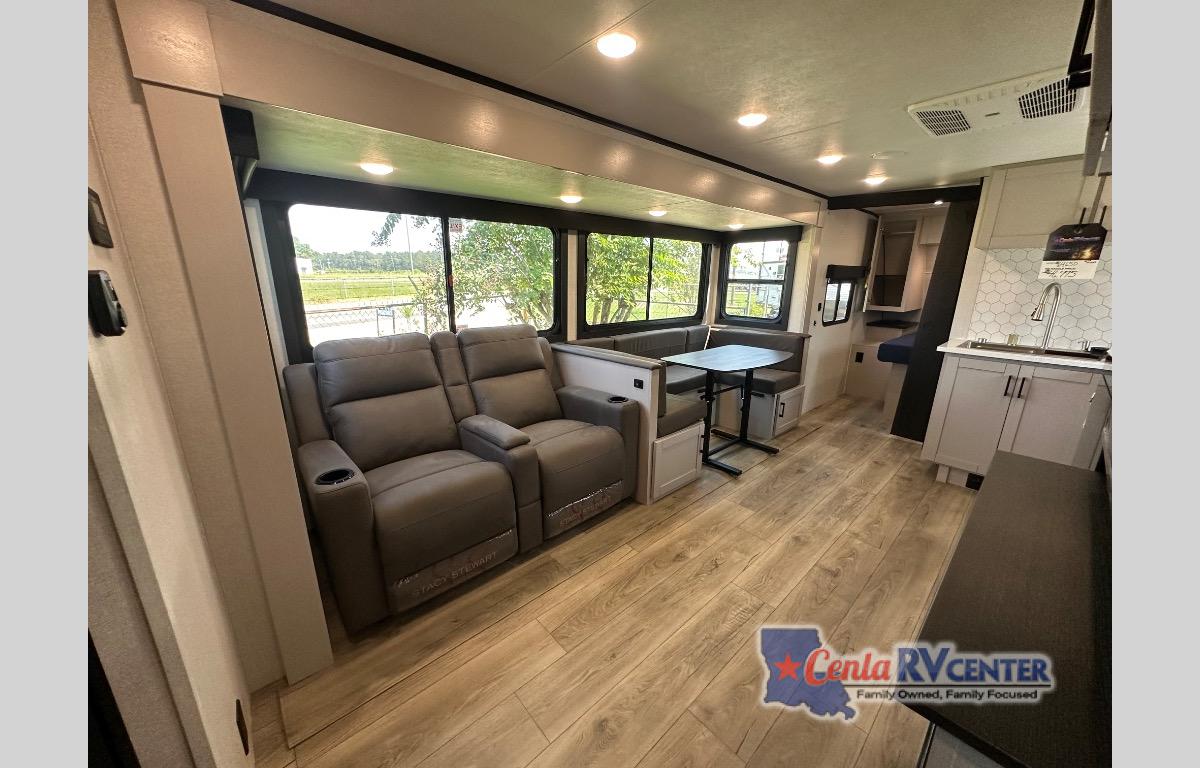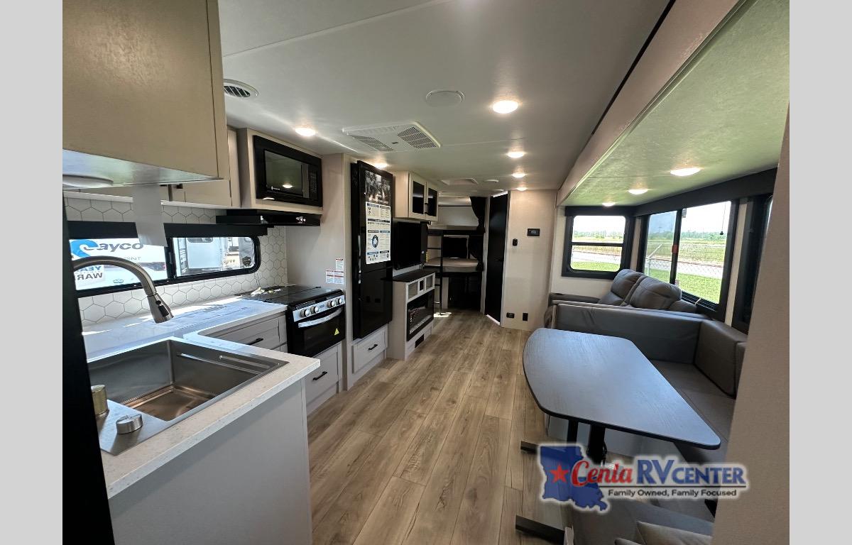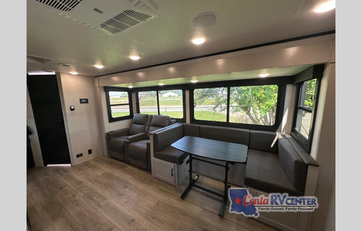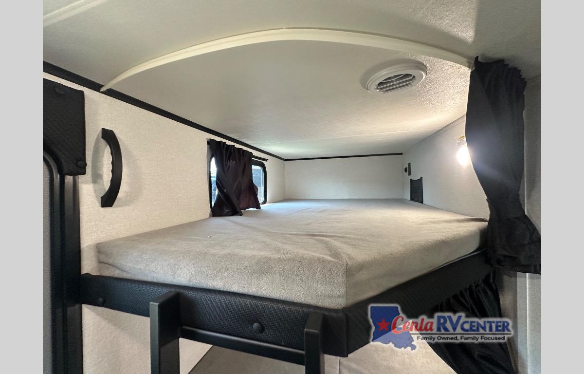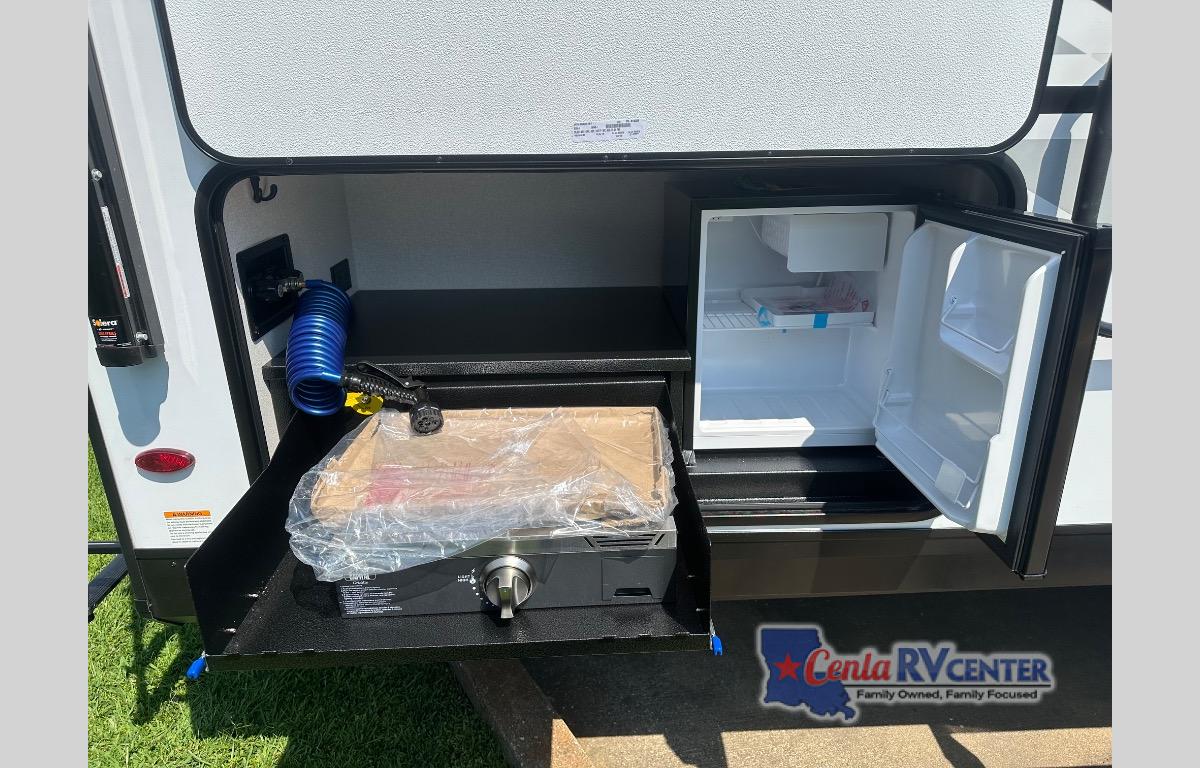 Get out and experience new campgrounds with this spacious trailer that offers a slide out tri-fold sofa and U-shaped dinette giving you dining, relaxing and sleeping space as well as more interior floor space to move from the front to the back. There is even an entertainment center here and an optional fireplace to make it more cozy. The cook will love the choice of making meals inside with full amenities or on the outside kitchen when relaxing under the 21' power awning with LED lights. You will appreciate your own space in the front private bedroom with a queen bed, dual wardrobes and nightstands, plus one of the dual entry doors. This model also includes double-size bunks with flip-up storage and a kayak door to easily pack in camp gear!