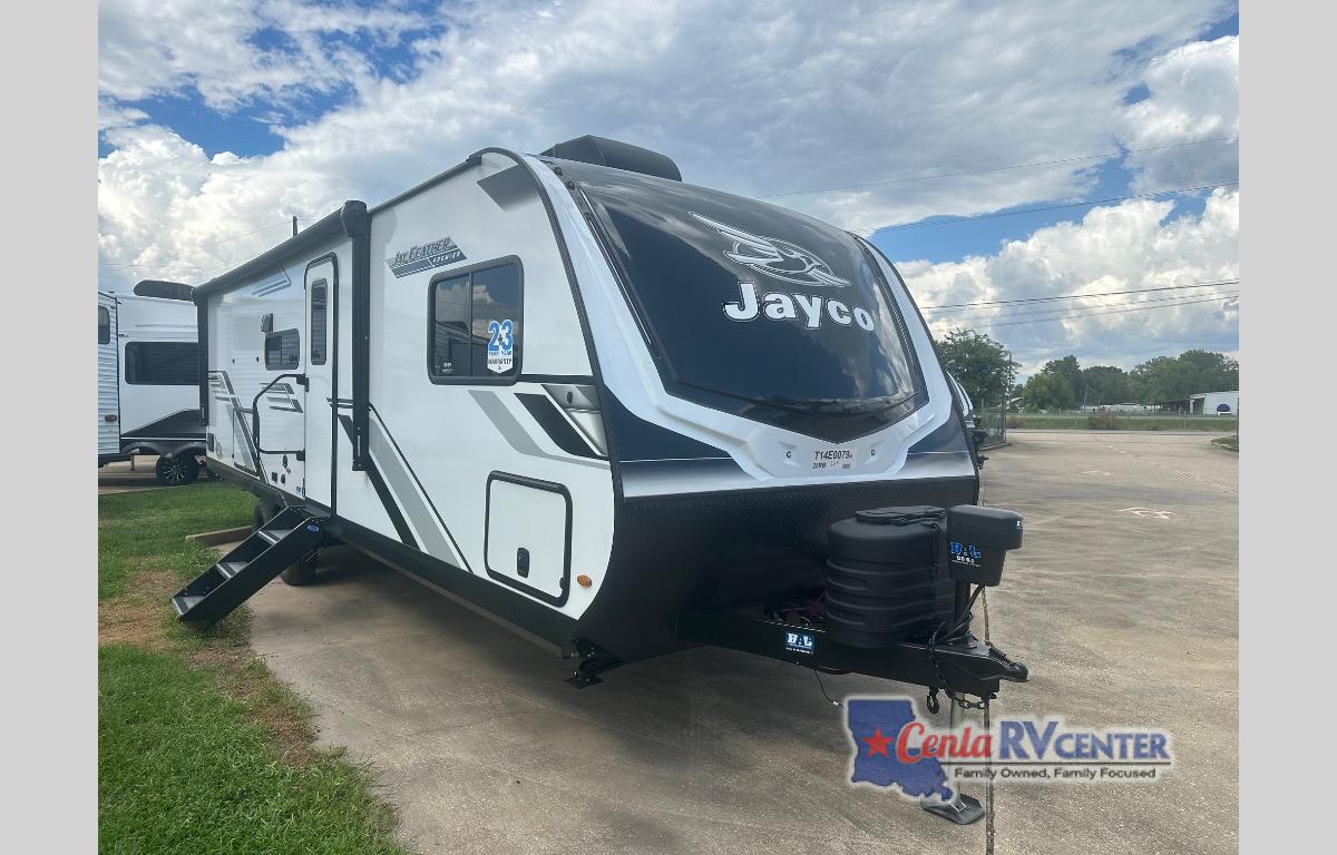 With any Jay Feather travel trailer by Jayco, you will enjoy lightweight towing, convenient exterior amenities, and at-home comforts inside! The Overlander 1 Solar Package included within the Jay Sport Package comes with a 200W solar panel and a 30-amp digital controller so you can enjoy some off-grid camping. There is also a modern graphics package with a dual-colored sidewall, LCI Solid Step fold-down aluminum tread steps on the main entry door, and Climate Shield 0 -100° F tested weather insulation package that will allow you to camp in all sorts of climates. The Customer Value Package will make time outdoors easier than ever with a power tongue jack and a Rock Solid stabilizer system, plus American-made nitro-filled Goodyear tires with self-adjusting electric brakes. More exterior features include a Keyed-Alike locking system, marine grade exterior speakers, a Magnum Truss roof system, and the list goes on! And we haven't even touched on the interior comforts, like the residential style seamless countertops and vinyl flooring throughout, decorative backsplash, handcrafted hardwood door/drawer fronts, and multiple USB charging ports to keep you going!