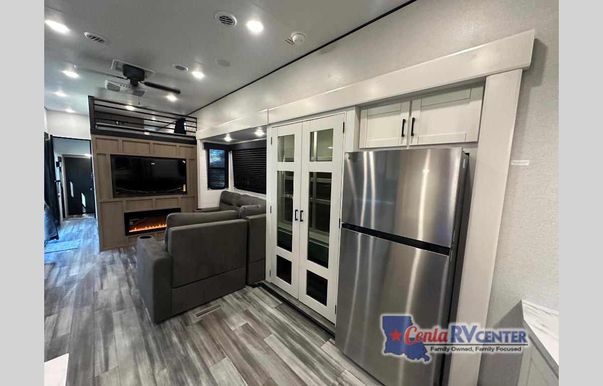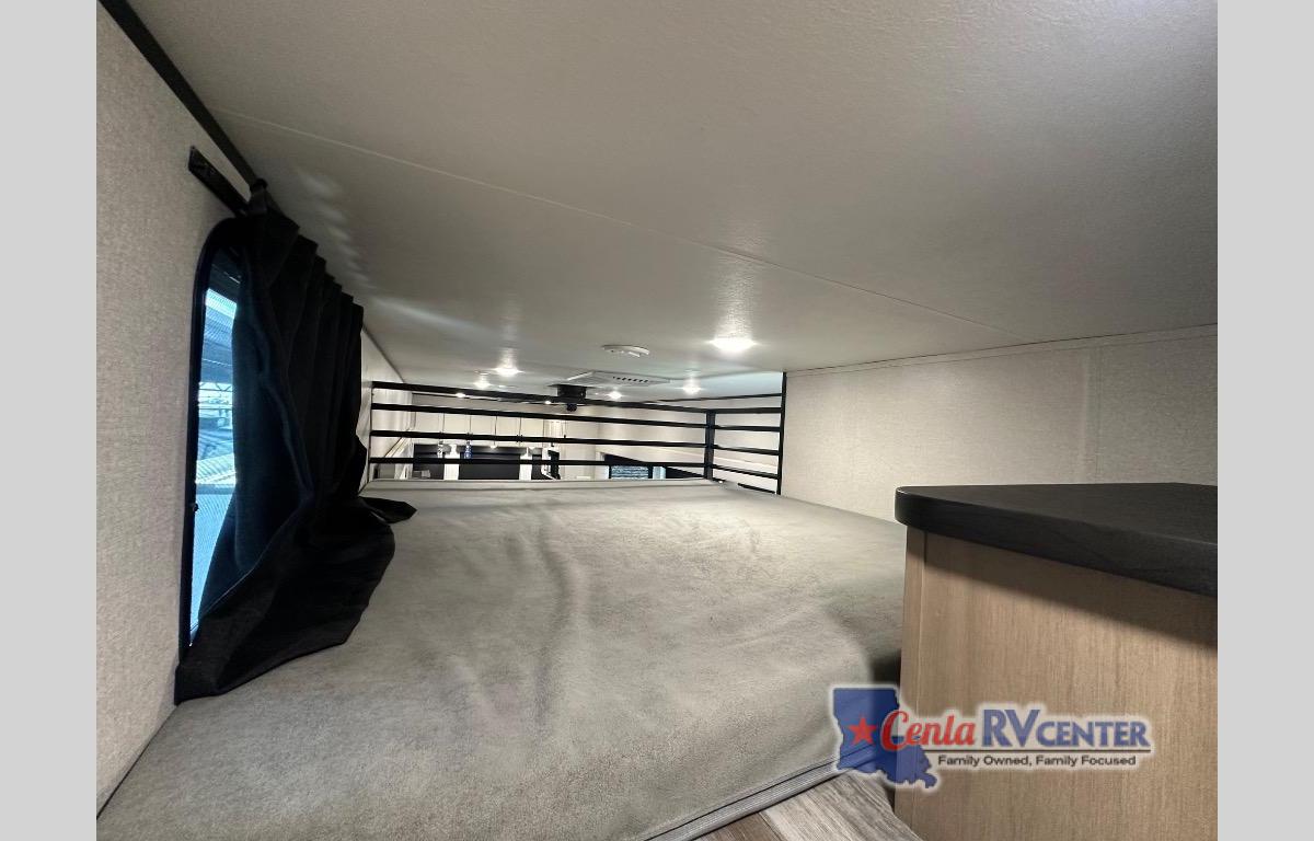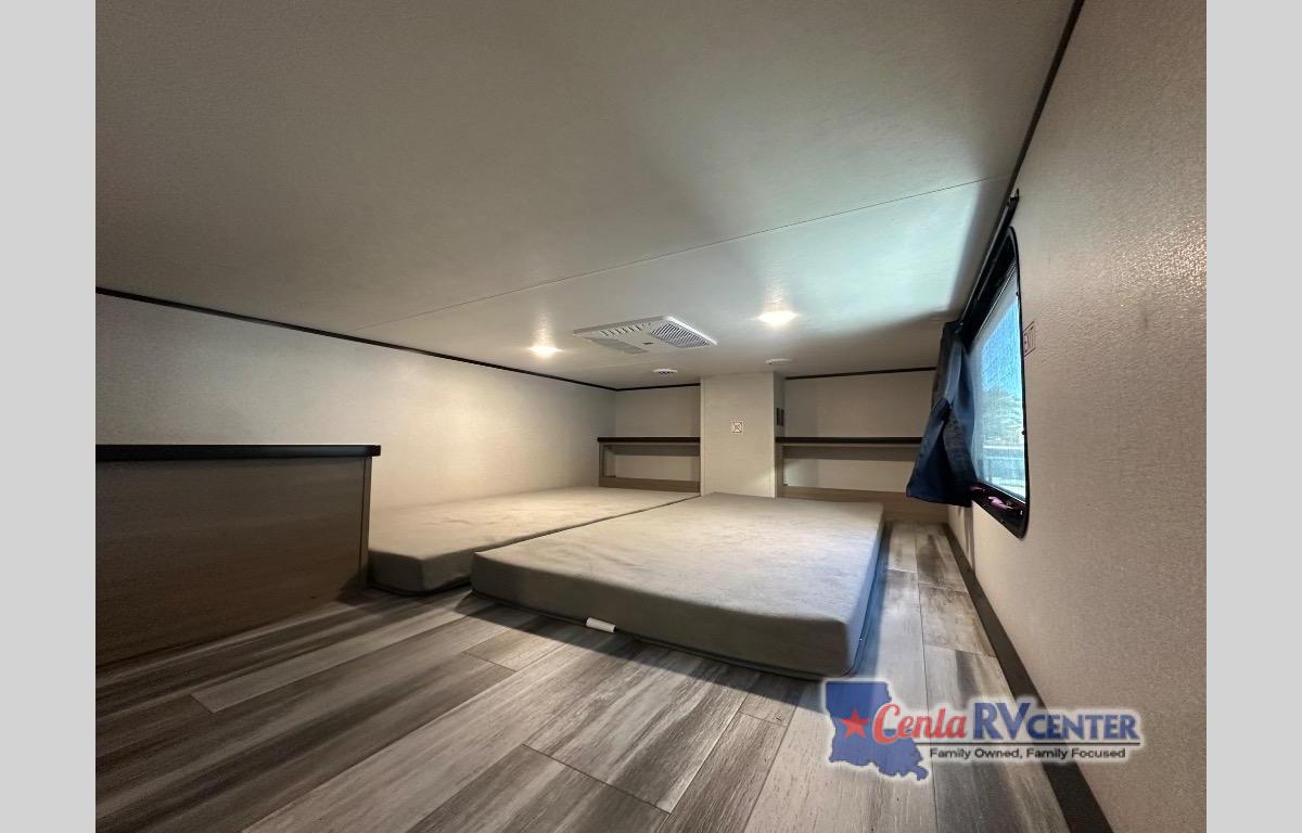 It won't be hard to find comfort in this spacious trailer for eight! The front kitchen features ample counter space to prep meals plus a residential refrigerator and double door pantry for food storage! You can dine at the table and chairs with a bench, then head to the living area to relax on the tri-fold L-lounge with a recliner on rollers. Across from the sliding patio doors, you'll find the spacious full bath, and the steps next to the bath lead to the double loft areas. The little ones will have three bunk mats to sleep on, two loft desks, shelves, and TV prep for added convenience! And don't overlook the spacious rear private bedroom with a queen bed slide, storage space, plus washer and dryer prep if you want the option to make laundry day easier!