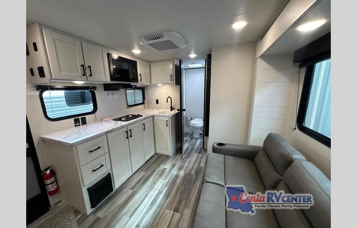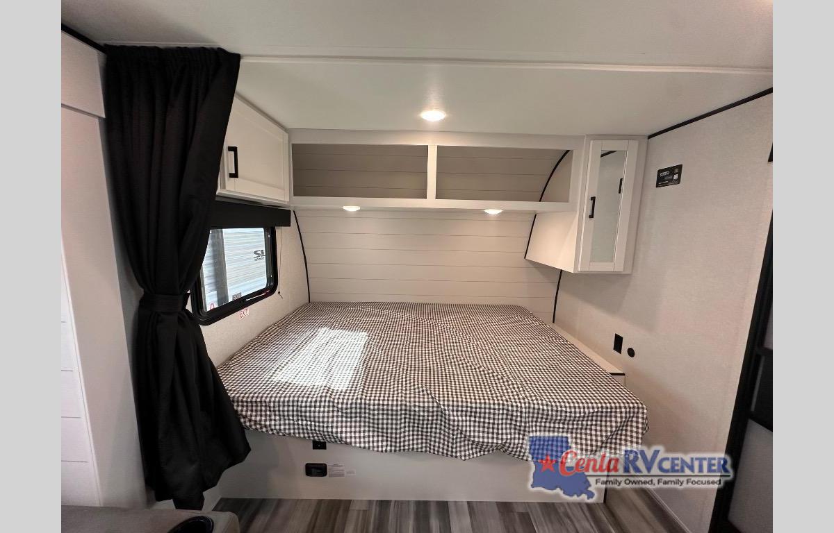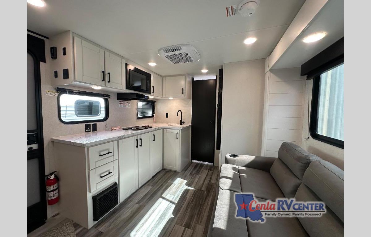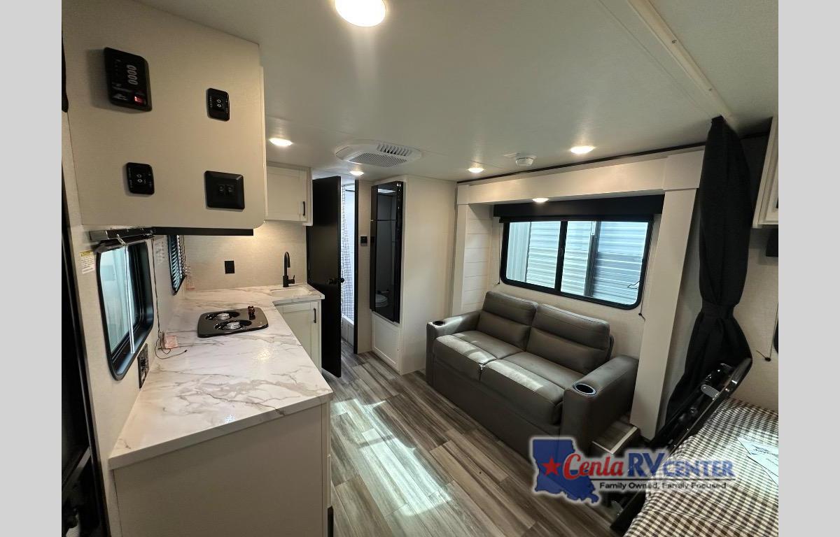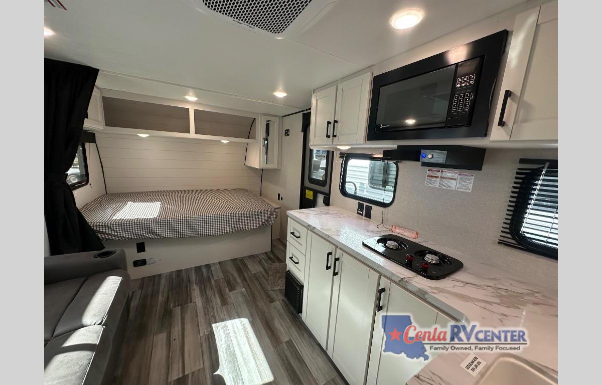 This single-axle couple's travel trailer is sure to bring you happiness at the campground. There is a front queen bed with a privacy curtain if you have a guest staying over on the jack-knife sofa, and the movable table in front of the sofa will provide more floor space when needed. A cooktop and microwave oven will let you make meals each day, and an 8 cu. ft. 12V refrigerator will be perfect for perishables. This model also includes a full rear bath with a shower, a toilet, plus a sink and a linen closet for clean towels.