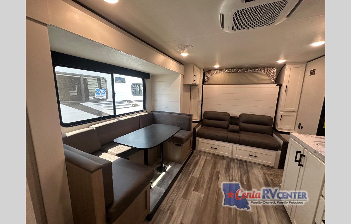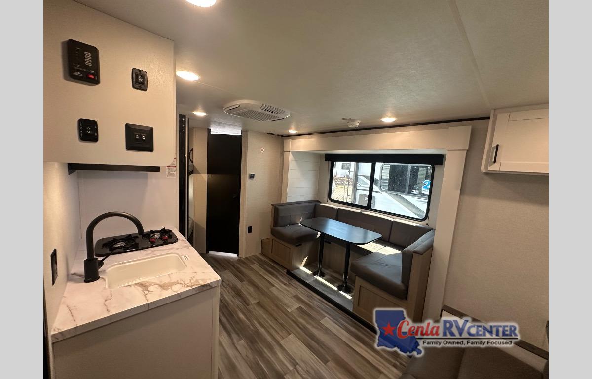 Any time spent in this travel trailer will be time well spent! You can easily sleep eight people each night thanks to the double-size bunks, front Murphy bed, and U-shaped dinette within the slide out. There is a full bath next to the bunks for easy nighttime use, and the linen closet will be perfect for clean towels. A cooktop, microwave oven, and 8 cu. ft. 12V refrigerator will let you cook and store food, and there is an overhead cabinet for spices or snacks!