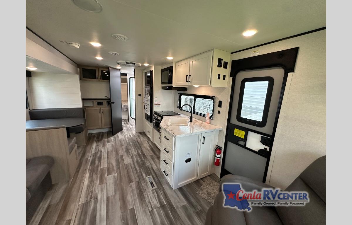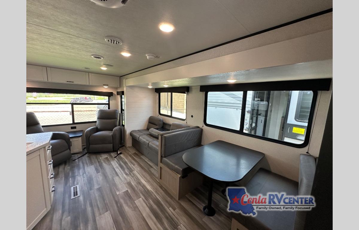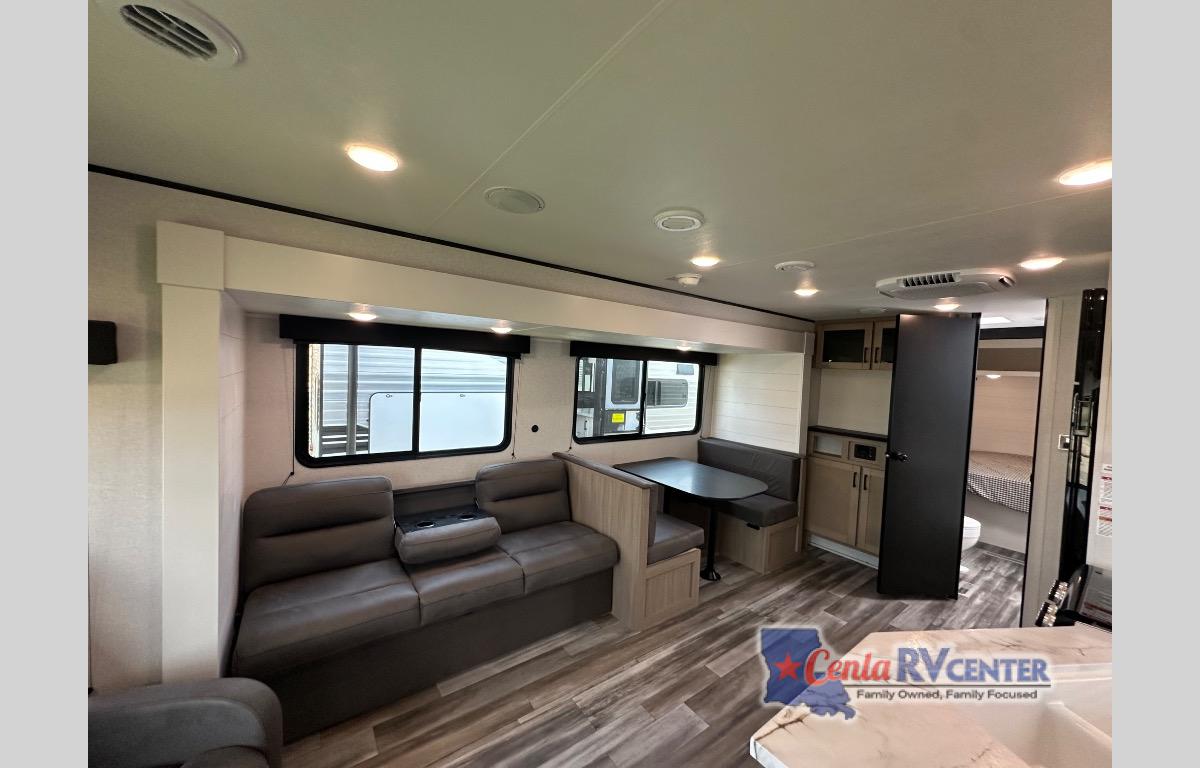 You can comfortably sleep up to six people in this trailer thanks to the RV queen bed in the front bedroom, plus the booth dinette and jack-knife sofa in the main living area! The chef of your crew will have a three burner cooktop and microwave oven to prepare meals, and everyone can store their favorite drinks in the 8 cu. ft. 12V refrigerator. The walk-through bath is spacious and includes a radius shower, toilet, a sink, and linen closet and is the full width of the unit. The outside storage will let you bring along camp chairs and games, fishing poles and more, plus the 18' 3" power awning with LED lights will create a nice place to gather in the evenings!