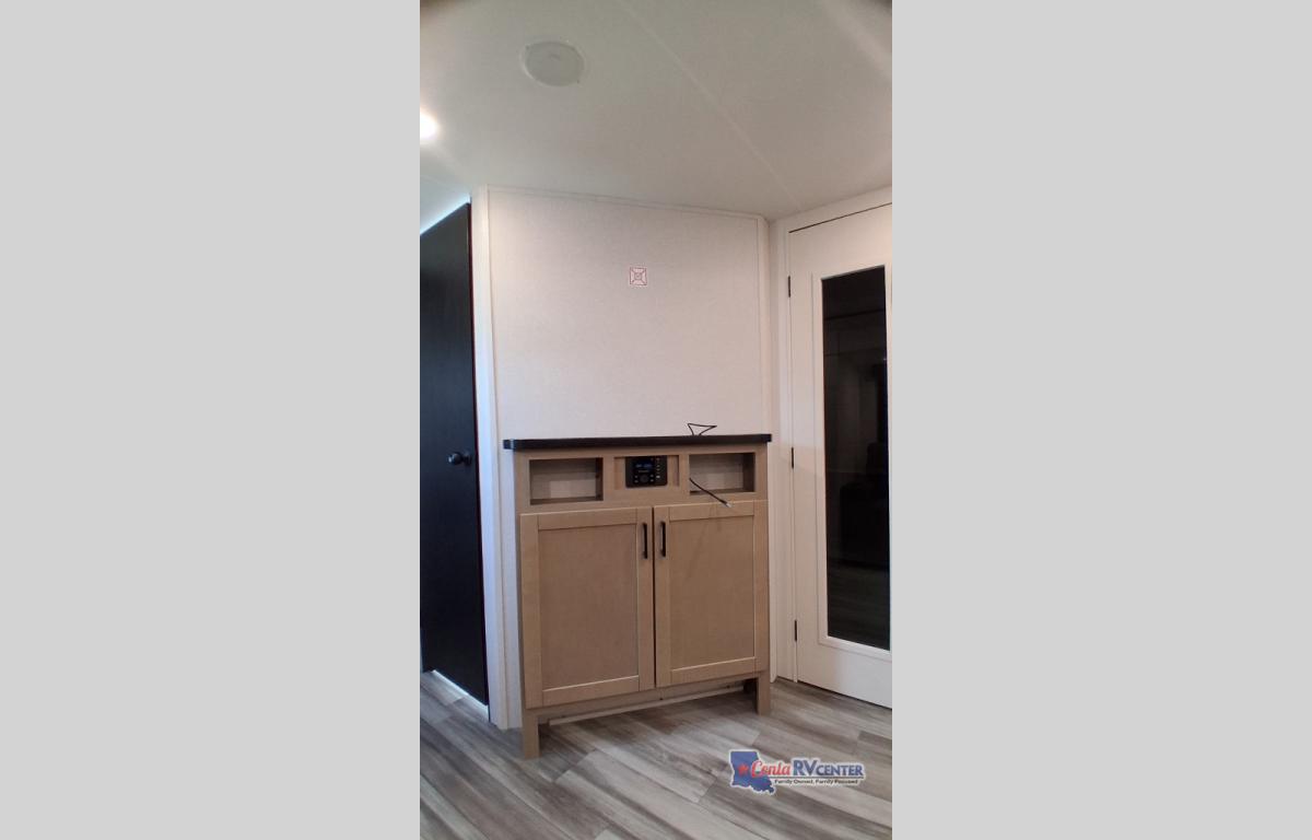 It's time to ditch that old tent and upgrade to this spacious travel trailer! There is a rear private bunkhouse includes a flip-up bunk over a 28" x 76" bunk, plus a bunk across the room and a wardrobe. You'll enjoy the front private bedroom all to yourselves with a queen bed and dual wardrobes, and the full bath is close by for easy nighttime use. A U-shaped dinette slide and sofa in the main living area provide your crew with space to relax and dine together, and the fully equipped kitchen lets you cook up your best meals. Outside, you'll find exterior storage, an 18' power awning, plus an outdoor refrigerator, shelf, and TV prep!