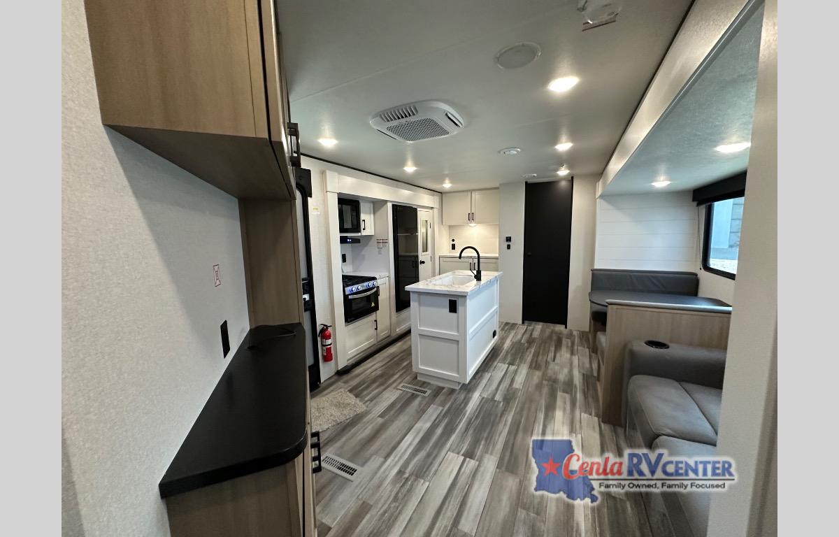 The whole gang can join along on camping trips in this triple slide out travel trailer! There is a rear private bunkhouse with a bunk bed and J-cube futon sofa below plus a second bunk bed and storage below to help keep this space tidy. You'll find your own space in the front private bedroom, which also includes a queen bed and dual wardrobes. The middle kitchen and living room will be a favorite place to come together since there is a jack-knife sofa and booth dinette, a kitchen island, plus a fully-equipped kitchen to make meals each day. There is also an exterior camp kitchen when you want fresh air!