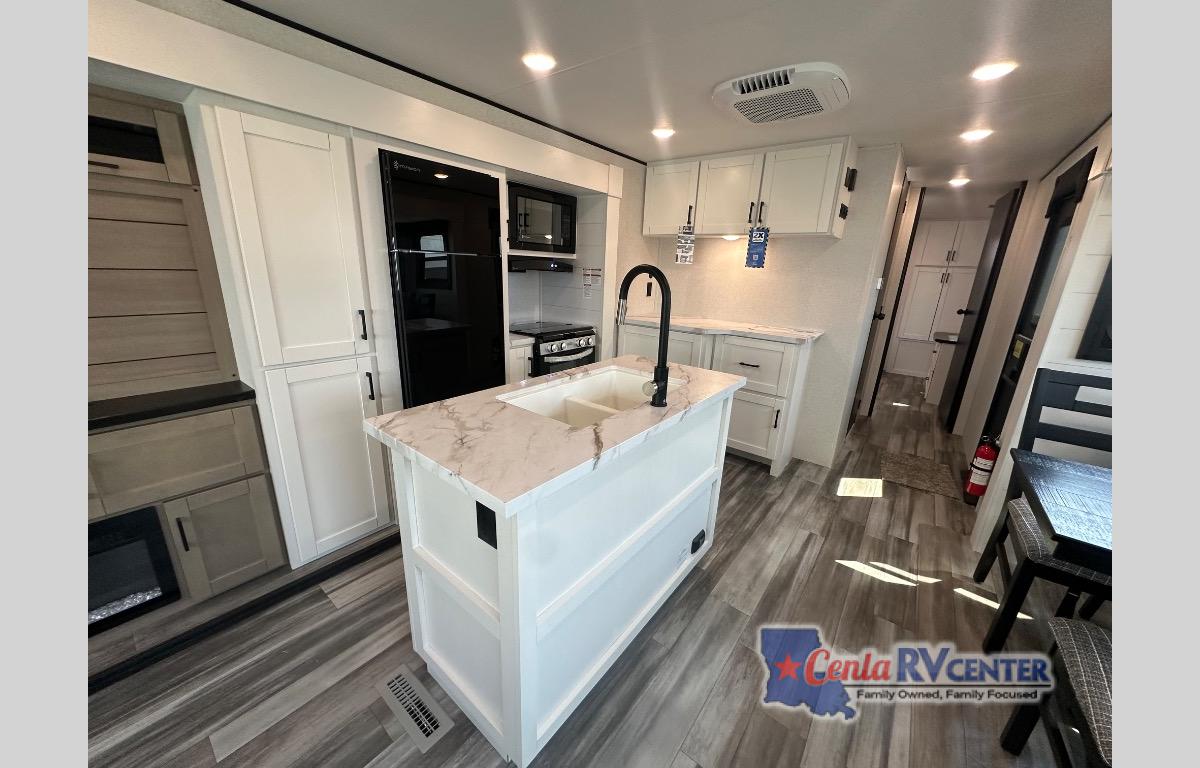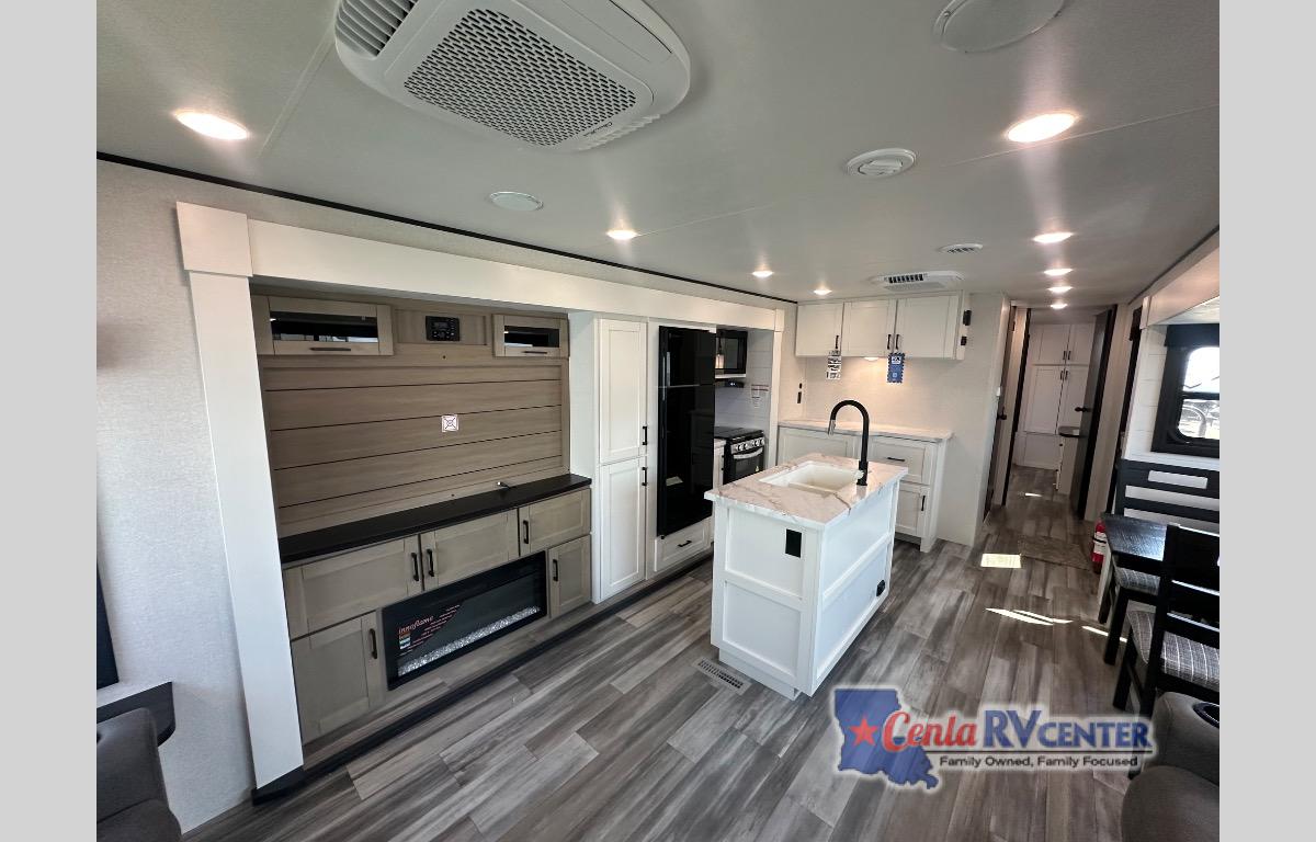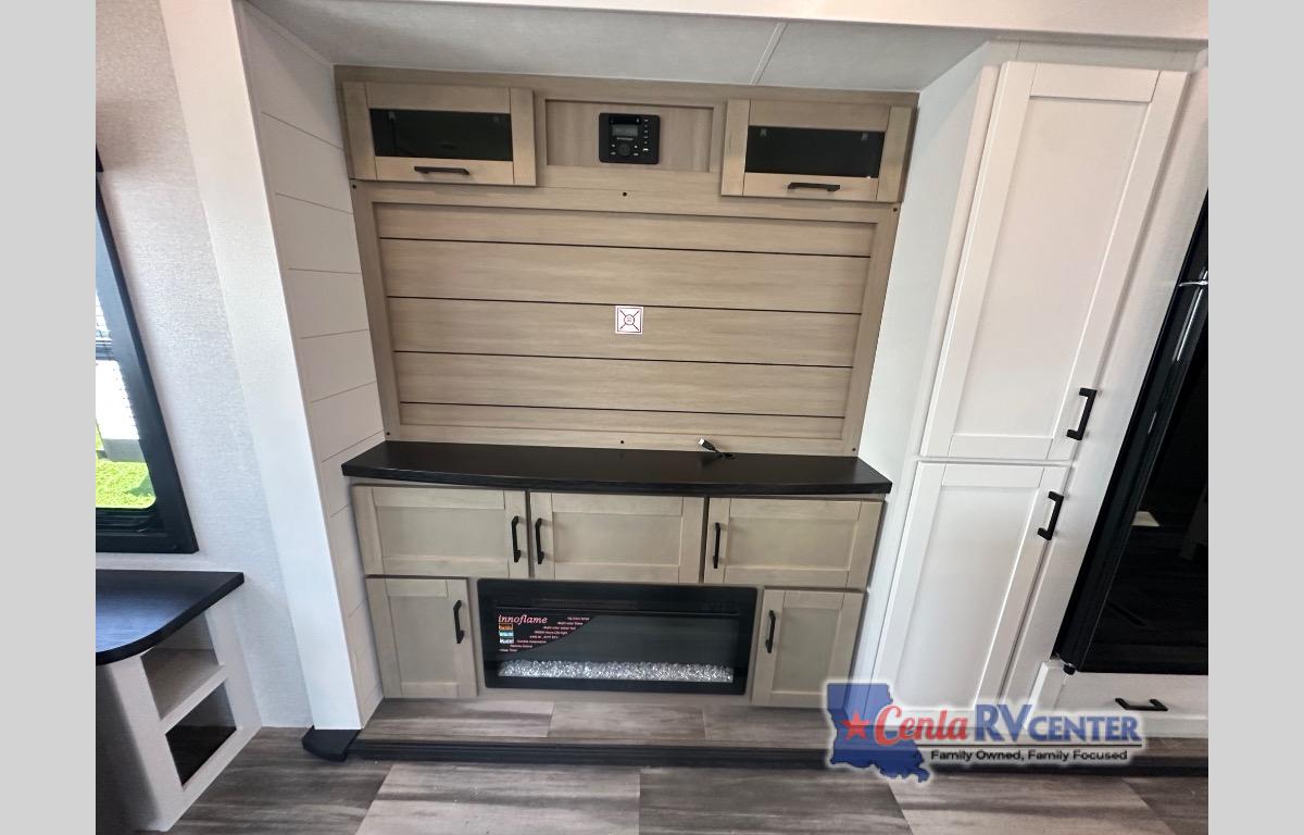 Enjoy a relaxing weekend getaway in this travel trailer! The dual entry bathroom with radius shower creates a front master suite with a queen bed slide, a dresser, and a front large wardrobe with storage space plus washer and dryer prep. The chef will have an easy time preparing their best home cooked meals with the kitchen island, hutch, three burner cooktop, and 12V refrigerator. Enjoy your meals at the booth dinette then play a card game or transform it into an extra sleeping space. The rear living area has a rear Jack-knife sofa for a quick afternoon nap and theater seating across from the entertainment center with a fireplace for the perfect spot on movie night!