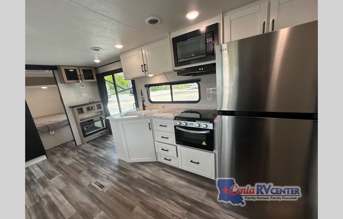 With two private bedrooms, everyone will have a comfortable place to sleep in this travel trailer! The front private bedroom has a 60" x 75" queen bed with wardrobes on either side and the rear private bedroom has a 60" x 80" queen bed slide with a dresser, a wardrobe, one of the exit/entrance doors, and an entrance into the walk-through bathroom which has a radius shower for everyone to stay squeaky clean. The patio doors not only make it easy to enter and exit the unit, but also bring in tons of natural lighting. After you have prepared a delicious home cooked meal, you can can head to the U-shaped dinette to enjoy it there comfortably then relax on the Jack-knife sofa across from the entertainment center!