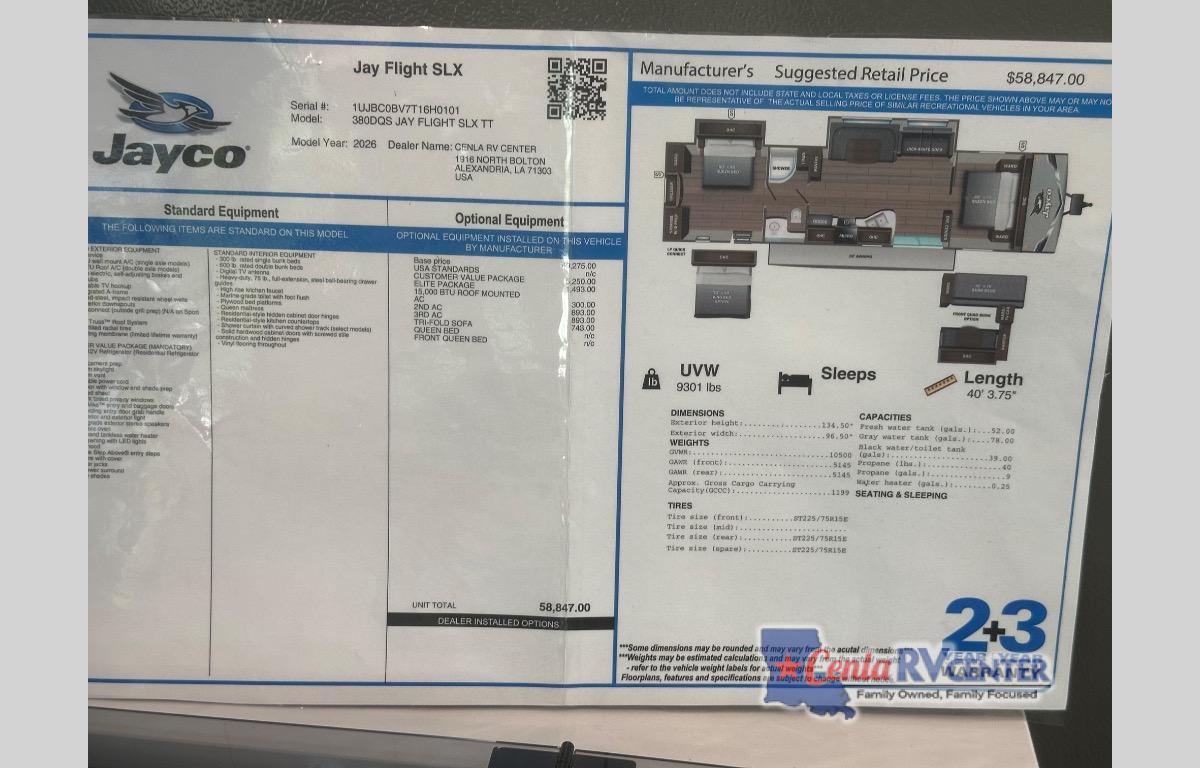 Cenla Camping Center is not responsible for any misprints, typos, or errors found in our website pages. Any price listed excludes sales tax, registration tags, and delivery fees. Manufacturer-provided pictures, specifications and features may be used as needed. Inventory shown may be only a partial listing of the entire inventory. Please contact us at 318-445-6981 for availability as our inventory changes rapidly. All calculated payments are an estimate only and do not constitute a commitment that financing or a specific interest rate or term is available.