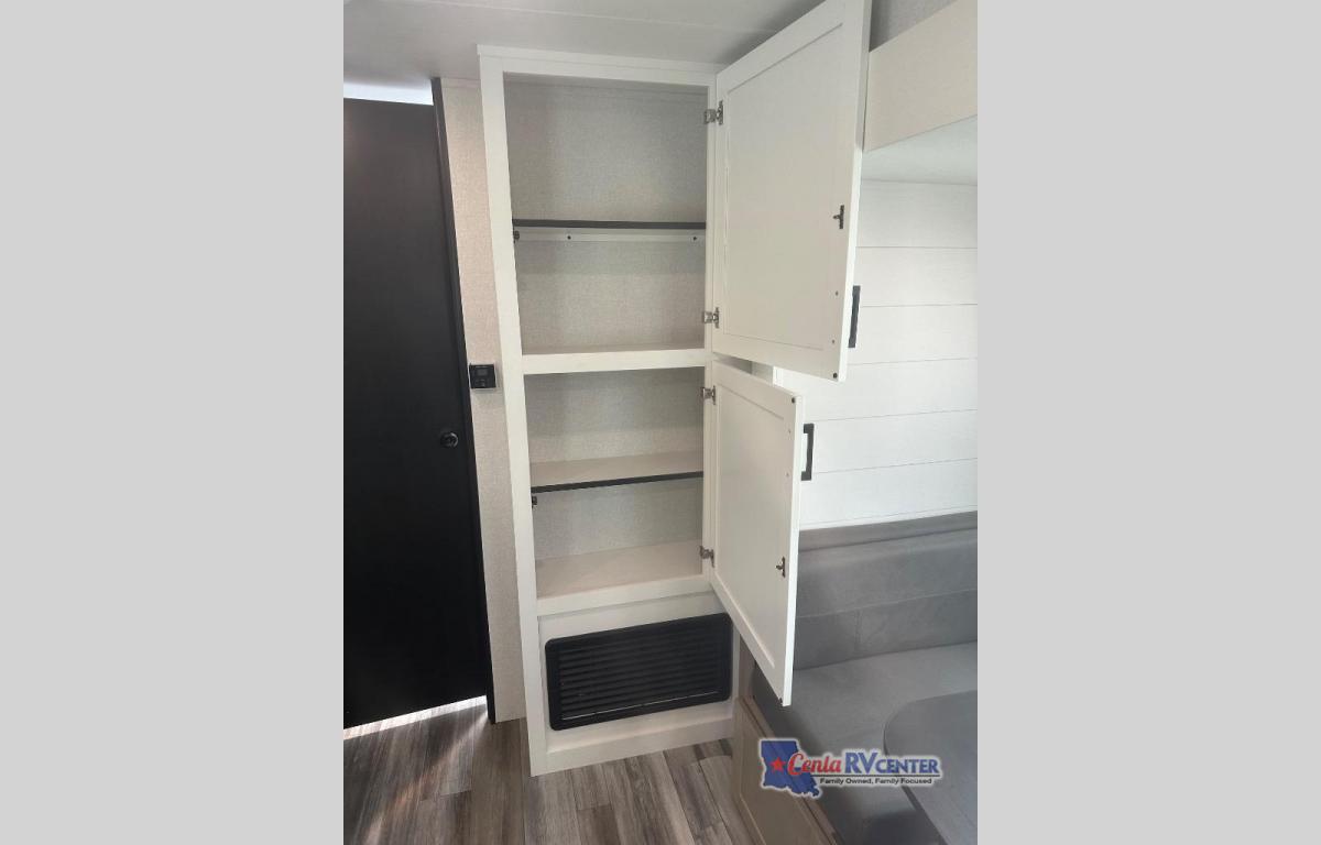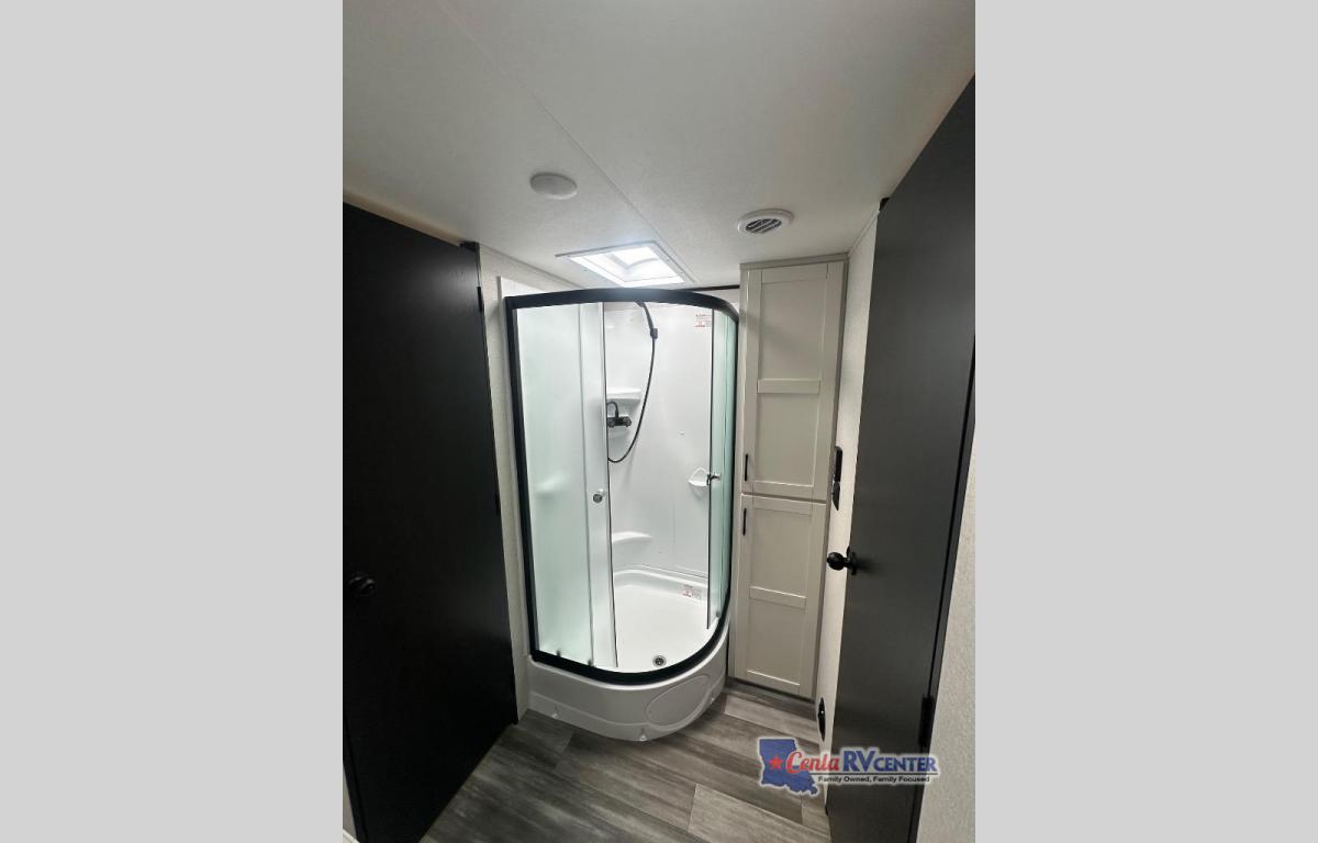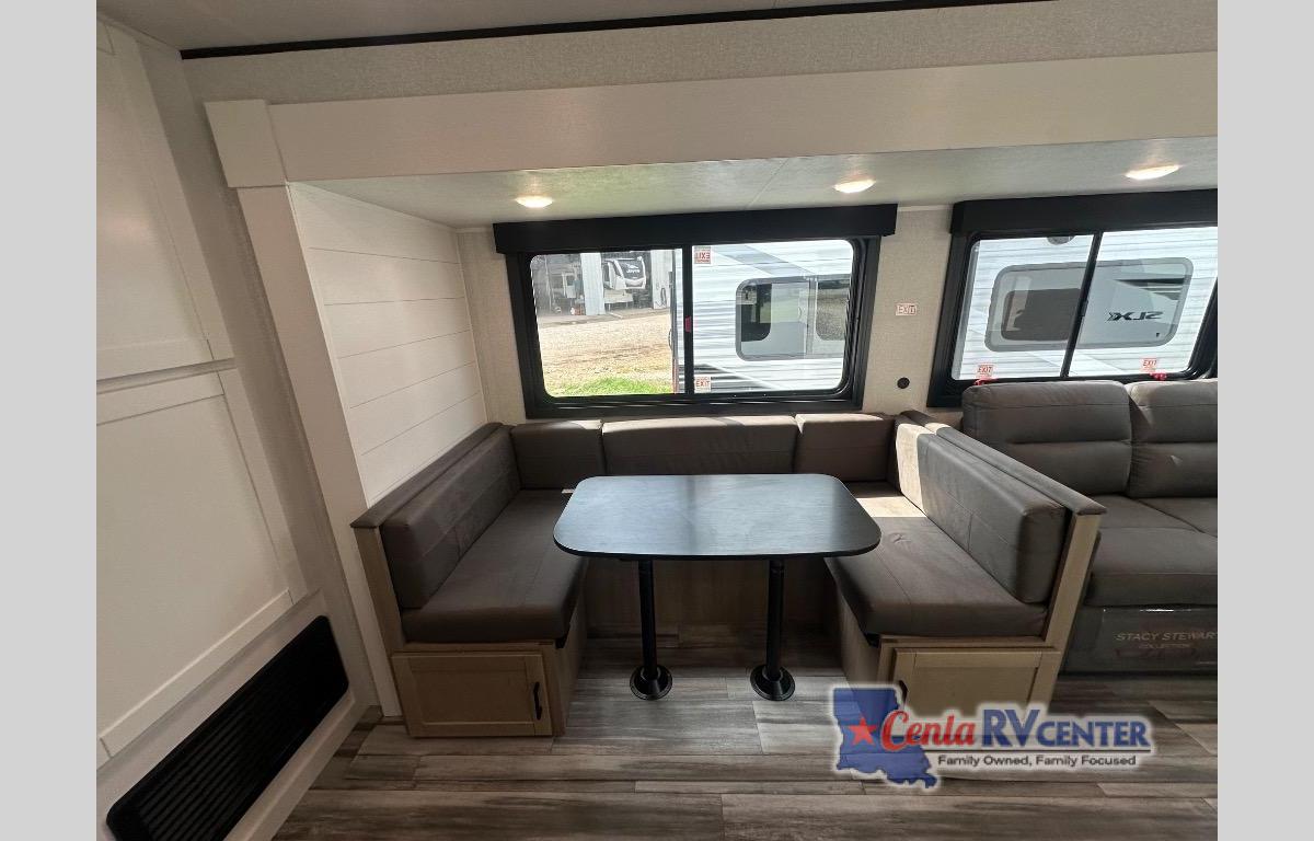 With two private bedrooms, everyone will have a comfortable place to sleep in this travel trailer! The front private bedroom has a 60" x 75" queen bed with wardrobes on either side and the rear private bedroom has a 60" x 80" queen bed slide with a dresser, a wardrobe, one of the exit/entrance doors, and an entrance into the walk-through bathroom which has a radius shower for everyone to stay squeaky clean. The patio doors not only make it easy to enter and exit the unit, but also bring in tons of natural lighting. After you have prepared a delicious home cooked meal, you can can head to the U-shaped dinette to enjoy it there comfortably then relax on the Jack-knife sofa across from the entertainment center!