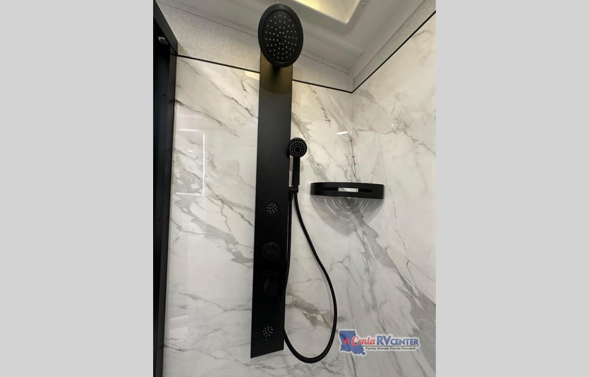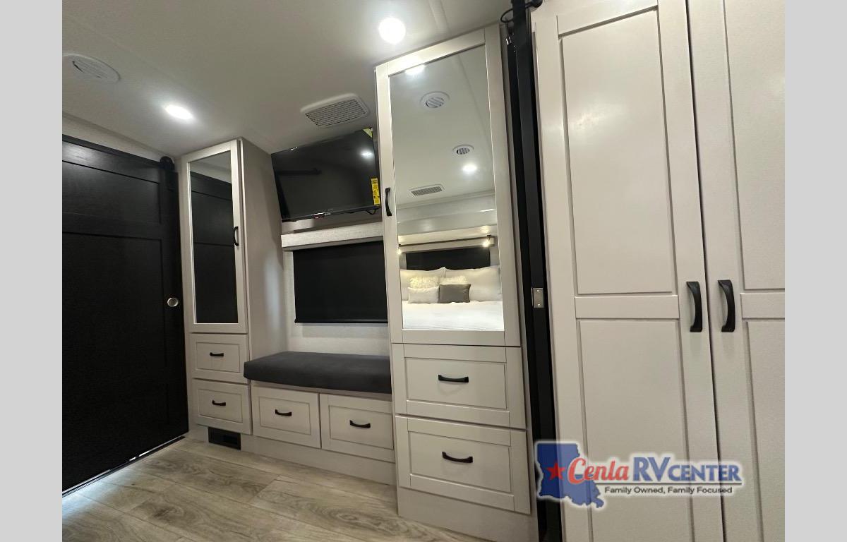 Entertainment can be found throughout this fifth wheel from the front living area with a 50" Smart LED HDTV with fully digital HDMI output and home entertainment system with subwoofer including a fireplace below that you can enjoy while relaxing on theater seats and two tri-fold sofas, a 32" TV in the middle kitchen and there is a bedroom 32" TV. You might even like to add the tailgate TV option along the exterior. Back inside the kitchen, the cook will love the center island, the pantry, the residential refrigerator, and the roll-top dinette. The half bath is a few steps away as an added convenience. The master bedroom includes a king bed slide, a bench, two wardrobes and a sliding door into the bathroom which offers two sinks, a space prepped for a washer/dryer option, and a walk-in shower. And don't forget about the exterior features such as the outside kitchen for more choices when making meals, the storage for your outdoor gear and chairs, and two awnings with integrated LED lighting.