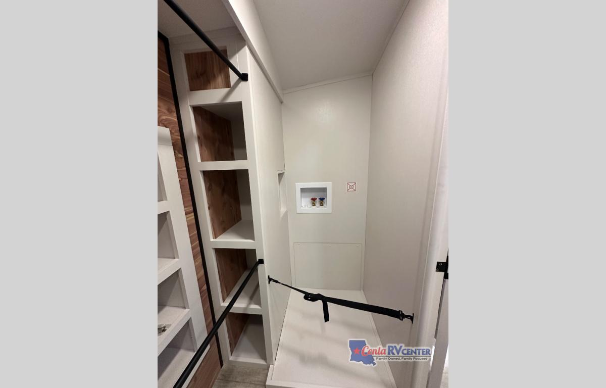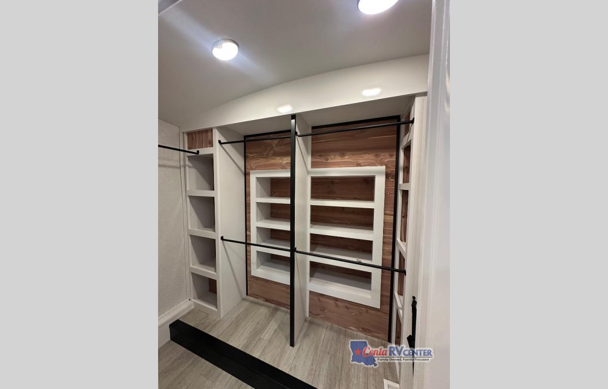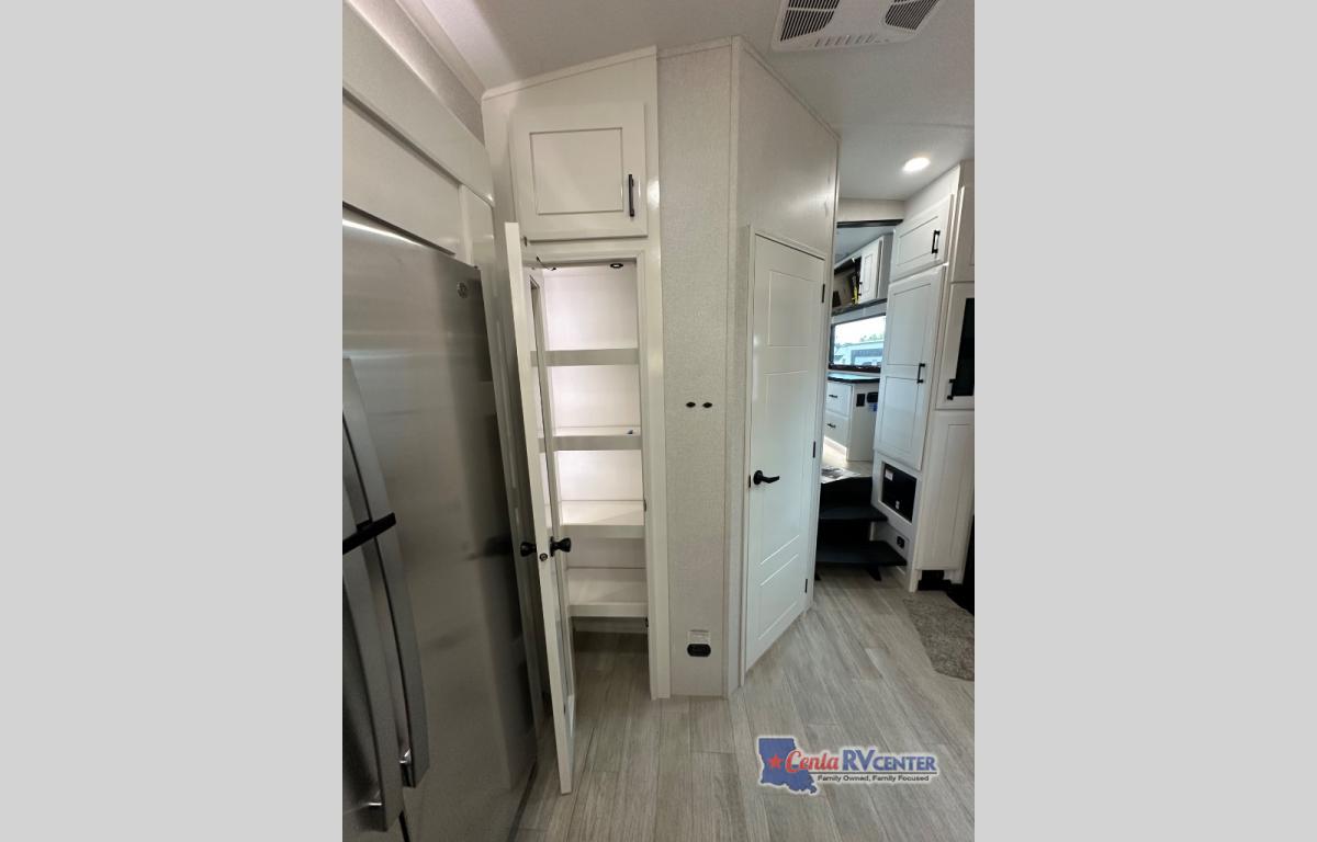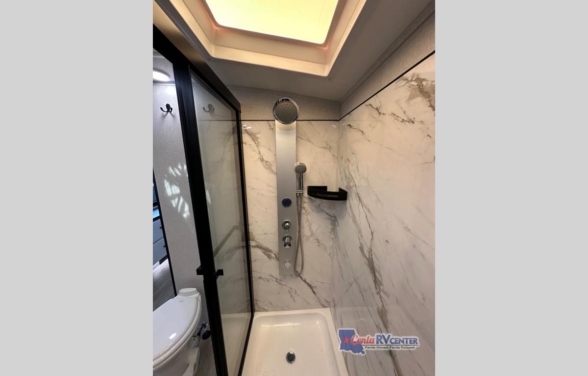 You can't go wrong with this fifth wheel that can sleep four! You will love how much space you have in the main living area thanks to the dual opposing slides, and there is a kitchen island here with a pull-out extension for added prep space. The convenient half bath is right off of the kitchen for quick restroom breaks, and you'll find a shoe garage and a wardrobe just as you enter the unit to keep the RV tidy. Head to the master bedroom for a rest on the king bed slide out, or you may want to watch a show on the 32" bedroom TV. The front master bath may be your favorite feature of this unit. Here, you'll find dual bath sinks, a walk-in shower with a seat, plus a spacious walk-in closet for your clothes. And don't overlook the exterior with its two power awnings, 32" exterior TV, and a Jayport with LP quick connect for your outdoor grill.