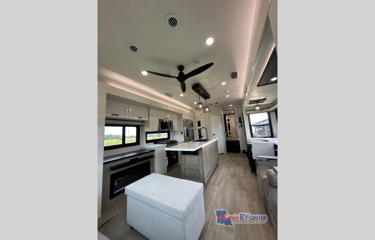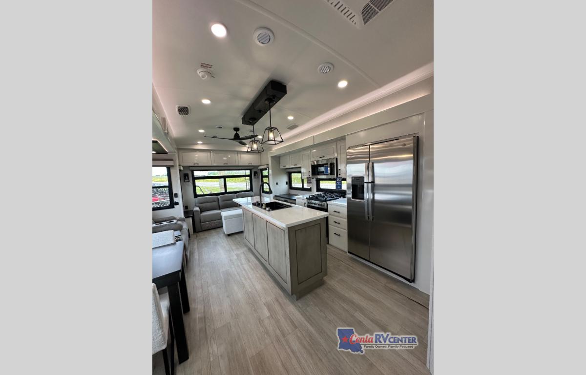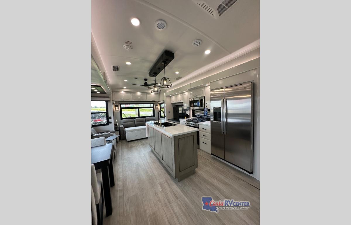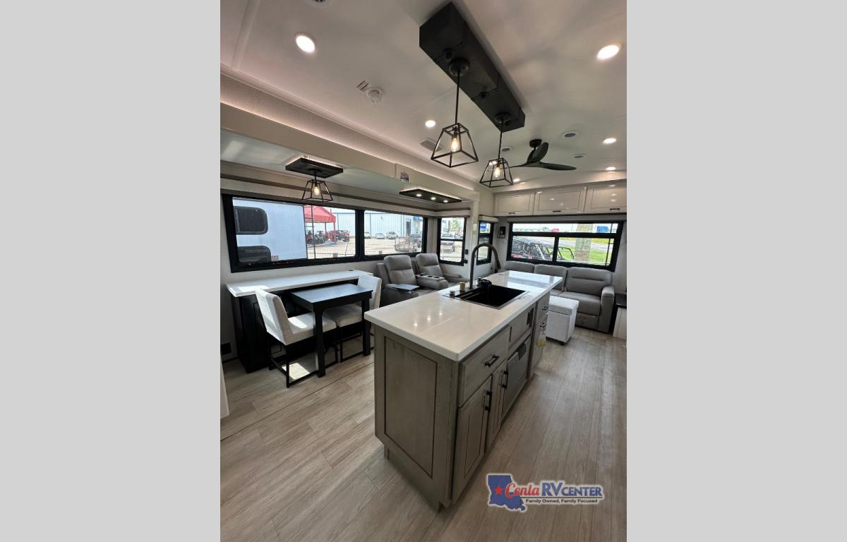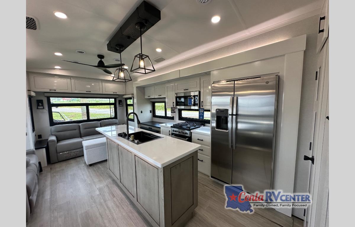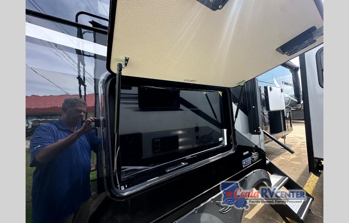 Each Pinnacle fifth wheel features Stronghold VBL lamination for the lightest, yet strongest construction in the RV industry. Add that to the Magnum Truss XL6 roof system and Climate Shield zero-degree tested weather protection and you'll be enjoying your fifth wheel for years to come. Some of the exterior conveniences you will appreciate are the Keyed-Alike lock system, the fully enclosed, universal docking center, and the 6-point hydraulic auto-leveling system for quick and easy set up. The 5 Star Handling Package will make towing a fifth wheel a walk in the park, and the two Whisper Quiet A/C units will keep you comfortable during the hot summer months. Inside, you'll enjoy the residential "Do it all" sink with pull-out kitchen faucet, glass rinse, and vegetable rinse, the handcrafted hardwood glazed cabinetry, the vinyl flooring throughout, plus many more comforts. There is even a central vacuum system, a wireless remote control system, USB ports throughout, plus many more conveniences to make each trip enjoyable.