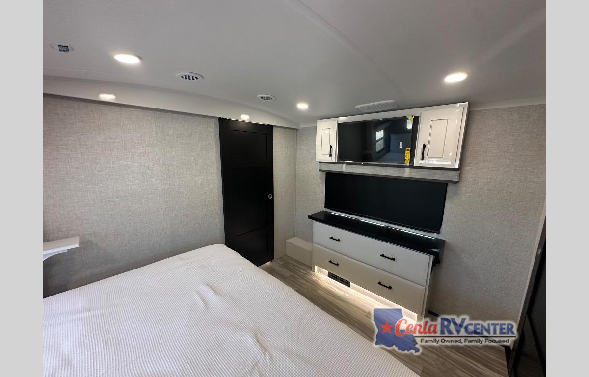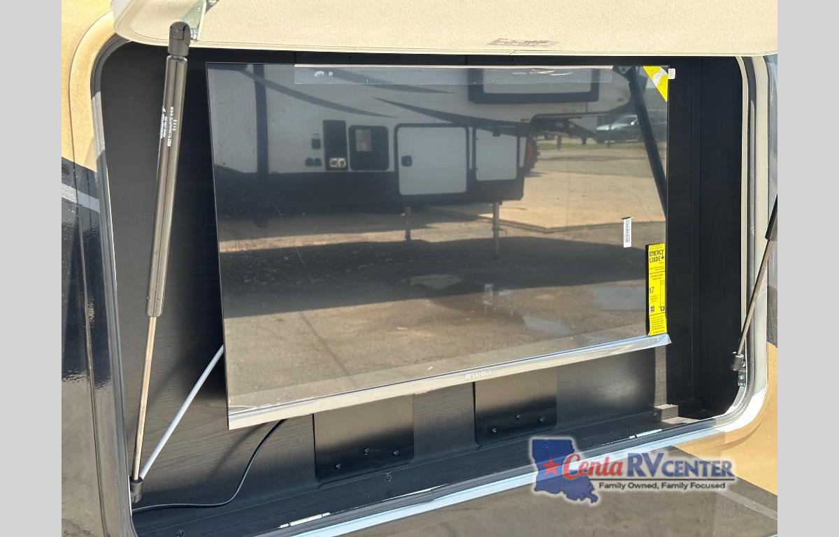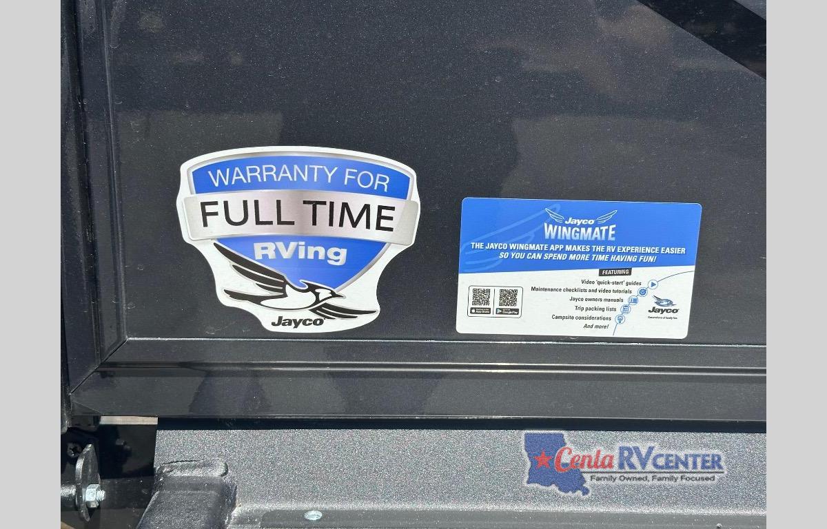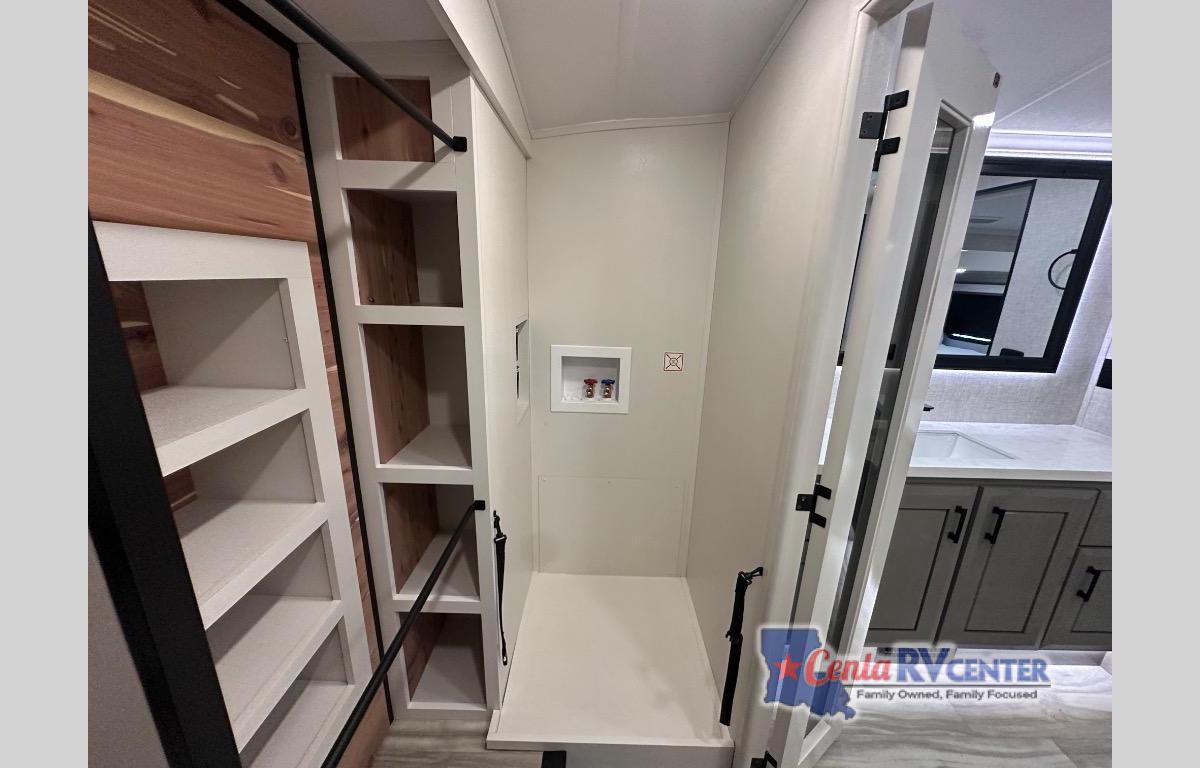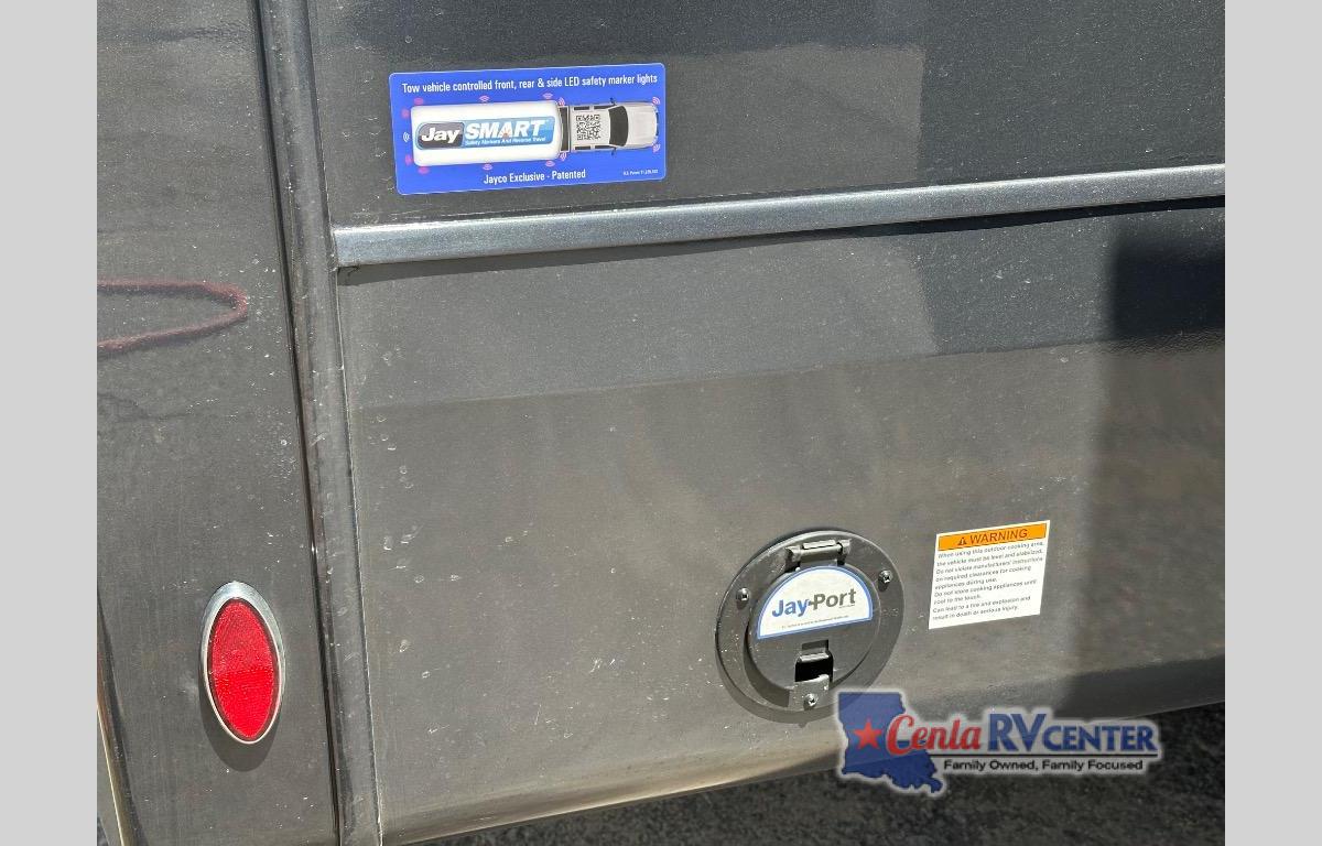 You can't go wrong with this fifth wheel that can sleep four! You will love how much space you have in the main living area thanks to the dual opposing slides, and there is a kitchen island here with a pull-out extension for added prep space. The convenient half bath is right off of the kitchen for quick restroom breaks, and you'll find a shoe garage and a wardrobe just as you enter the unit to keep the RV tidy. Head to the master bedroom for a rest on the king bed slide out, or you may want to watch a show on the 32" bedroom TV. The front master bath may be your favorite feature of this unit. Here, you'll find a spacious counter sink, a walk-in shower with a seat, plus a spacious walk-in closet for your clothes. And don't overlook the exterior with its two power awnings, 32" exterior TV, and a Jayport with LP quick connect for your outdoor grill.