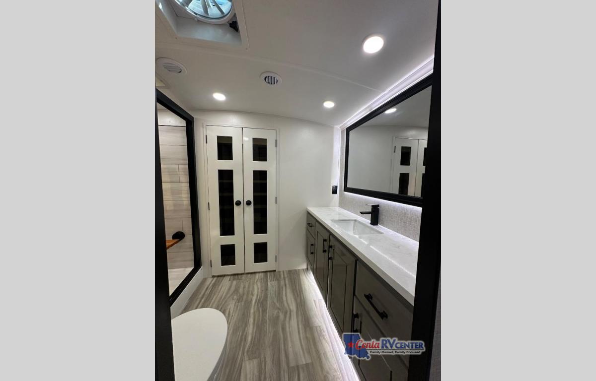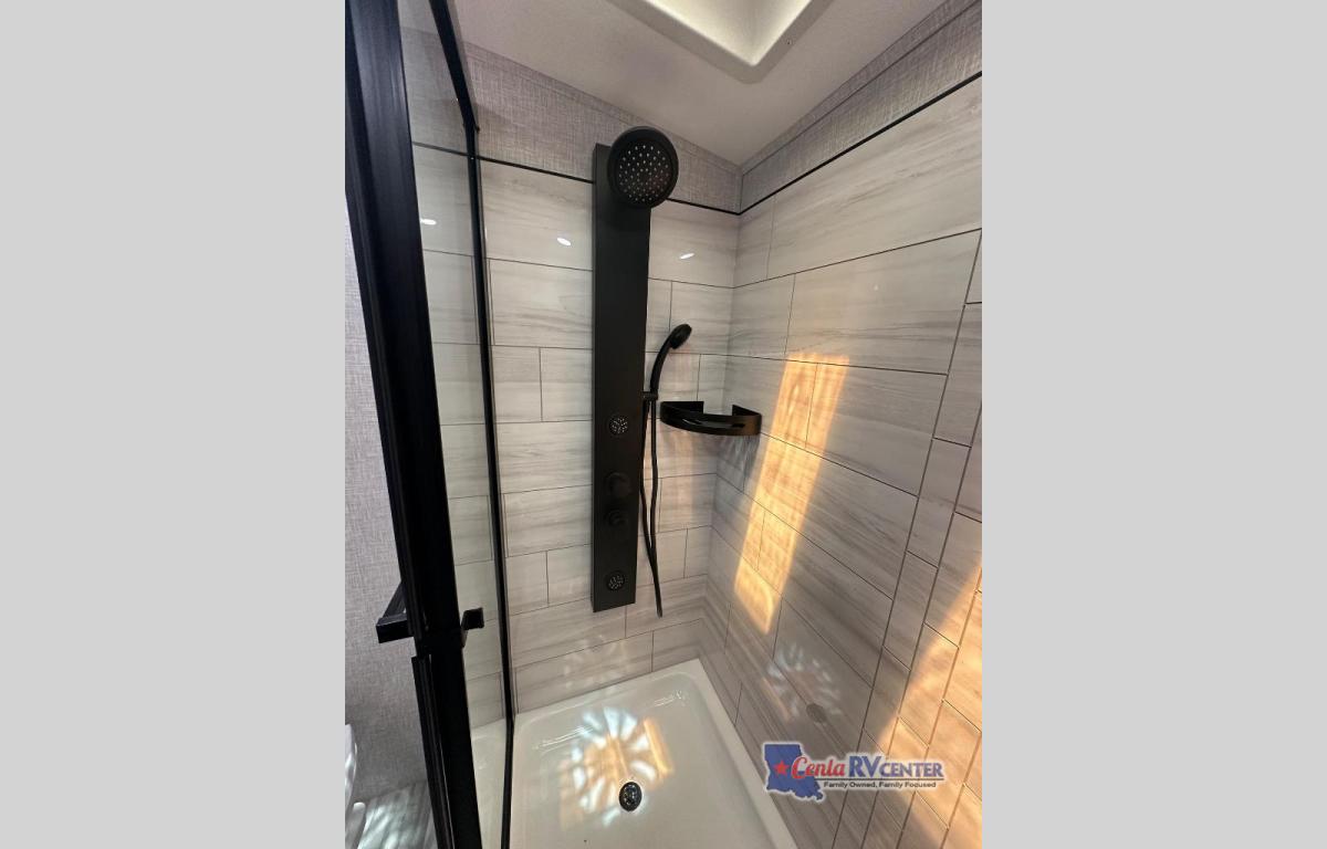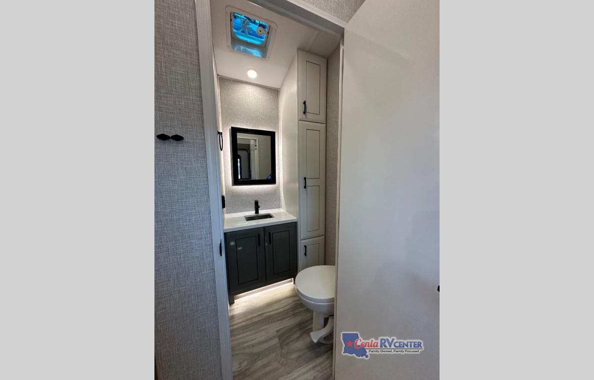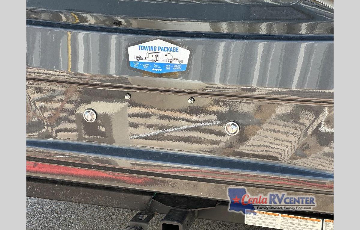 You can't go wrong with this fifth wheel that can sleep four! You will love how much space you have in the main living area thanks to the dual opposing slides, and there is a kitchen island here with a pull-out extension for added prep space. The convenient half bath is right off of the kitchen for quick restroom breaks, and you'll find a shoe garage and a wardrobe just as you enter the unit to keep the RV tidy. Head to the master bedroom for a rest on the king bed slide out, or you may want to watch a show on the 32" bedroom TV. The front master bath may be your favorite feature of this unit. Here, you'll find a spacious counter sink, a walk-in shower with a seat, plus a spacious walk-in closet for your clothes. And don't overlook the exterior with its two power awnings, 32" exterior TV, and a Jayport with LP quick connect for your outdoor grill.