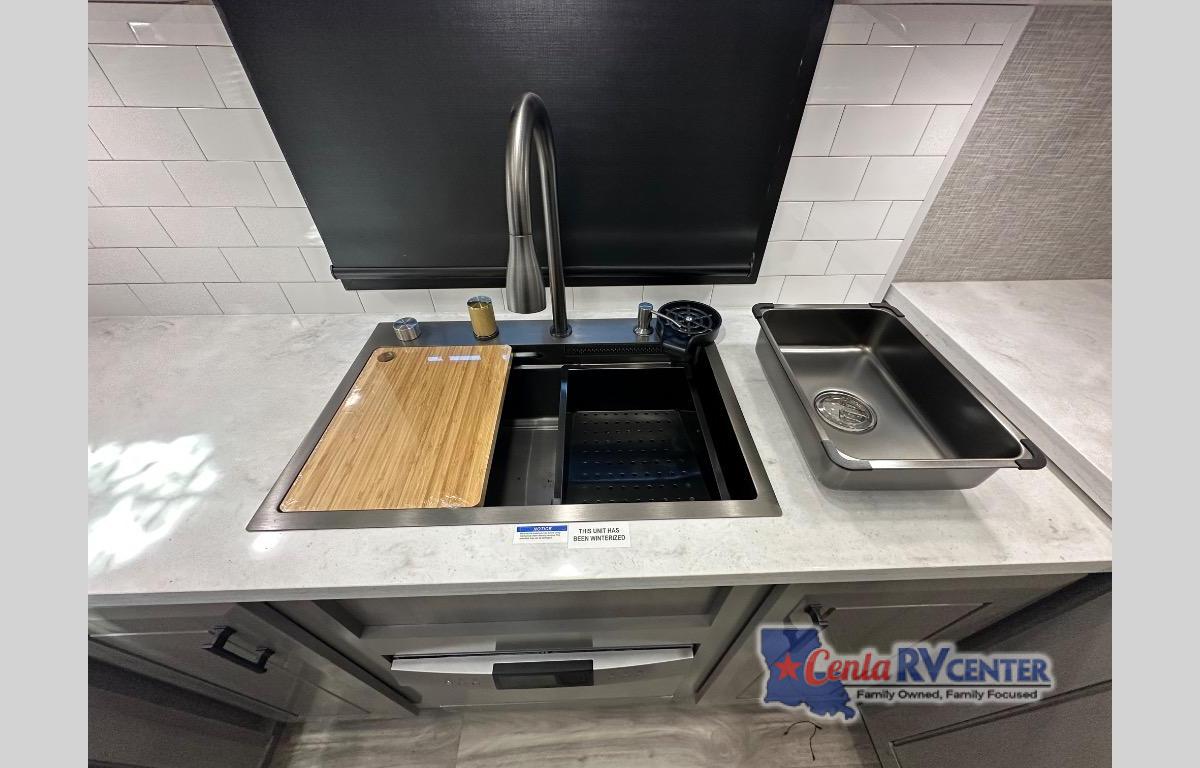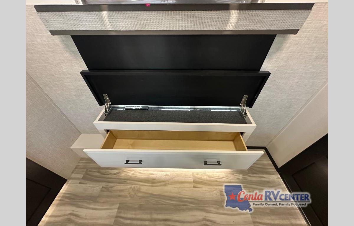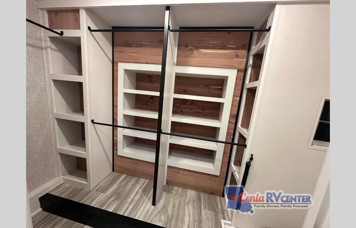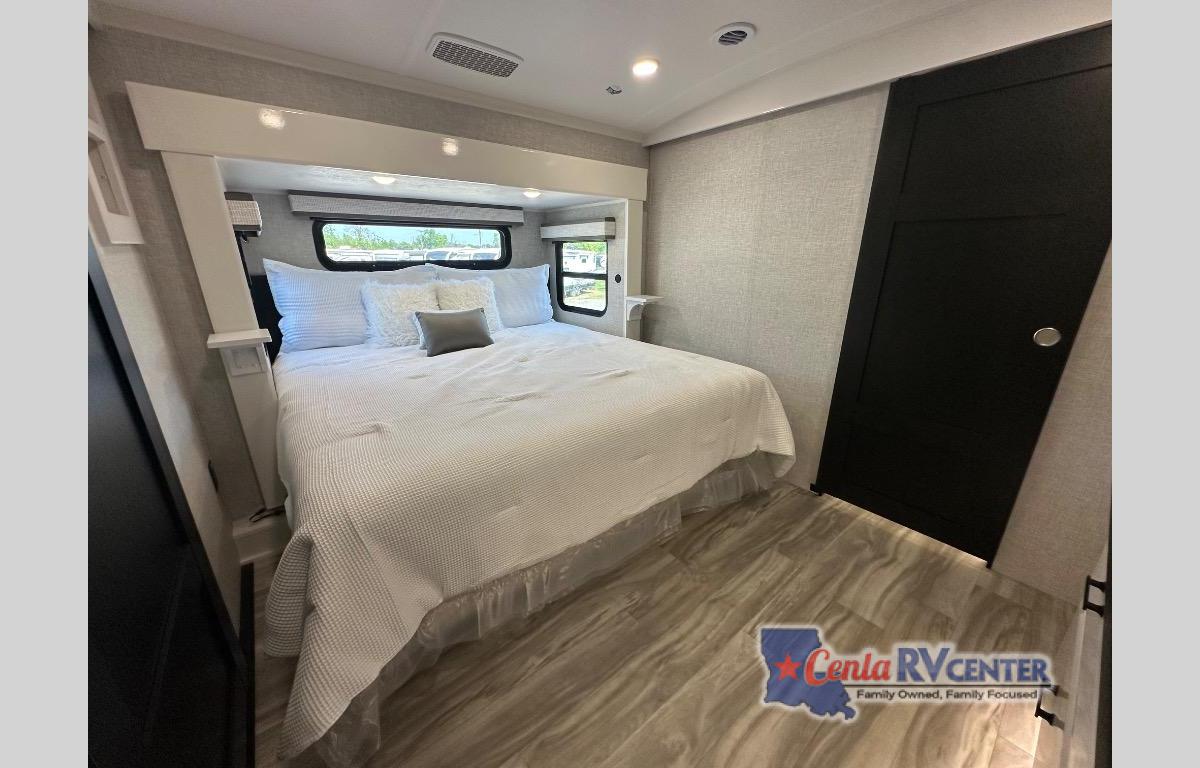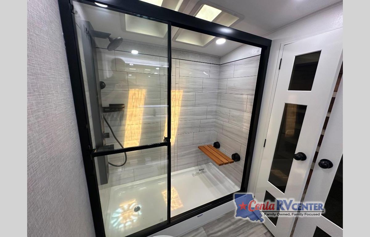 You can't go wrong with this fifth wheel that can sleep four! You will love how much space you have in the main living area thanks to the dual opposing slides, and there is a kitchen island here with a pull-out extension for added prep space. The convenient half bath is right off of the kitchen for quick restroom breaks, and you'll find a shoe garage and a wardrobe just as you enter the unit to keep the RV tidy. Head to the master bedroom for a rest on the king bed slide out, or you may want to watch a show on the 32" bedroom TV. The front master bath may be your favorite feature of this unit. Here, you'll find a spacious counter sink, a walk-in shower with a seat, plus a spacious walk-in closet for your clothes. And don't overlook the exterior with its two power awnings, 32" exterior TV, and a Jayport with LP quick connect for your outdoor grill.