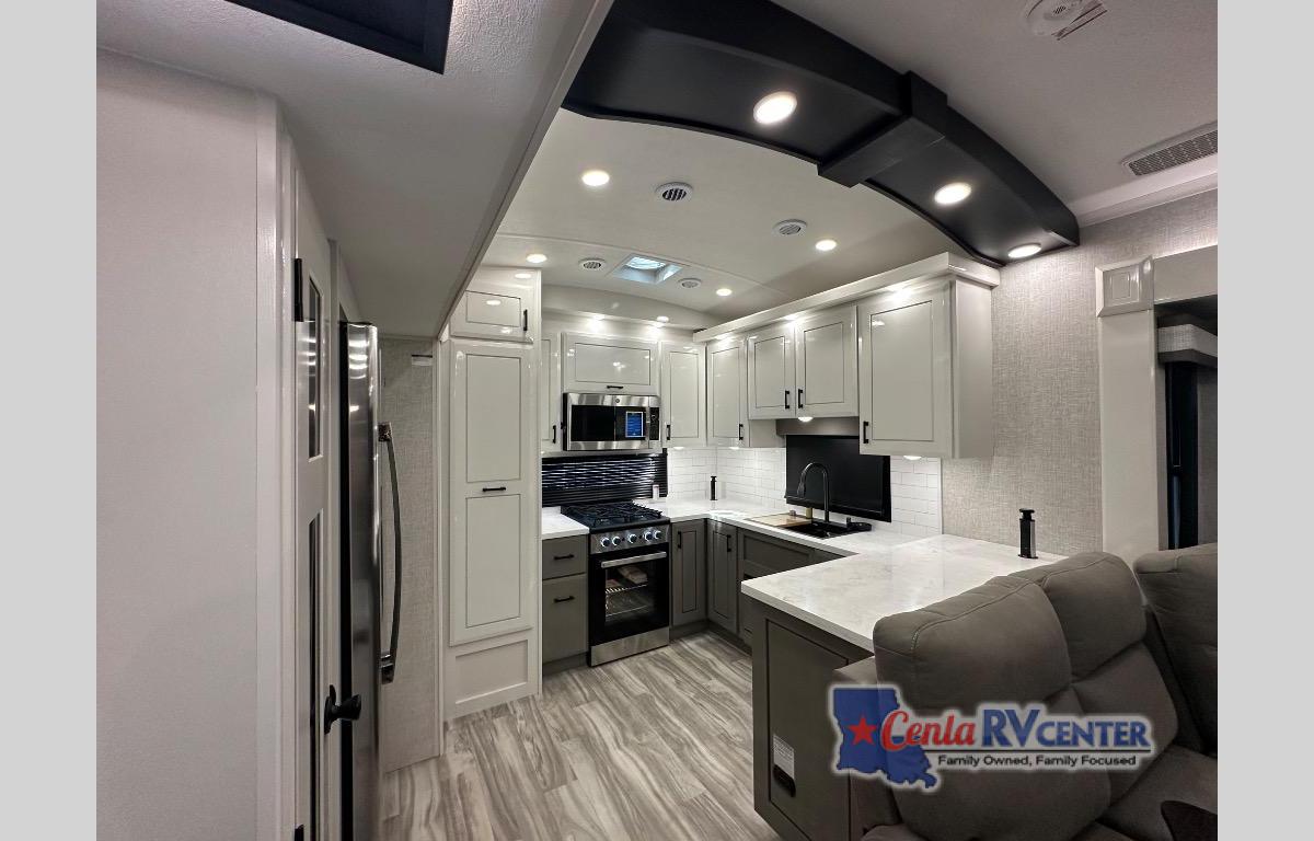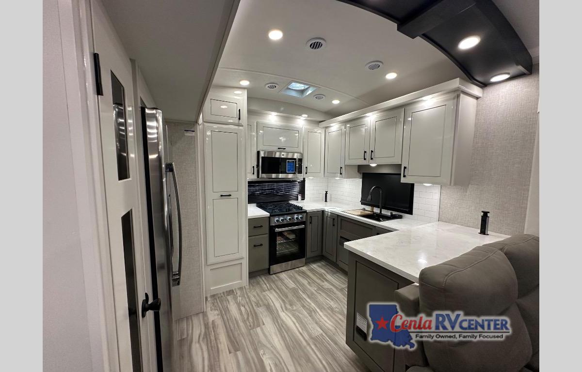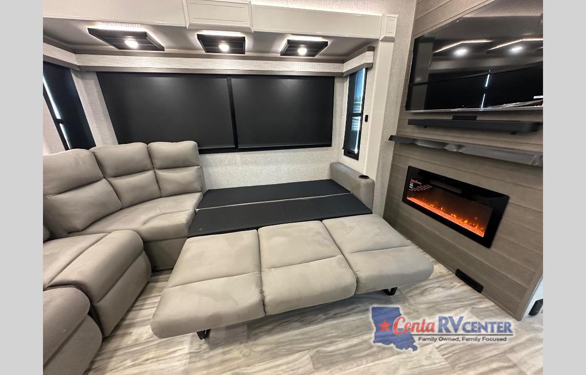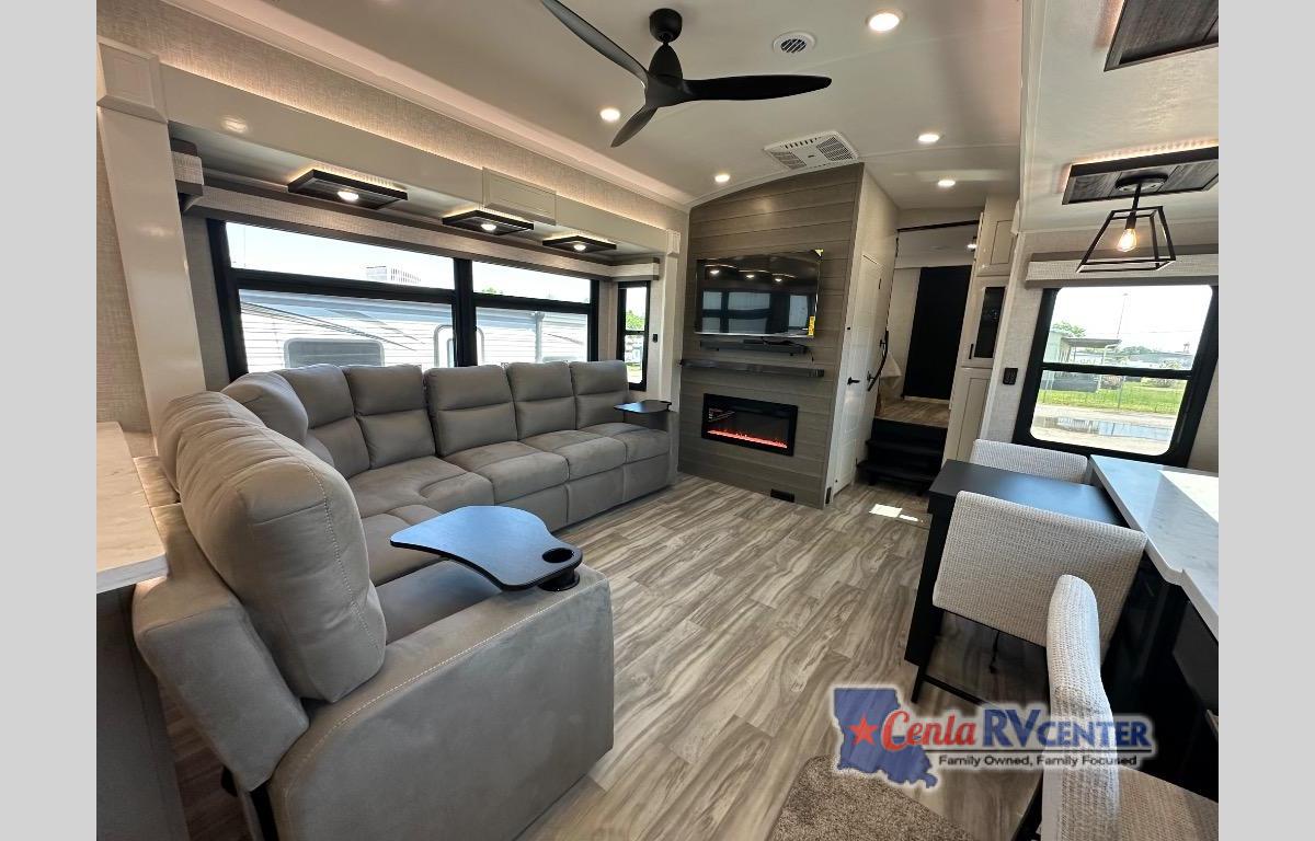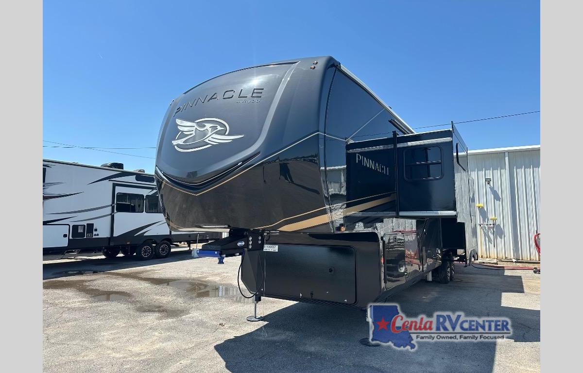 Each Pinnacle fifth wheel features Stronghold VBL lamination for the lightest, yet strongest construction in the RV industry. Add that to the Magnum Truss XL6 roof system and Climate Shield zero-degree tested weather protection and you'll be enjoying your fifth wheel even in harsh weather. Some of the exterior conveniences you will appreciate are the Keyed-Alike lock system, the fully enclosed, universal docking center, and the 6-point hydraulic auto-leveling system for quick and easy set up. The 5 Star Handling Package will make towing a fifth wheel a walk in the park, and the two Whisper Quiet A/C units will keep you comfortable during the hot summer months. Inside, you'll enjoy the residential "Do it all" sink, the solid hardwood cabinet doors, stiles, and fascia, the vinyl flooring throughout, plus many more comforts. There is even a central vacuum system, a wireless remote-control system, 12V charging station, plus many more conveniences to make each trip enjoyable.