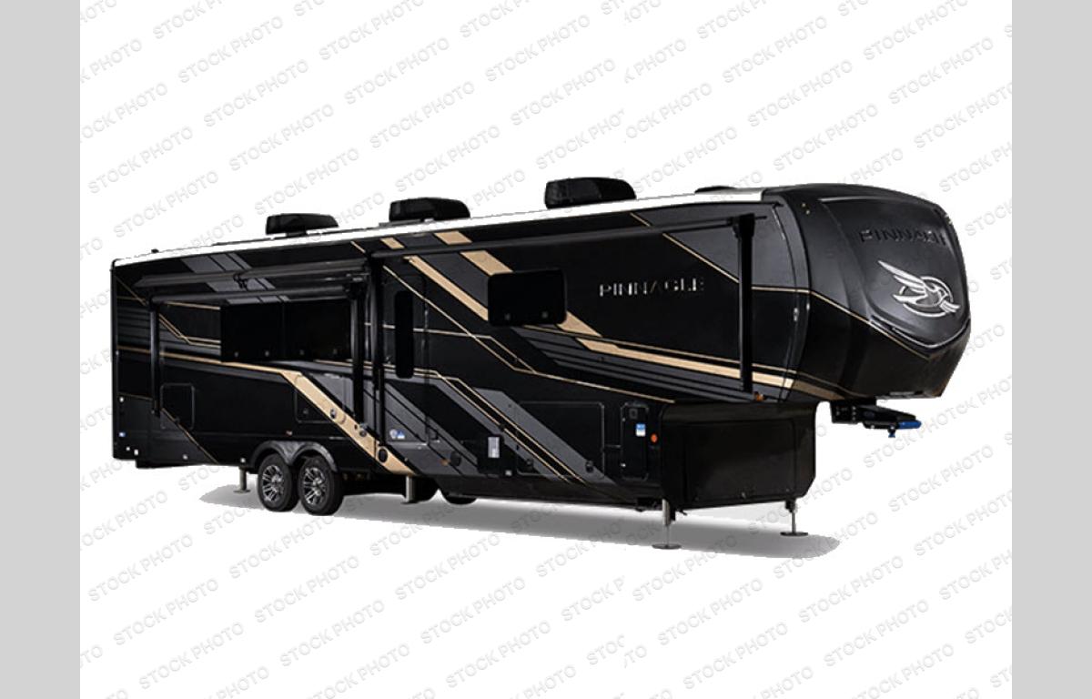 Each Pinnacle fifth wheel features Stronghold VBL lamination for the lightest, yet strongest construction in the RV industry. Add that to the Magnum Truss XL6 roof system and Climate Shield zero-degree tested weather protection and you'll be enjoying your fifth wheel even in harsh weather. Some of the exterior conveniences you will appreciate are the Keyed-Alike lock system, the fully enclosed, universal docking center, and the 6-point hydraulic auto-leveling system for quick and easy set up. The 5 Star Handling Package will make towing a fifth wheel a walk in the park, and the two Whisper Quiet A/C units will keep you comfortable during the hot summer months. Inside, you'll enjoy the residential "Do it all" sink, the solid hardwood cabinet doors, stiles, and fascia, the vinyl flooring throughout, plus many more comforts. There is even a central vacuum system, a wireless remote-control system, 12V charging station, plus many more conveniences to make each trip enjoyable.