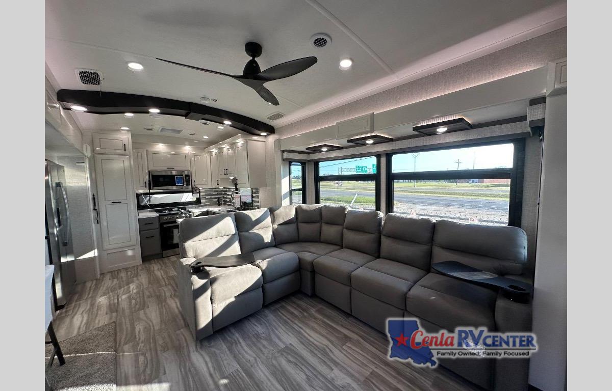 Each Pinnacle fifth wheel features Stronghold VBL lamination for the lightest, yet strongest construction in the RV industry. Add that to the Magnum Truss XL6 roof system and Climate Shield zero-degree tested weather protection and you'll be enjoying your fifth wheel for years to come. Some of the exterior conveniences you will appreciate are the Keyed-Alike lock system, the fully enclosed, universal docking center, and the 6-point hydraulic auto-leveling system for quick and easy set up. The 5 Star Handling Package will make towing a fifth wheel a walk in the park, and the two Whisper Quiet A/C units will keep you comfortable during the hot summer months. Inside, you'll enjoy the residential "Do it all" sink with pull-out kitchen faucet, glass rinse, and vegetable rinse, the handcrafted hardwood glazed cabinetry, the vinyl flooring throughout, plus many more comforts. There is even a central vacuum system, a wireless remote control system, USB ports throughout, plus many more conveniences to make each trip enjoyable.