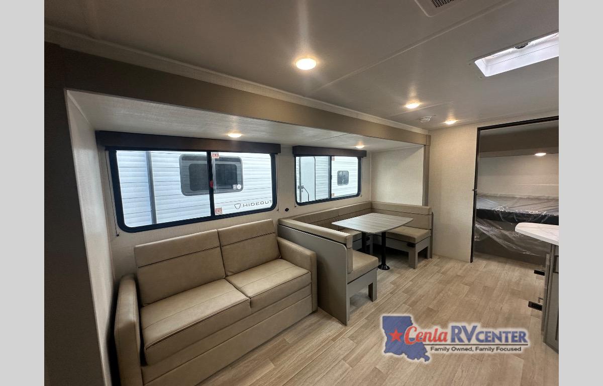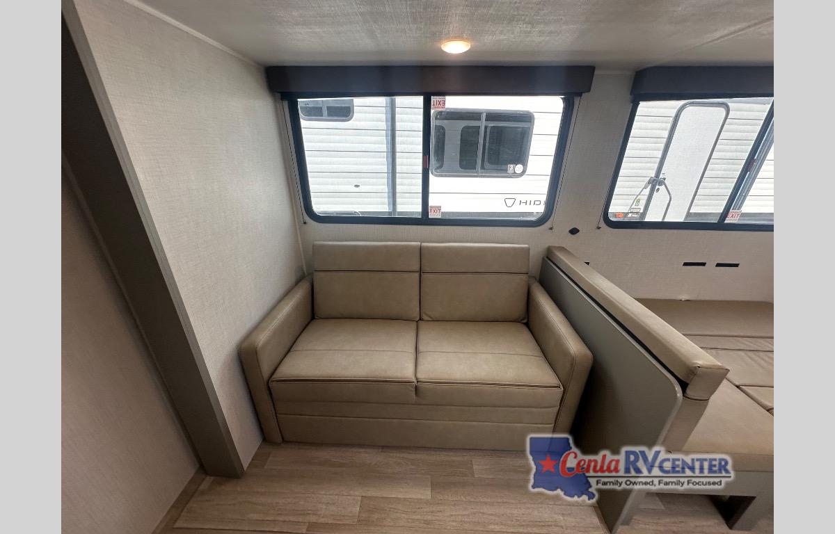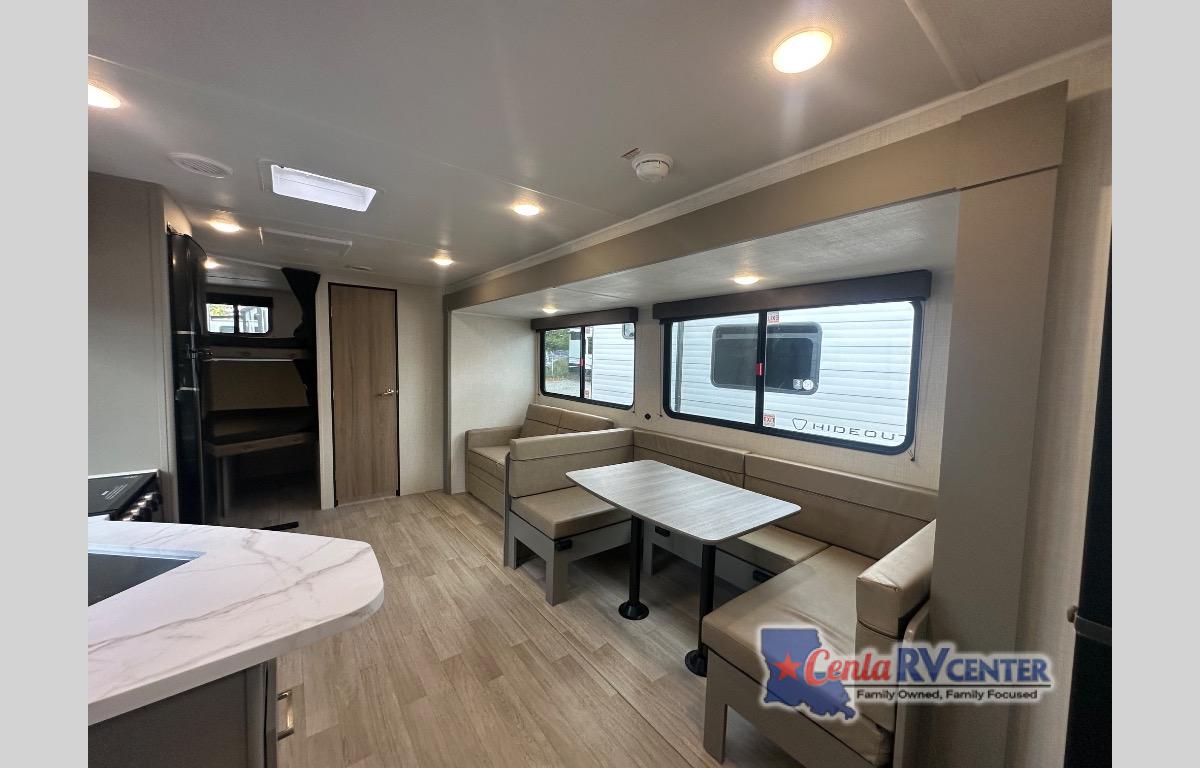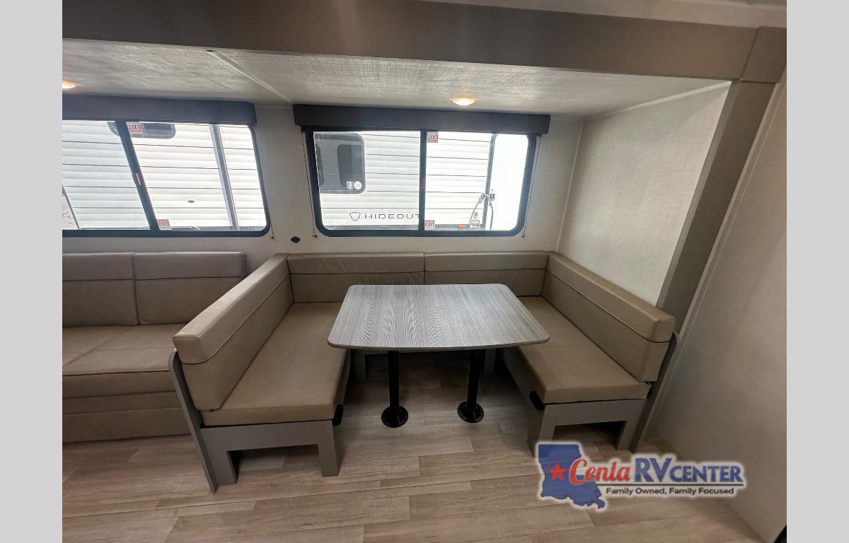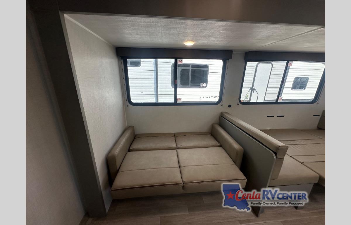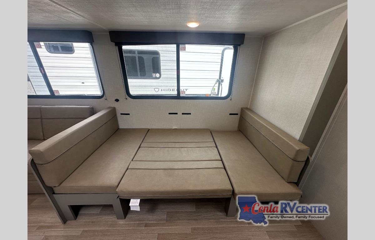 A large slide, front private bedroom, and double-size bunks make this Hideout Sport Double Axle the ultimate travel trailer! You will enjoy a walk-around queen bed in the bedroom plus dual closets and nightstands for your things. The full bath is towards the back and beside the bunks for easy nighttime use, and there is a pass-through storage outside for your gear. Head to the kitchen to prepare lunch on the cooktop, then dine at the U-shaped dinette and sofa within the large slide. If the weather is nice, you might just want to cook outdoors on the outside kitchen under the 18' power awning!