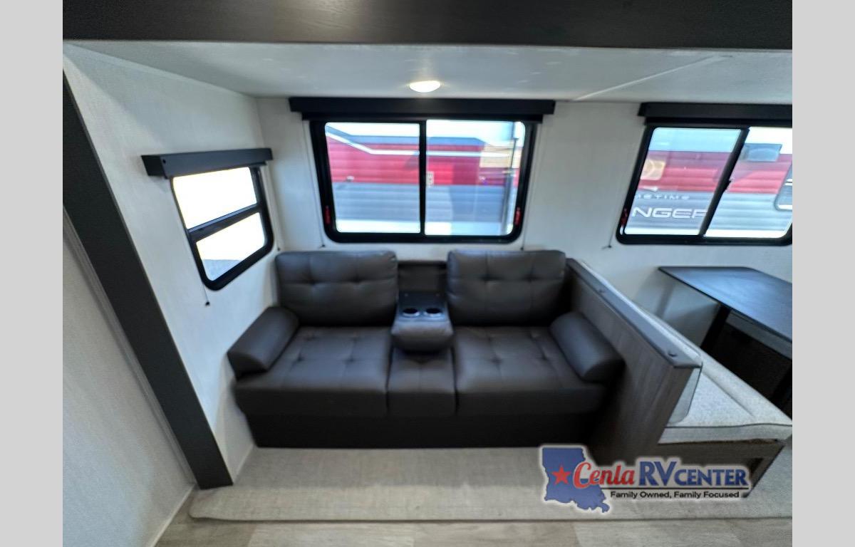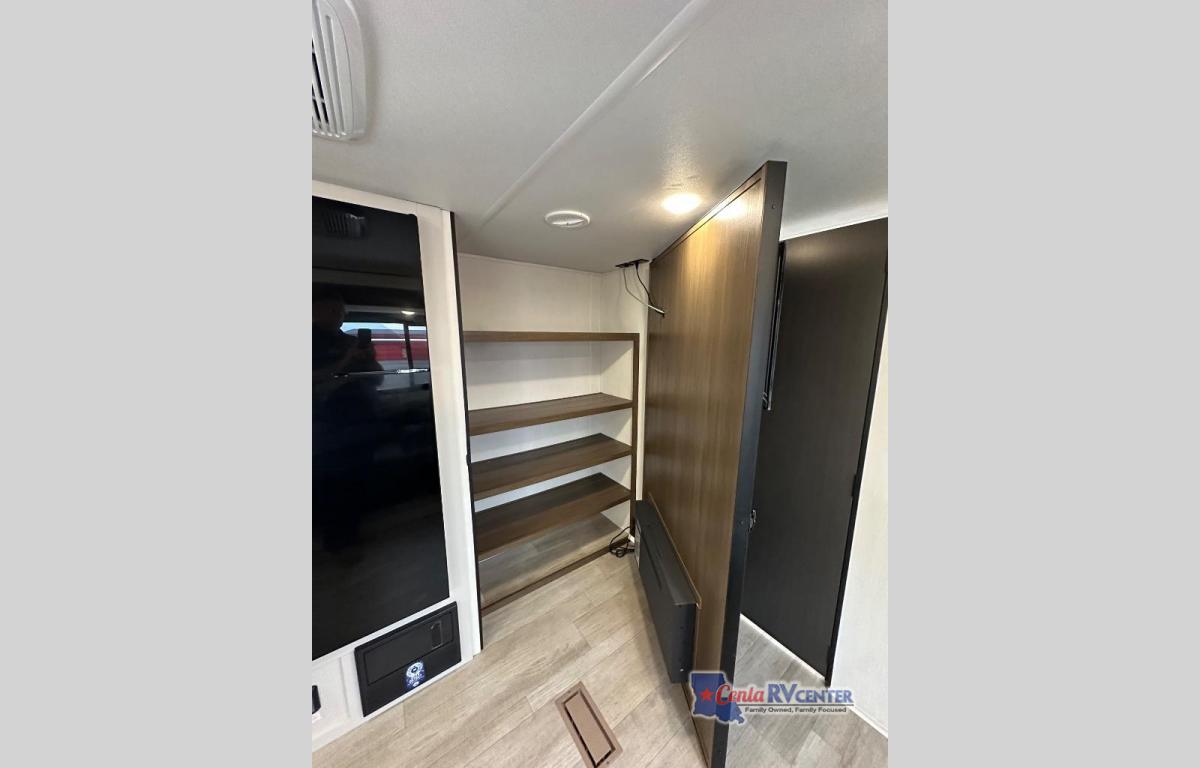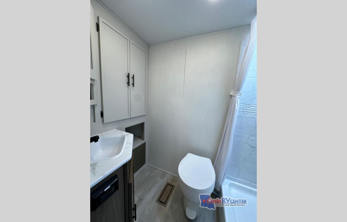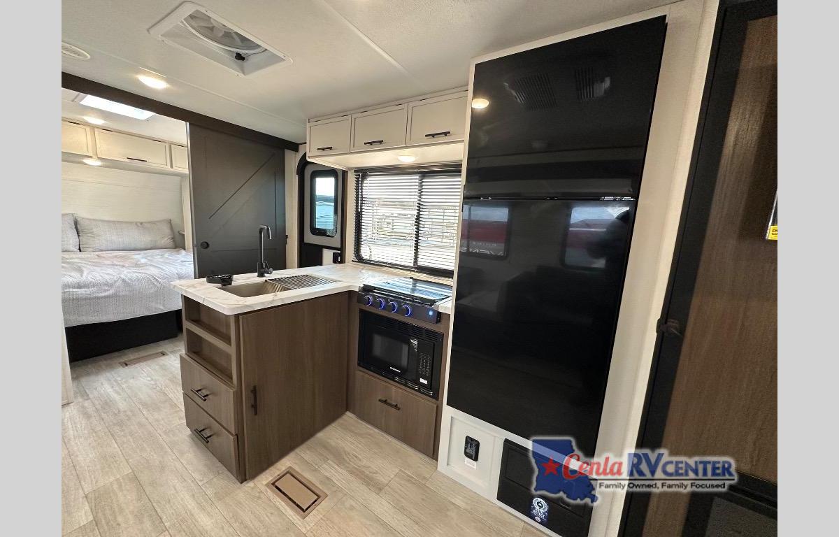 You'll appreciate the added space in this travel trailer thanks to the large slide out! The booth dinette and sofa are found here, and there is a moveable storage ottoman for extra blankets or board games. You'll have your own space up front in the private bedroom, complete with a camp king bed and storage for your things. The chef of your group will find a three burner cooktop and a built-in convection microwave with an air fryer to cook meals, plus there is a 12V refrigerator and hidden pantry for food storage. This unit also includes a power awning outdoors and an outside refrigerator to keep cold drinks close by.