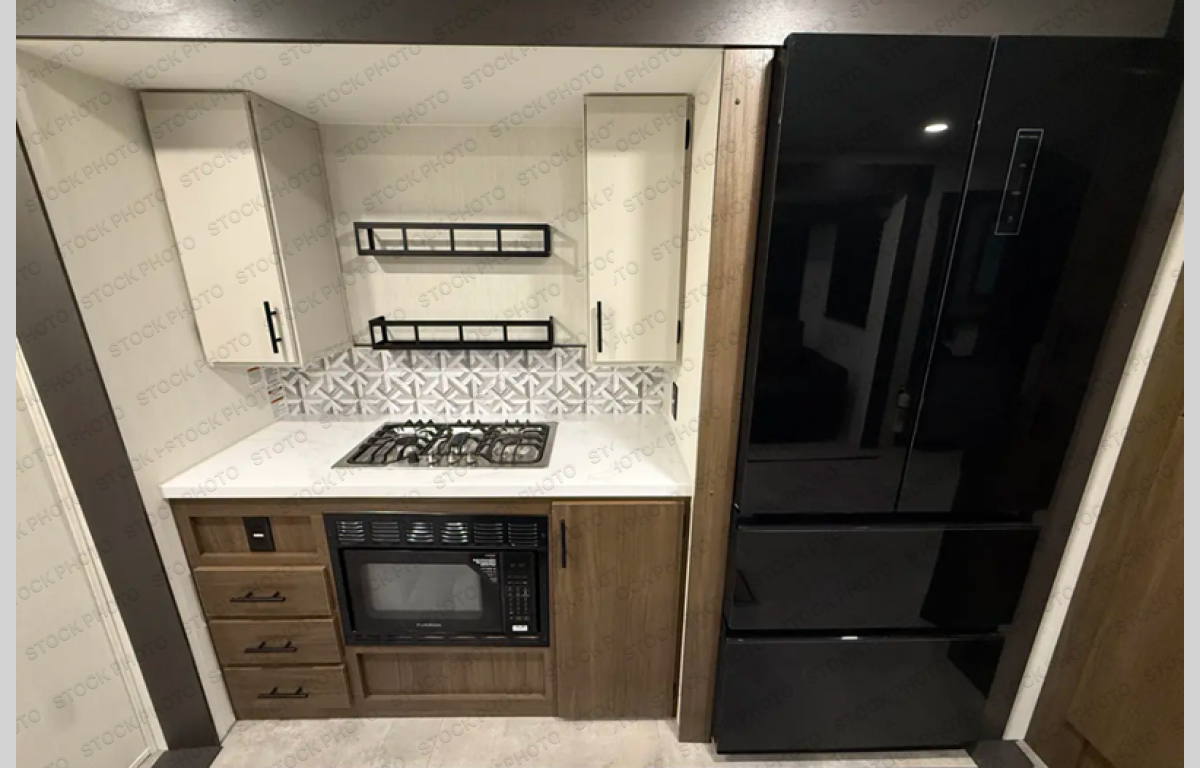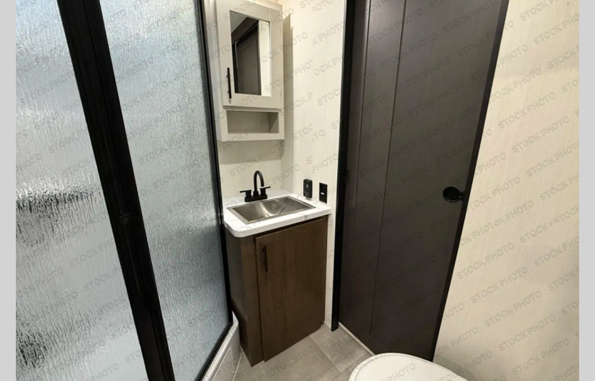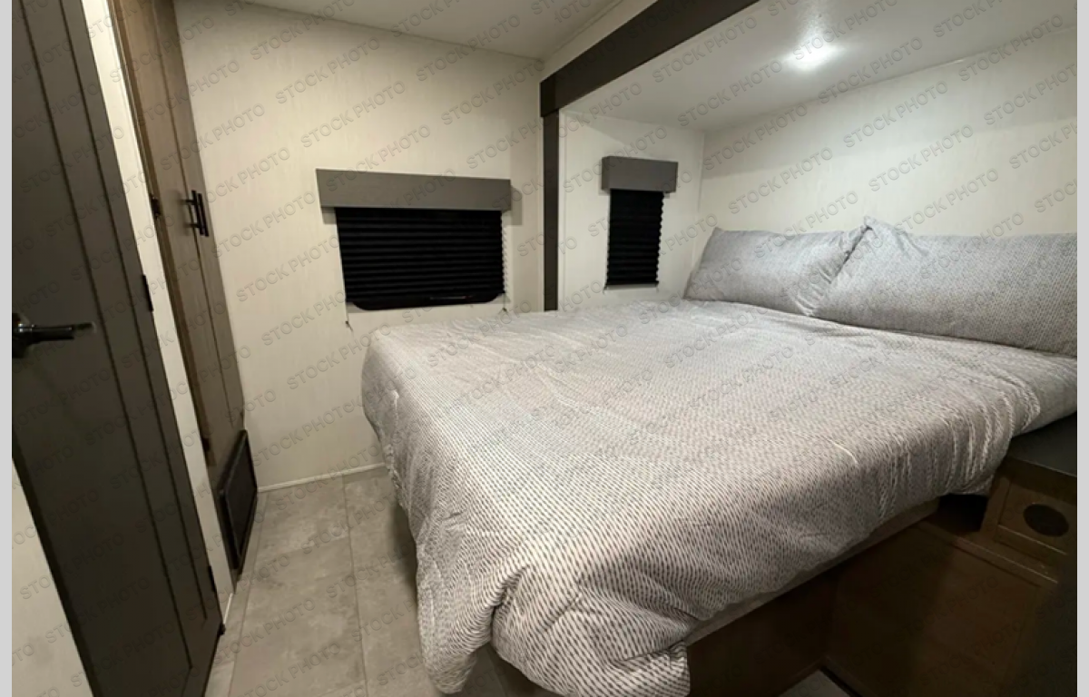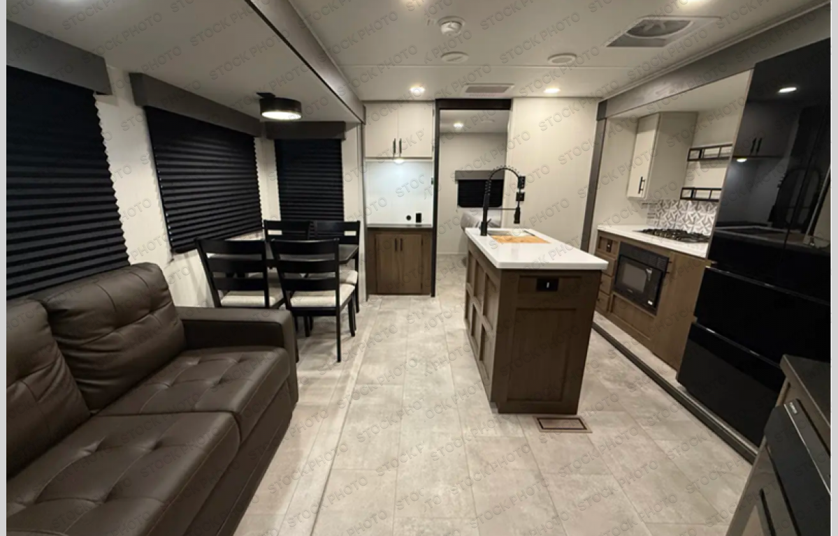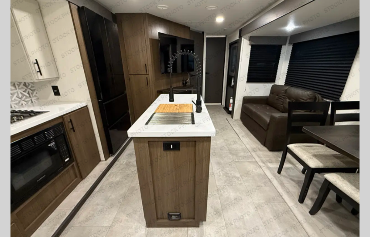 Privacy abounds in this travel trailer with a bedroom at each end! A king bed slide in the front has its own fireplace for cozy nights. Dual wardrobes frame the reading bench which looks out the front window for peaceful moments appreciating the view. At the rear, a second bedroom with queen bed has its own half bath. A pantry closet here also has prep for an optional washer/dryer for convenience on the road. In the center everyone can meet up in the spacious kitchen/living room. A hide-a-bed sofa has even more sleeping space, or relax there and watch the TV which is in the entertainment center along with another fireplace. The kitchen is well-equipped with a three-burner cooktop, microwave, and even an island where the sink is located for easy meal prep. Outside there are not one but two 10' power awnings for extra protection from the elements!