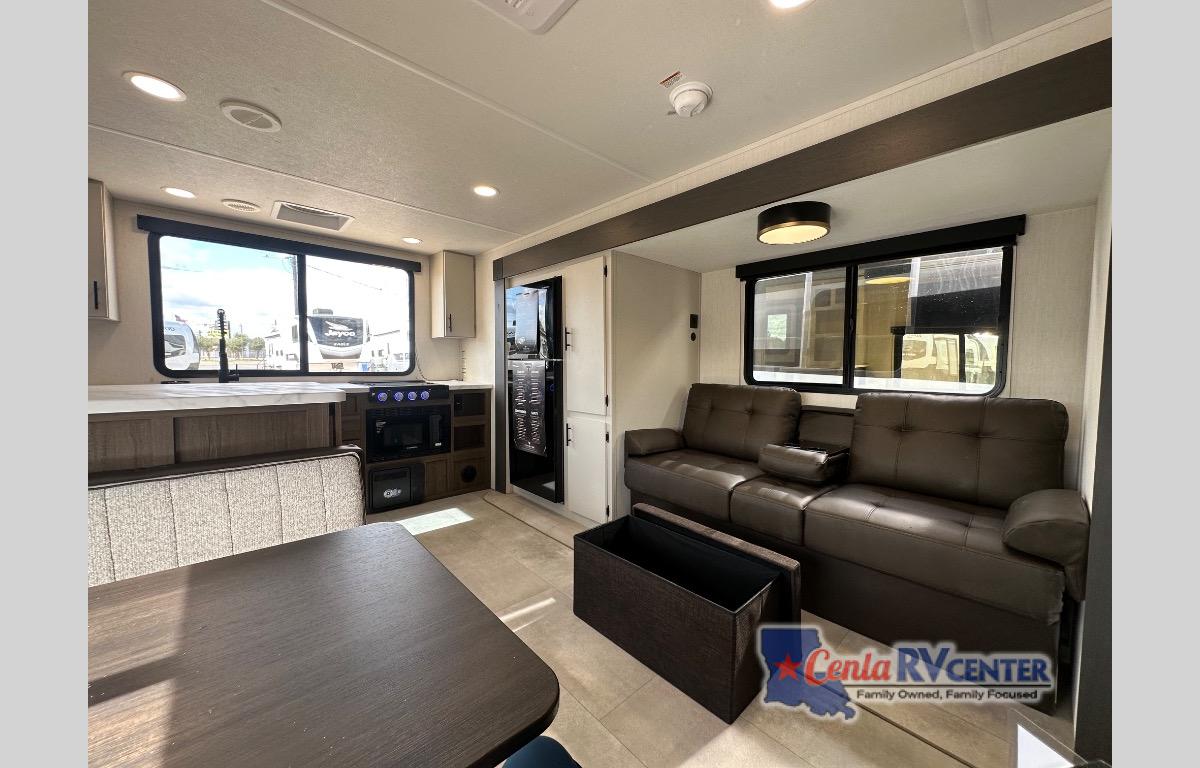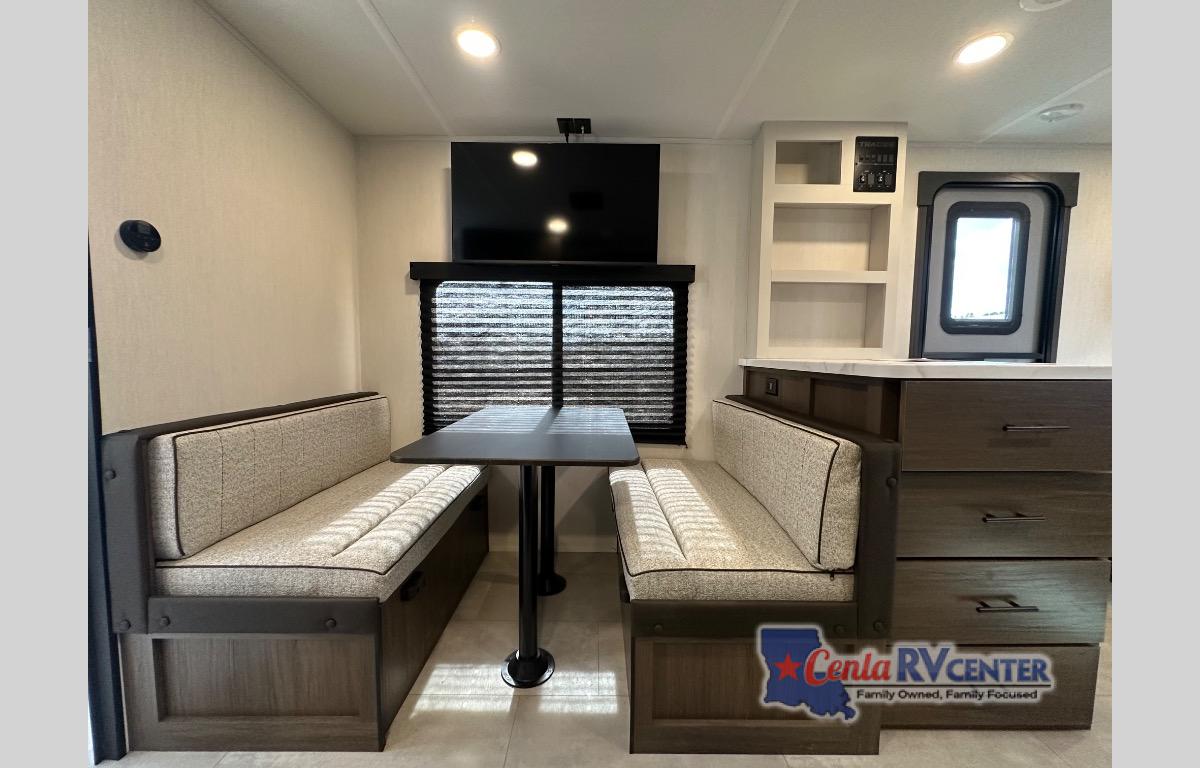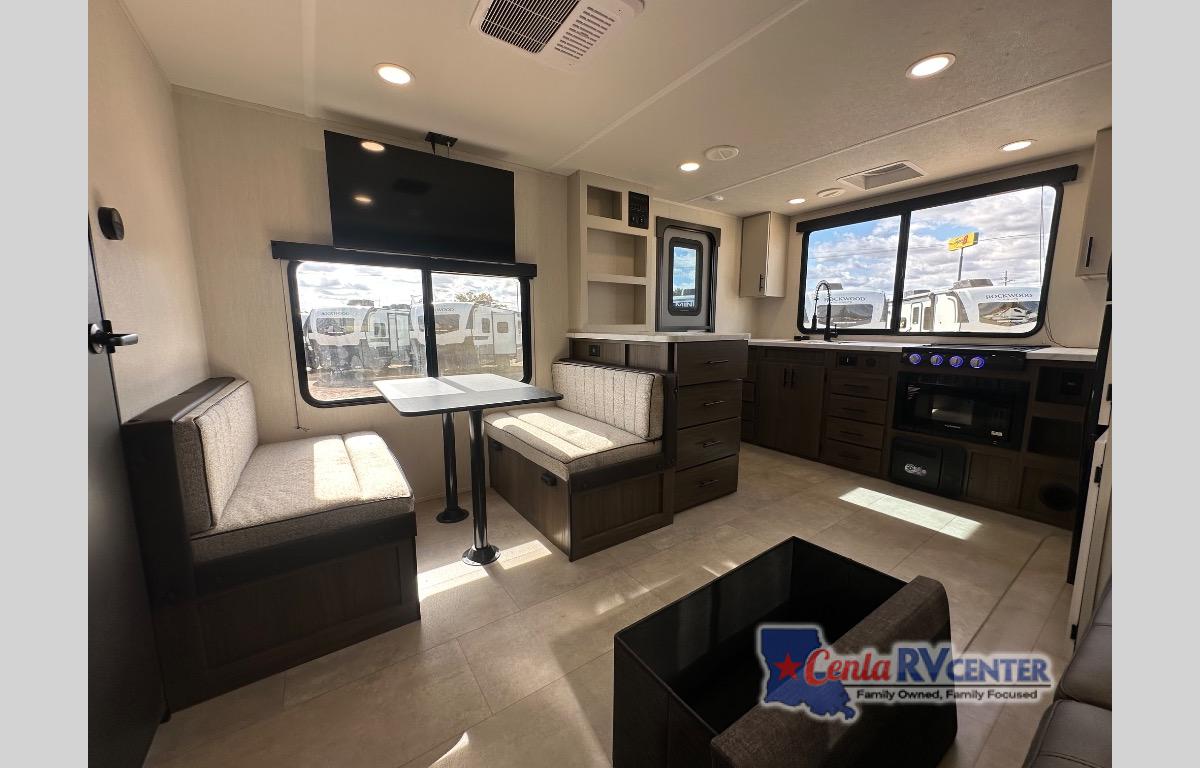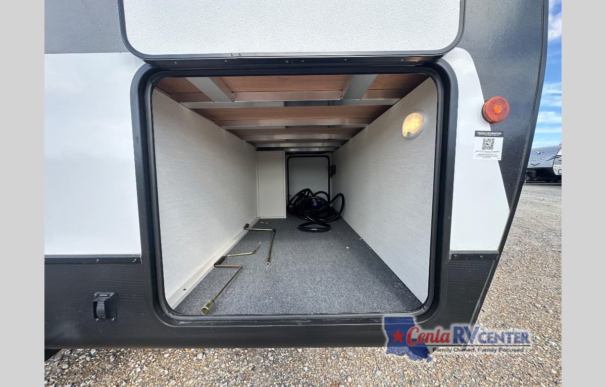 This travel trailer's modern rear kitchen is equipped with a reliable fridge, well-stocked pantry, and stylish hutch, making meal prep and storage a snap. The versatile jackknife sofa provides additional sleeping space or a cozy spot to unwind, while the intimate booth dinette is perfect for sharing meals or stories with loved ones. The crisp high-definition smart TV is ideal for entertainment on the go, and the practical walk-thru bathroom provides easy access. The serene front bedroom is a peaceful retreat, featuring a comfortable king bed, functional linen closet, spacious wardrobes, and ample overhead cabinets for storing your essentials. One of the standout features of this trailer is the two entry/exit doors, providing added convenience and flexibility.
