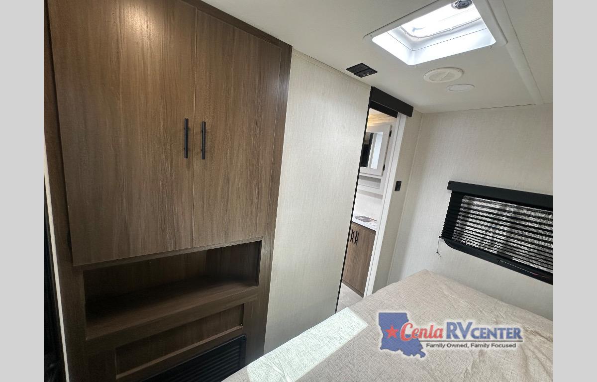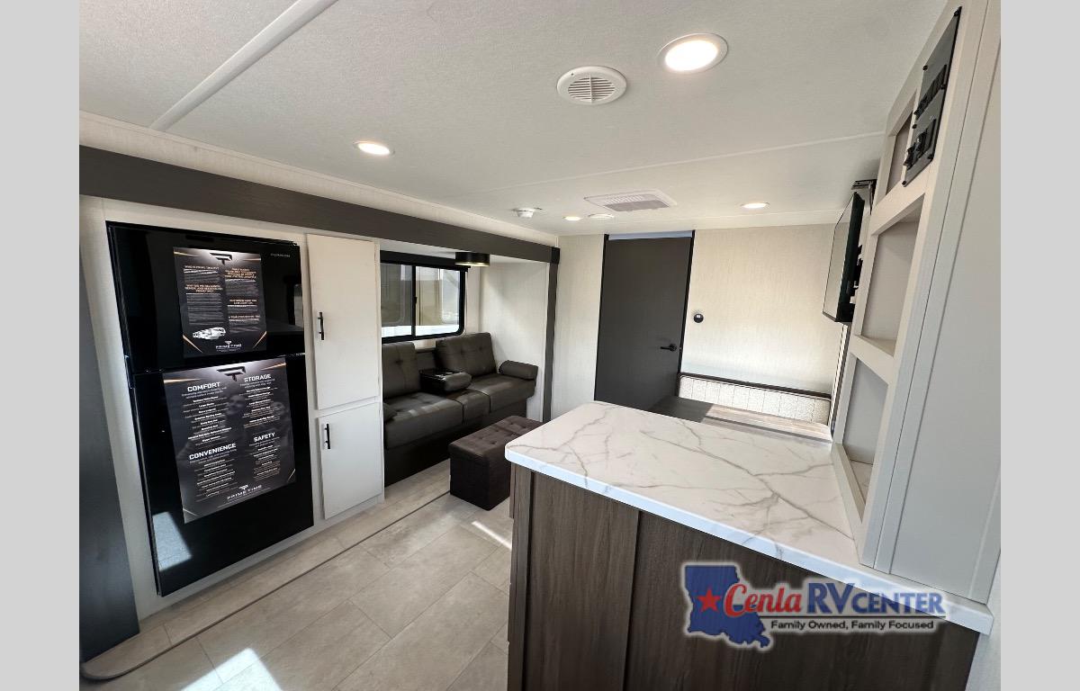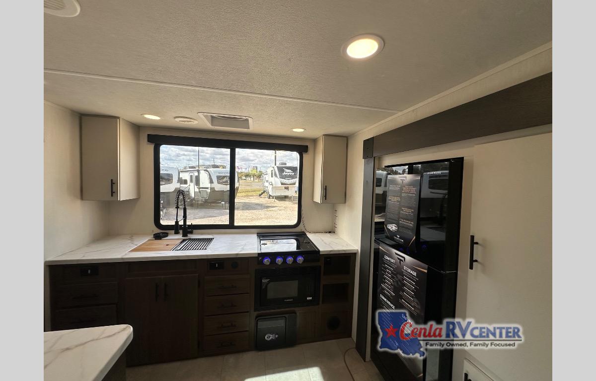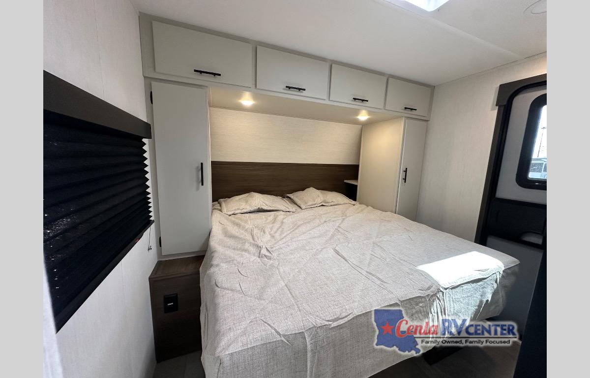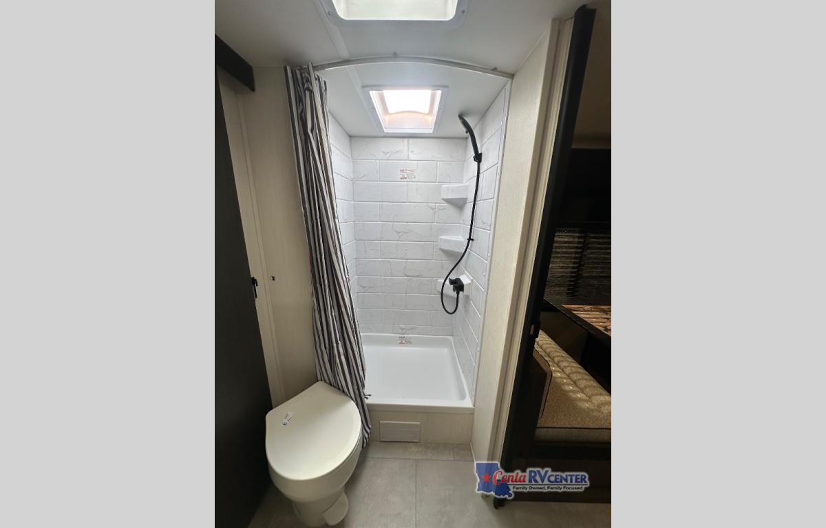 This travel trailer's modern rear kitchen is equipped with a reliable fridge, well-stocked pantry, and stylish hutch, making meal prep and storage a snap. The versatile jackknife sofa provides additional sleeping space or a cozy spot to unwind, while the intimate booth dinette is perfect for sharing meals or stories with loved ones. The crisp high-definition smart TV is ideal for entertainment on the go, and the practical walk-thru bathroom provides easy access. The serene front bedroom is a peaceful retreat, featuring a comfortable king bed, functional linen closet, spacious wardrobes, and ample overhead cabinets for storing your essentials. One of the standout features of this trailer is the two entry/exit doors, providing added convenience and flexibility.