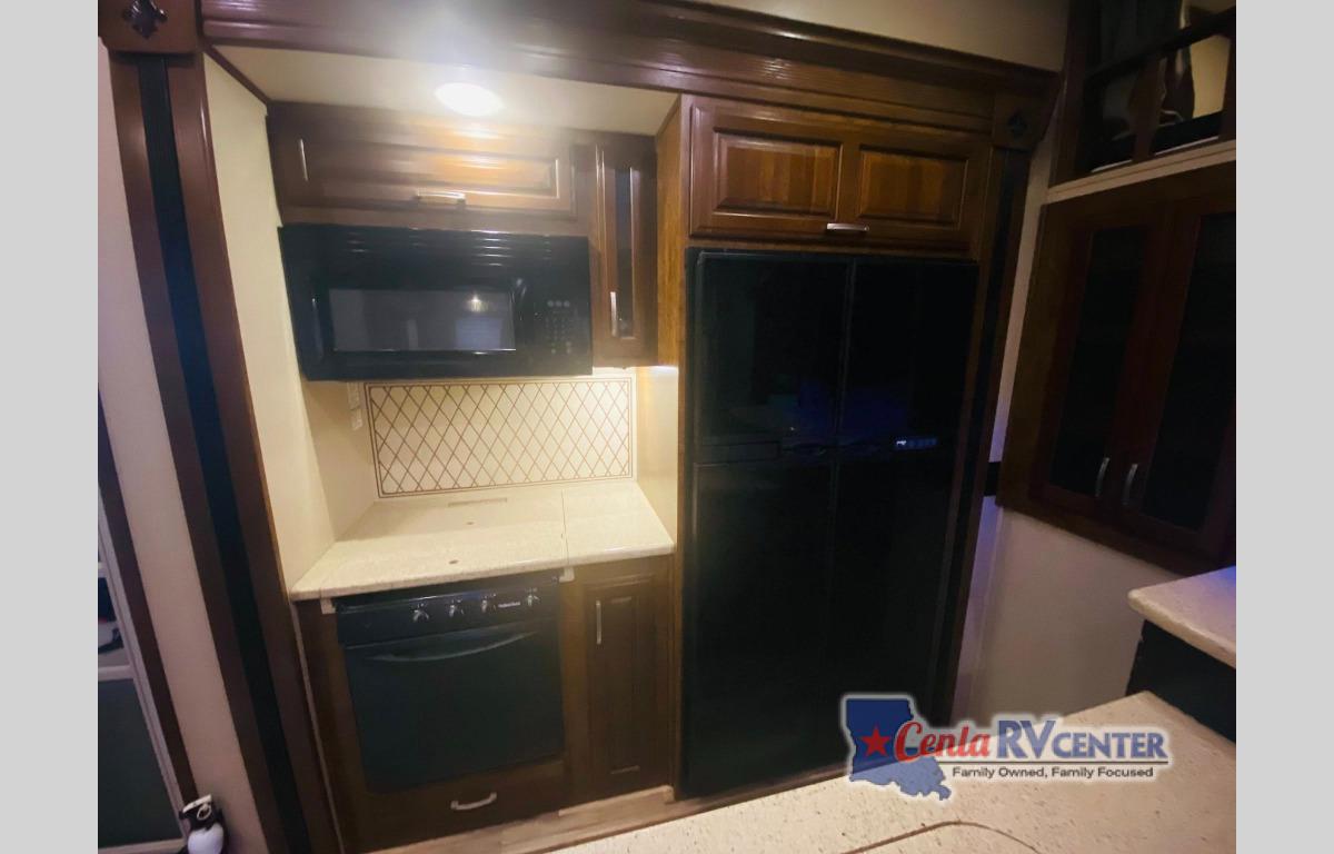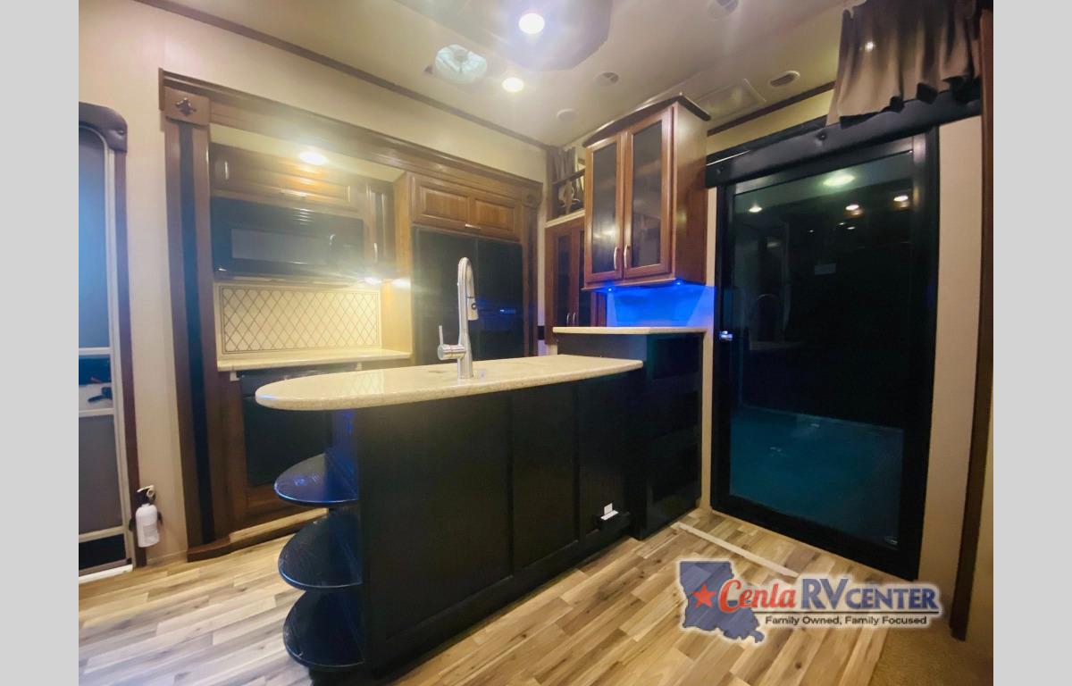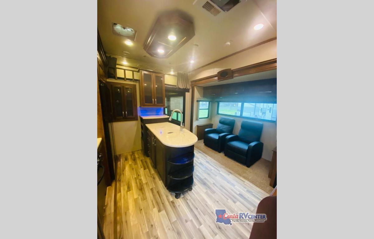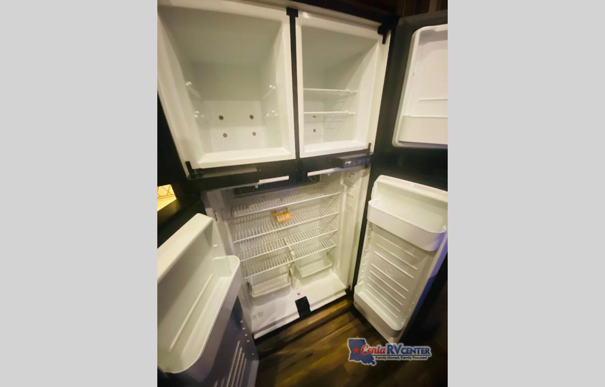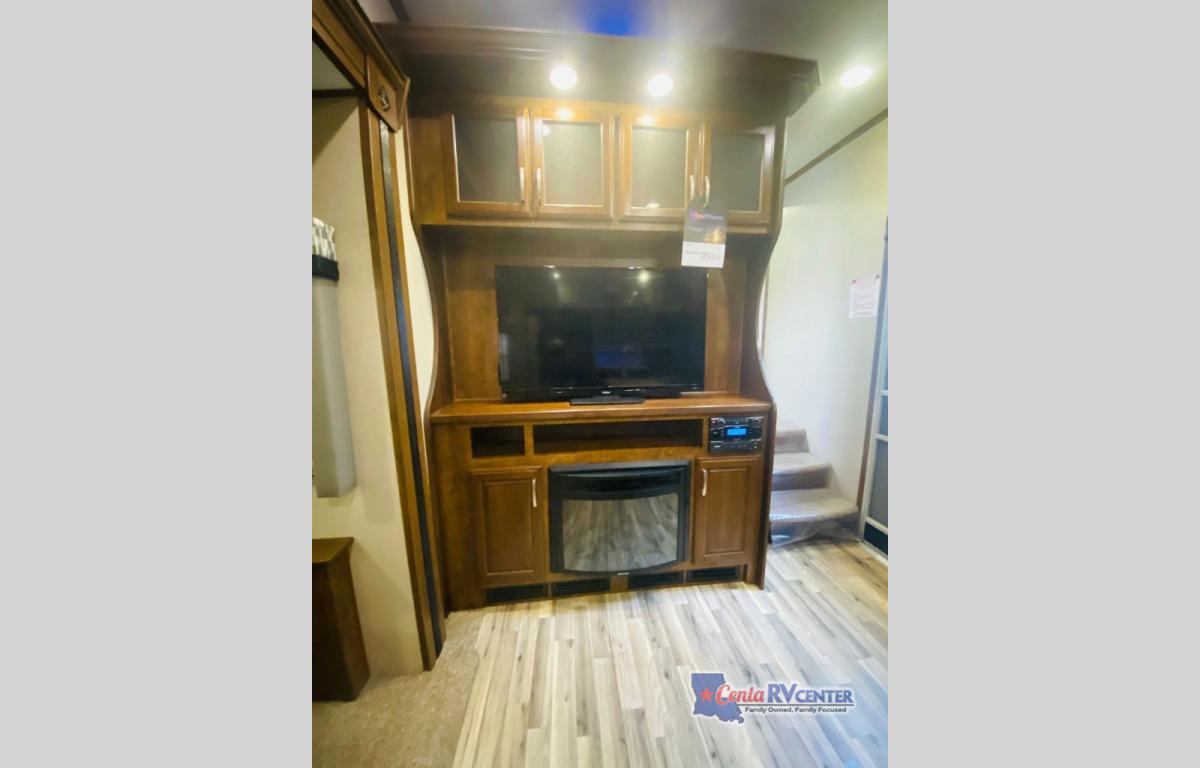 Enter the main kitchen and living area and find a counter peninsula with double kitchen sink for easy food prep and clean-up. There is a slide-out pantry, refrigerator, and three burner range. Opposite you will find a sofa slide-out with a stow-able table for dining. Enjoy a convenient entertainment center with LED television with fireplace below.