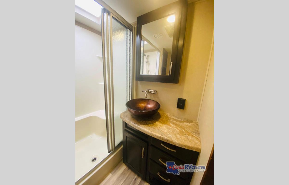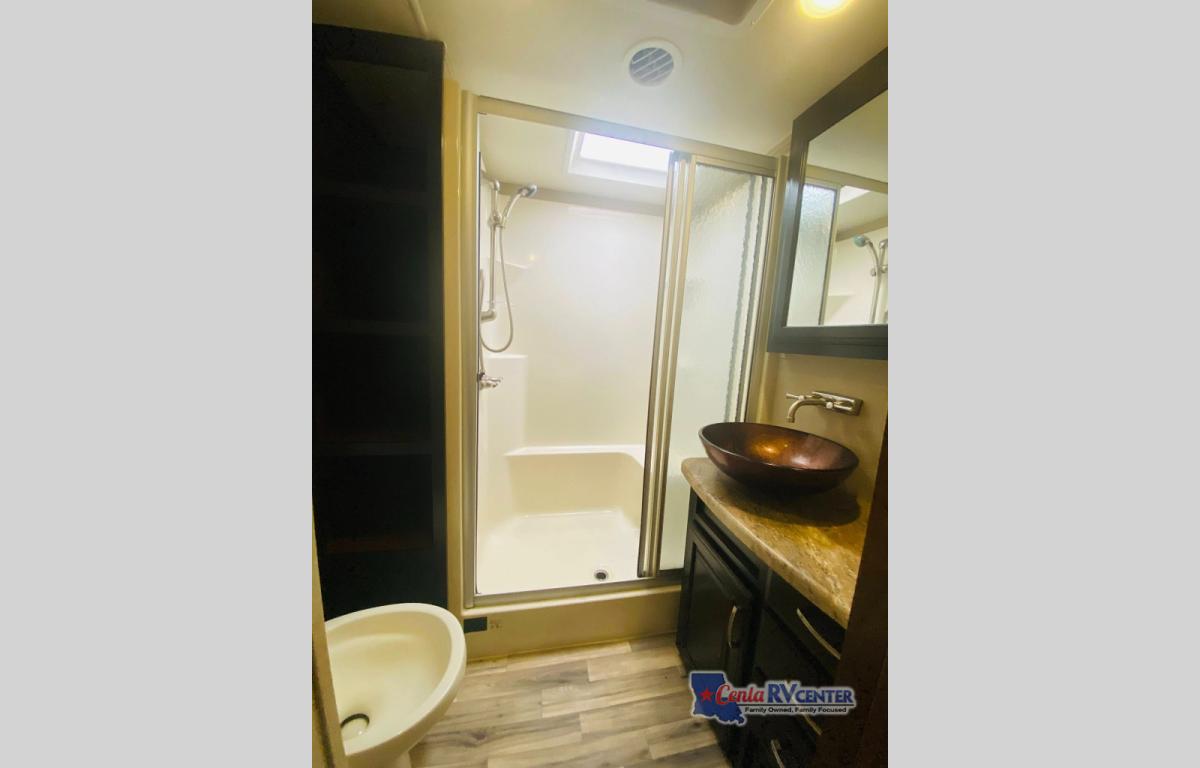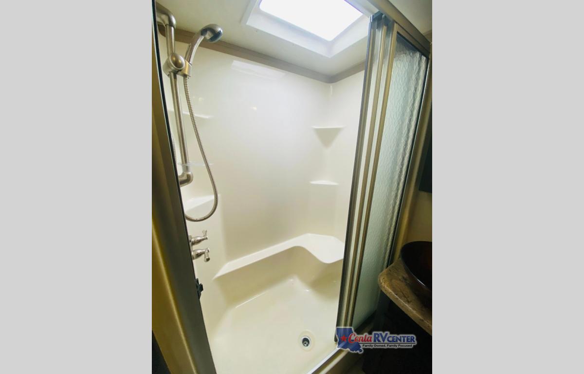Step up to a convenient side aisle bath with large shower including built-in seat, toilet, and vessel sink with medicine cabinet for storage. There is also a linen cabinet too.
